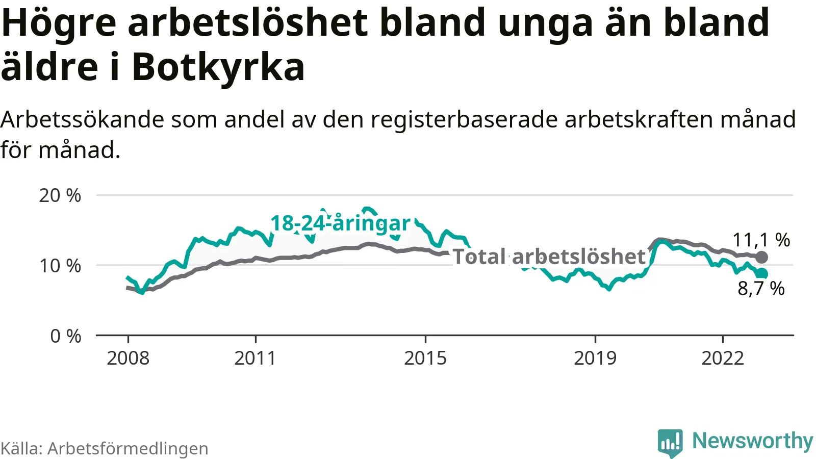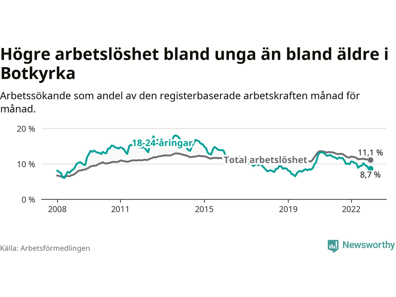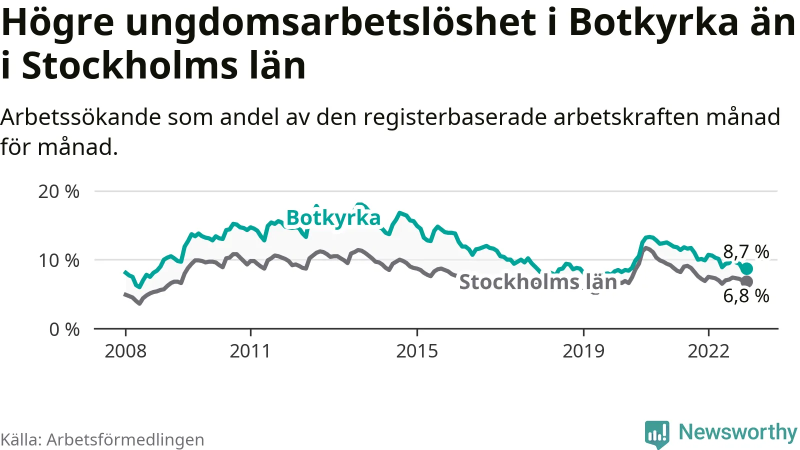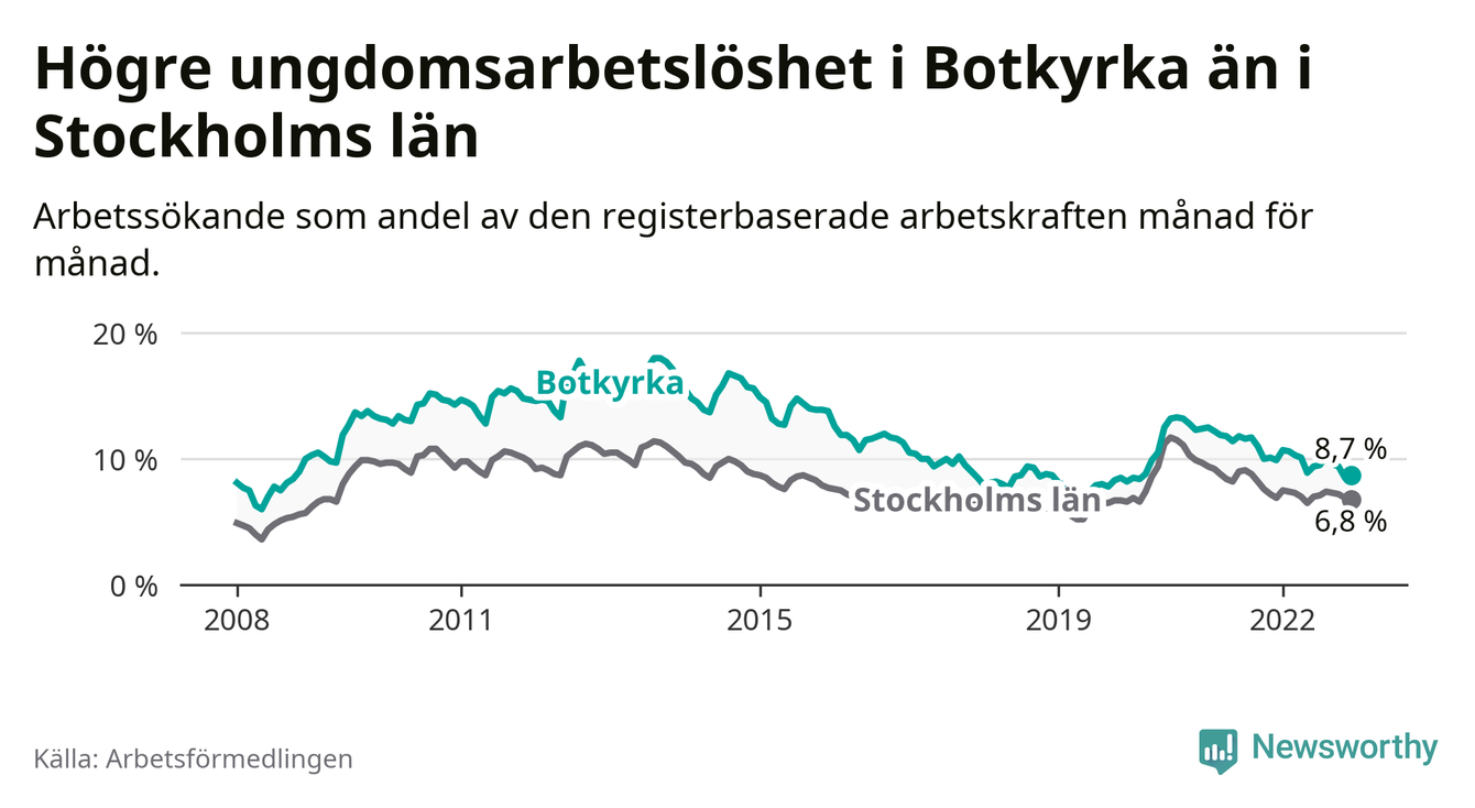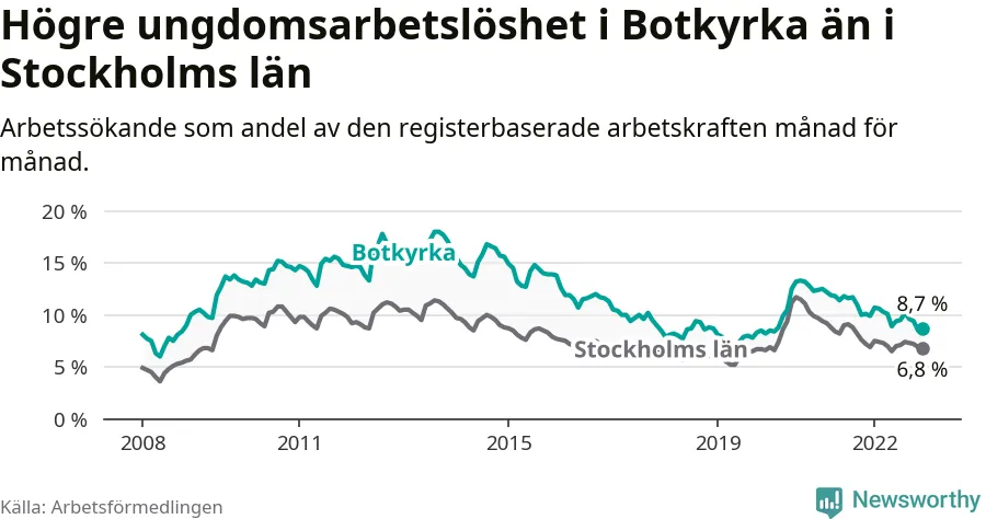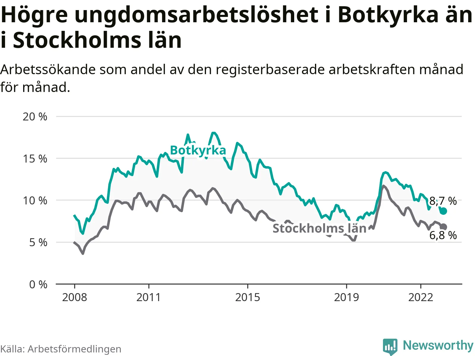 Precis som den totala arbetslösheten ligger ungdomsarbetslösheten i Botkyrka högre än i Stockholms län som helhet. Skillnaden mellan kommunen och länet är 1,9 procentenheter.