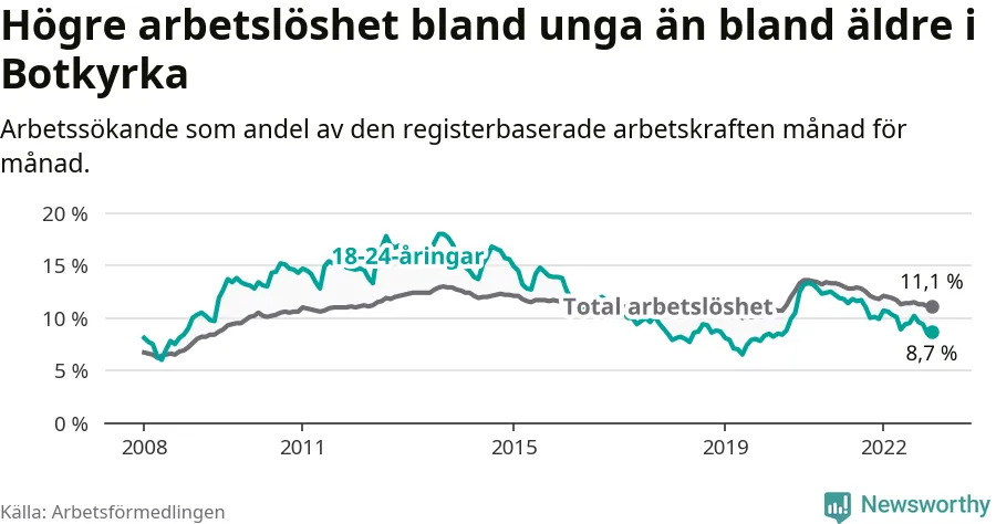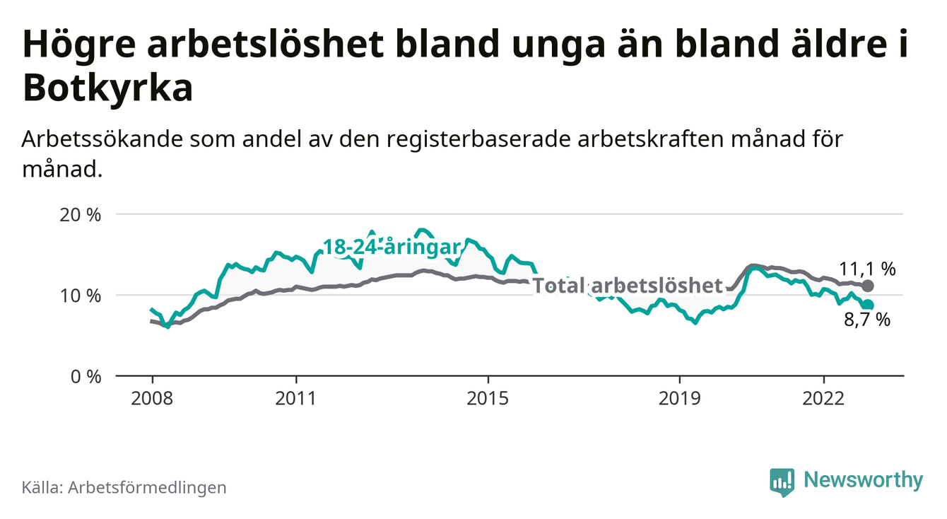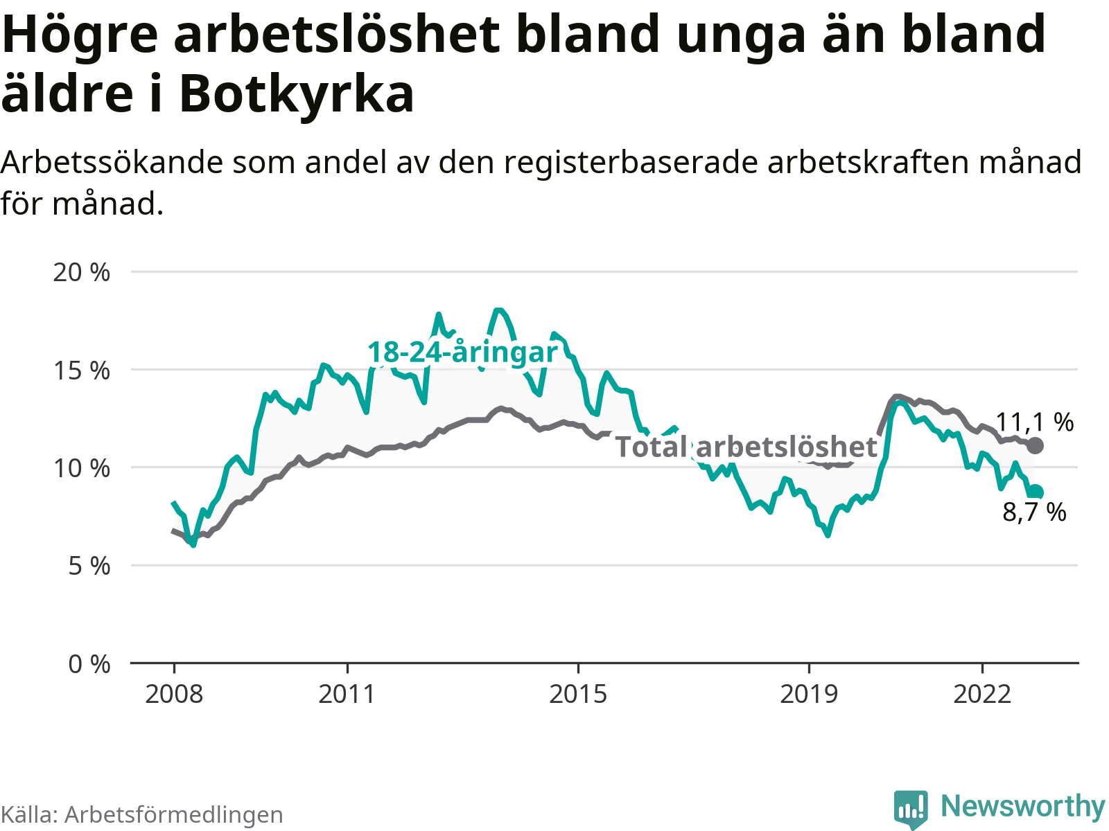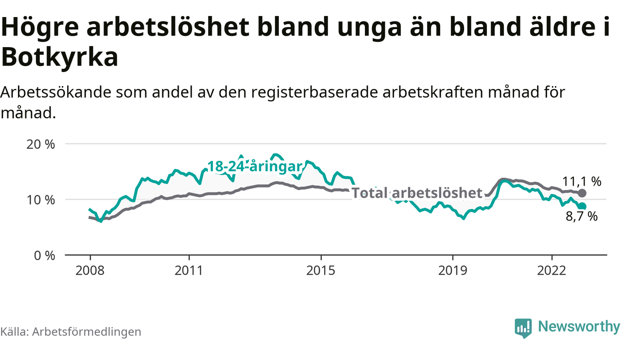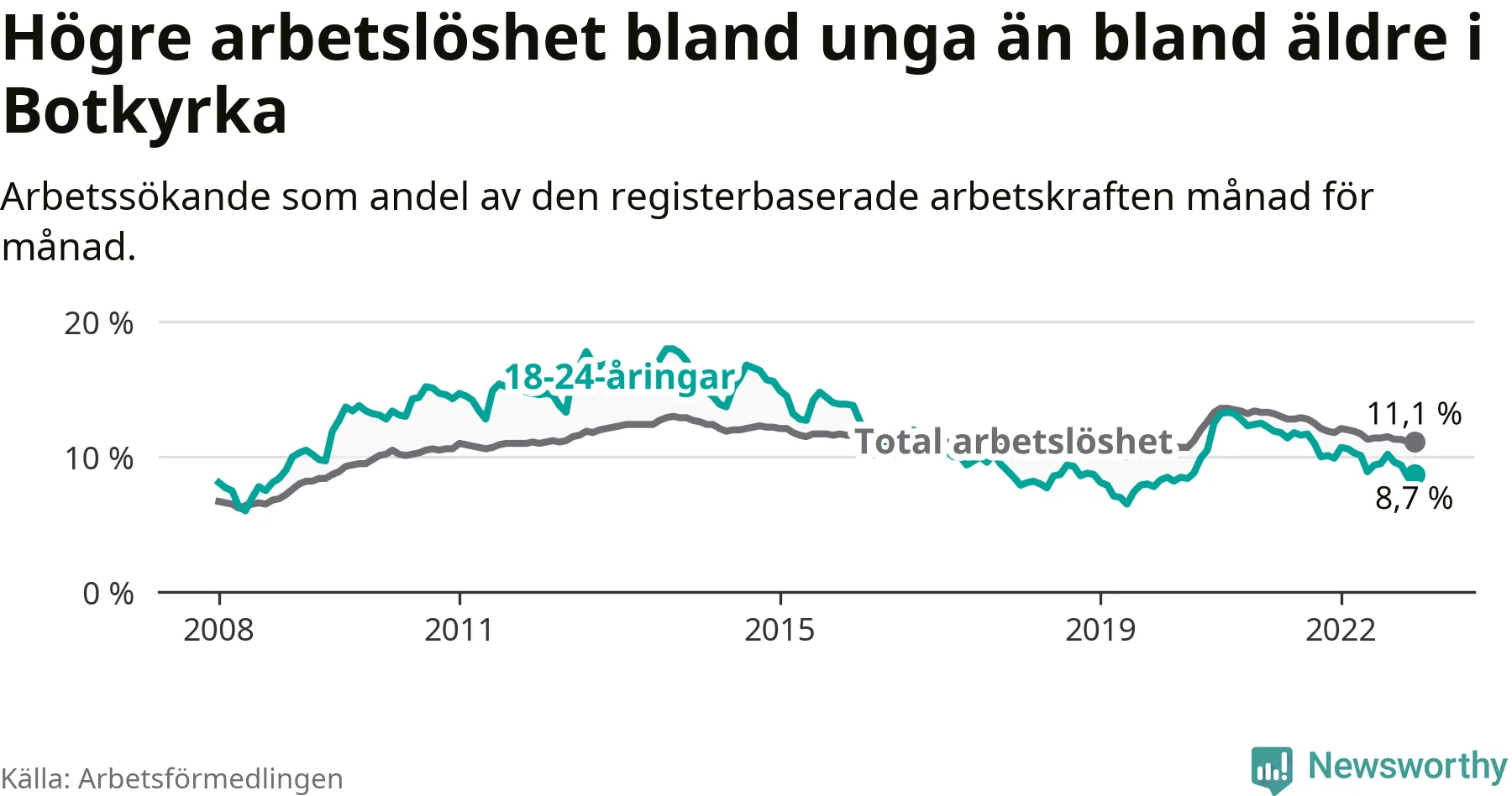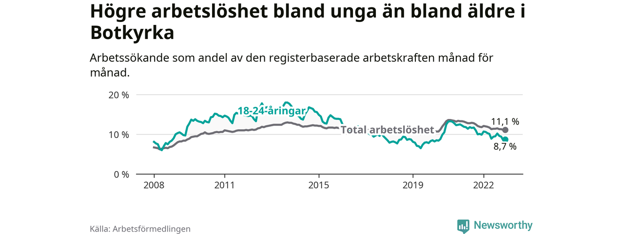Precis som den totala arbetslösheten ligger ungdomsarbetslösheten i Botkyrka högre än i Stockholms län som helhet. Skillnaden mellan kommunen och länet är 1,9 procentenheter.