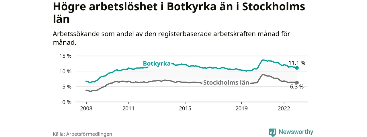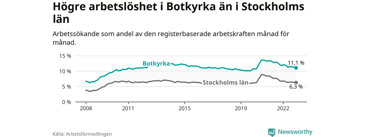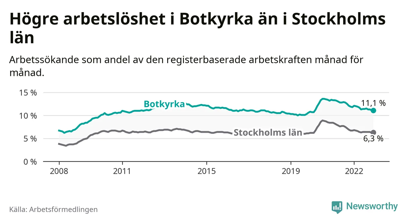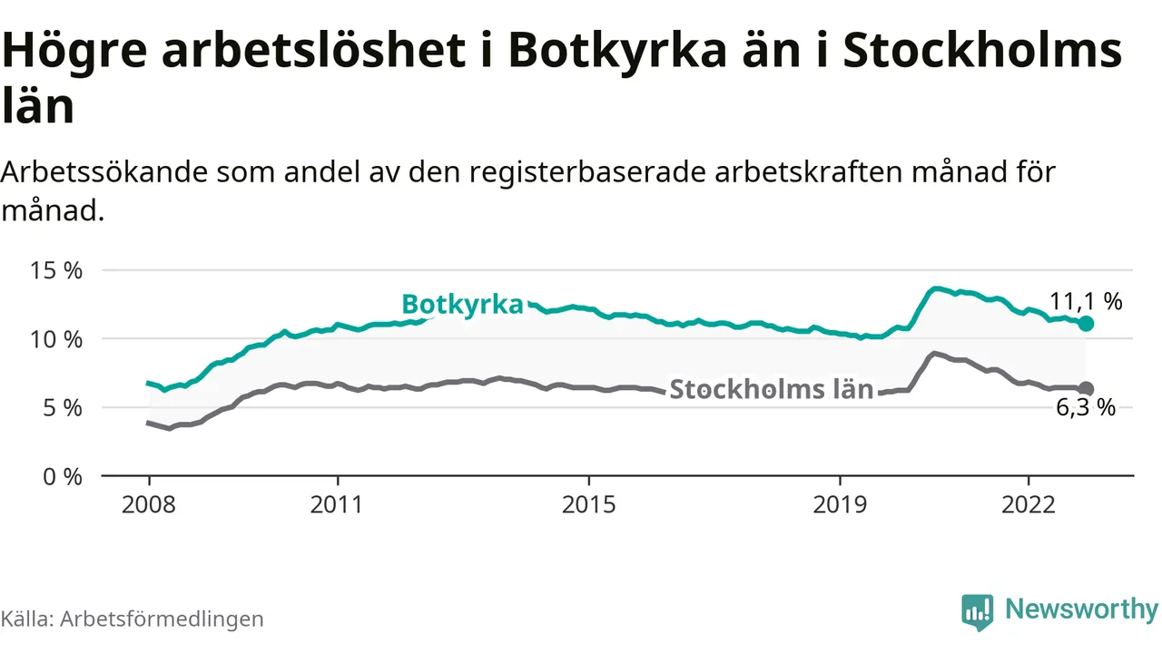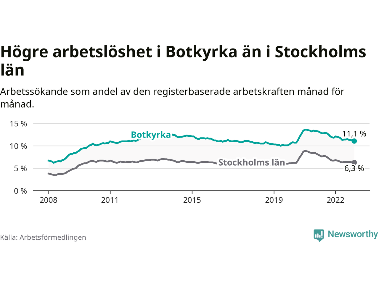 Perstorp är den kommun som har högst arbetslöshet just nu (13,2 procent) i landet som helhet, medan Kiruna, Kungsbacka, Tjörn och Öckerö har den lägsta (2,6 procent). Botkyrkas arbetslöshet sticker ut som den femte högsta i hela landet.