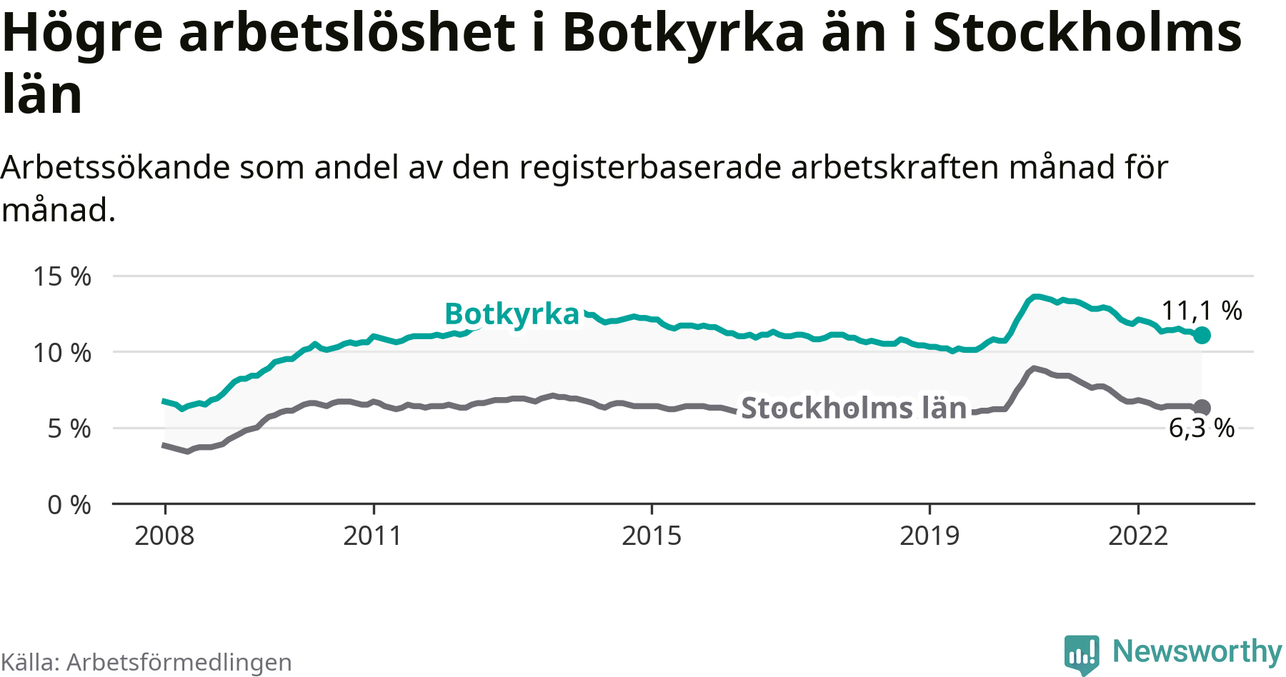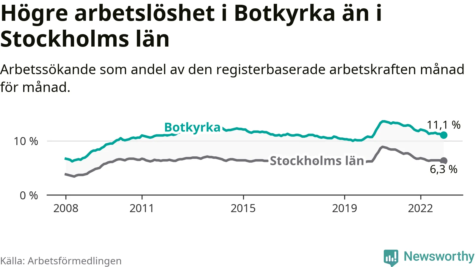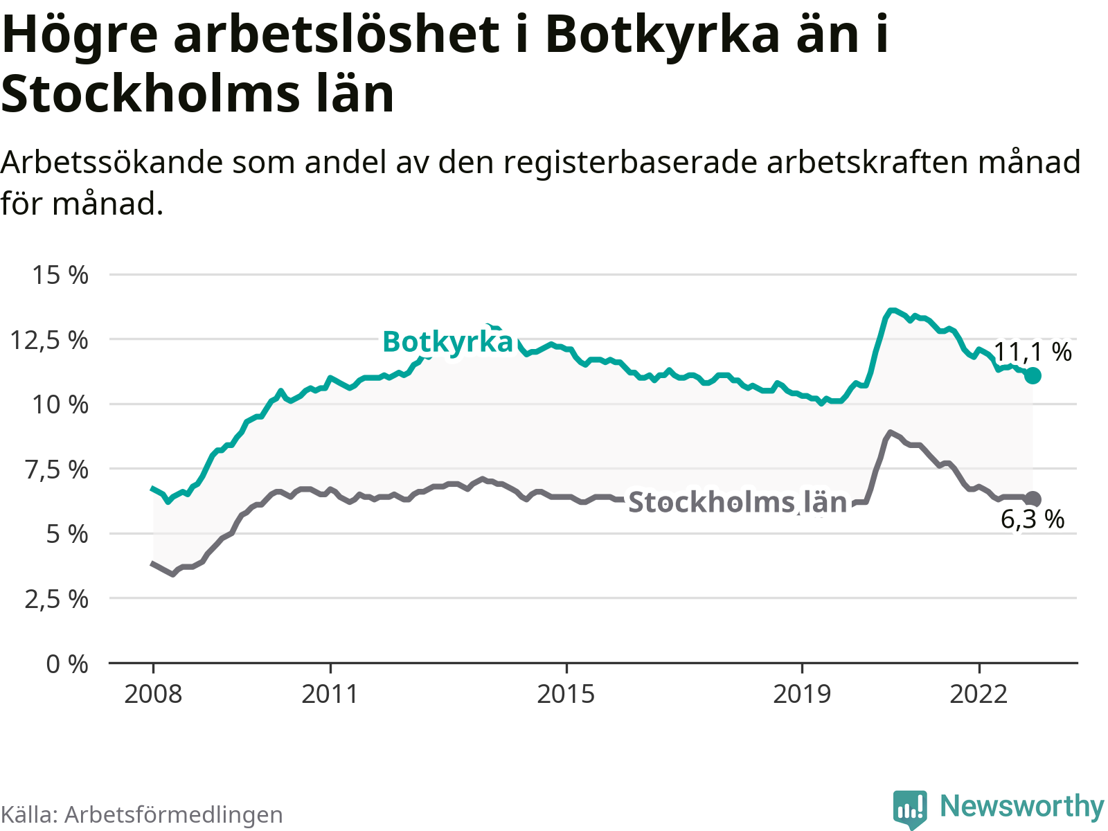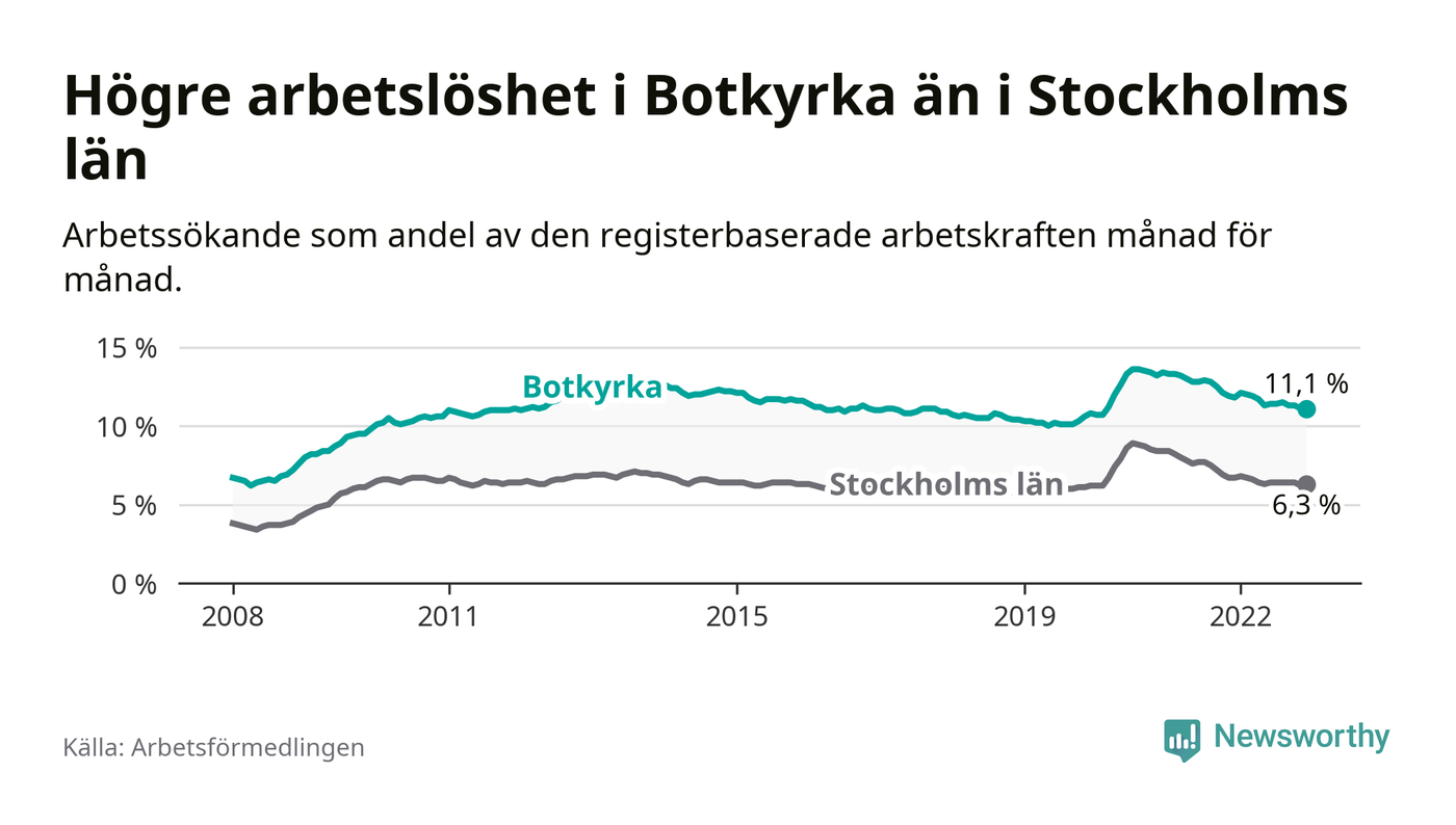 Perstorp är den kommun som har högst arbetslöshet just nu (13,2 procent) i landet som helhet, medan Kiruna, Kungsbacka, Tjörn och Öckerö har den lägsta (2,6 procent). Botkyrkas arbetslöshet sticker ut som den femte högsta i hela landet.