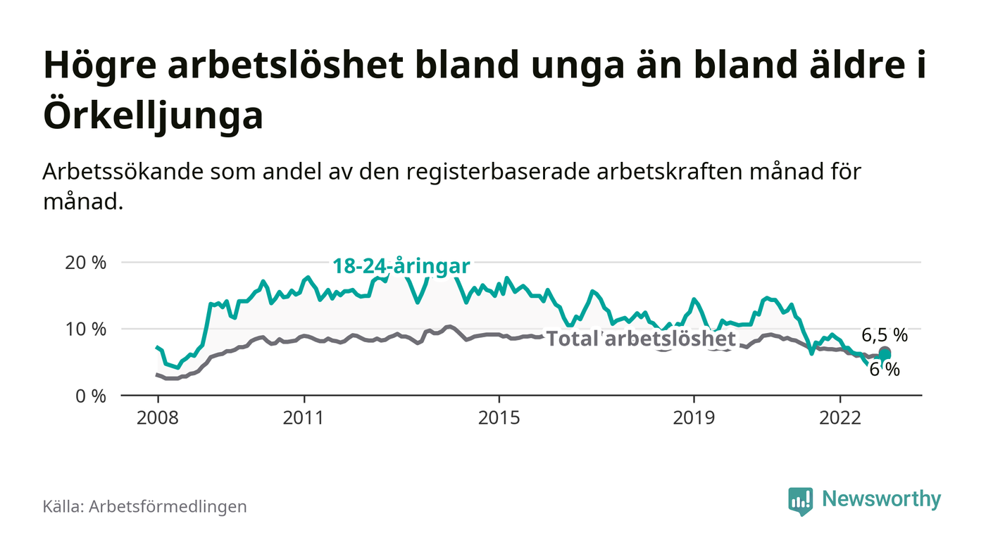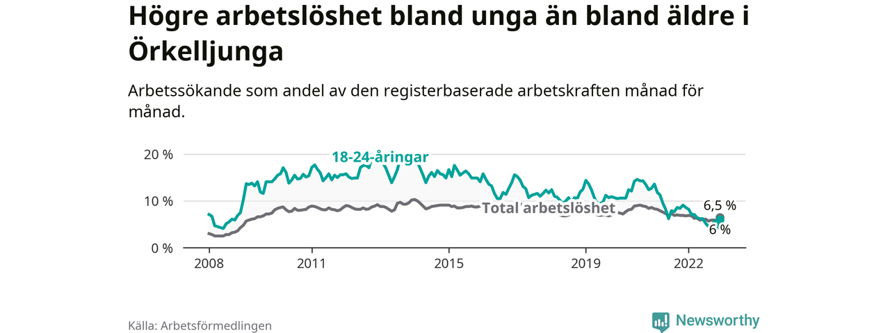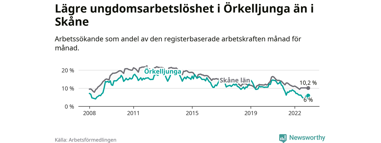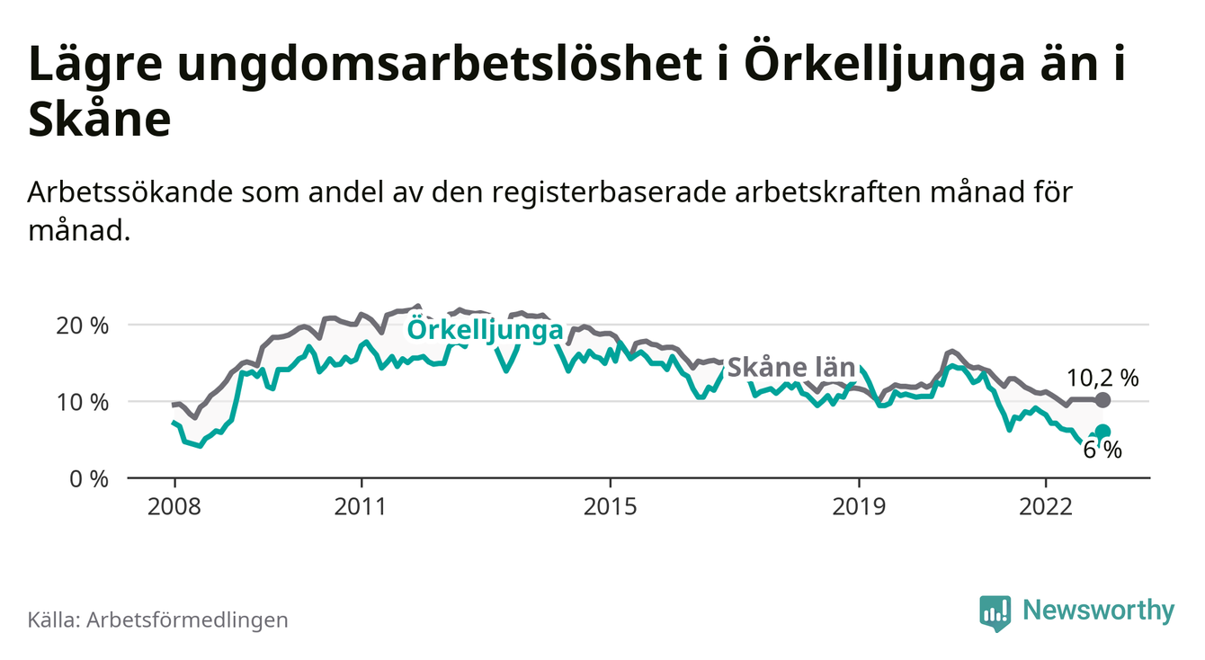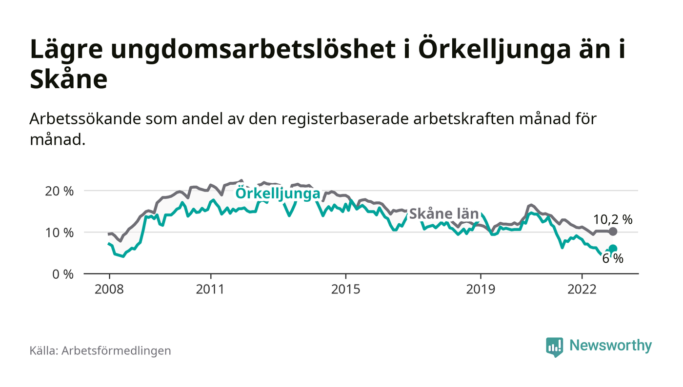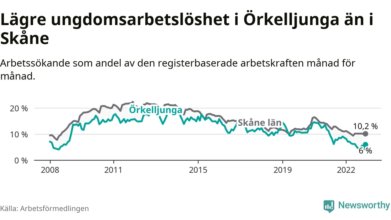 Precis som den totala arbetslösheten ligger ungdomsarbetslösheten i Örkelljunga lägre än i Skåne som helhet. Skillnaden mellan kommunen och länet är 4,2 procentenheter.