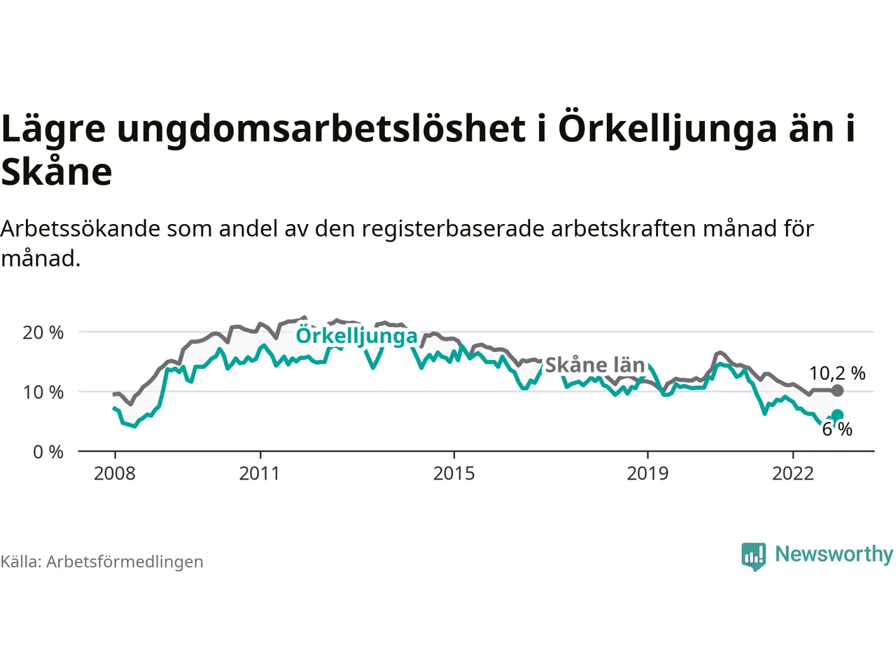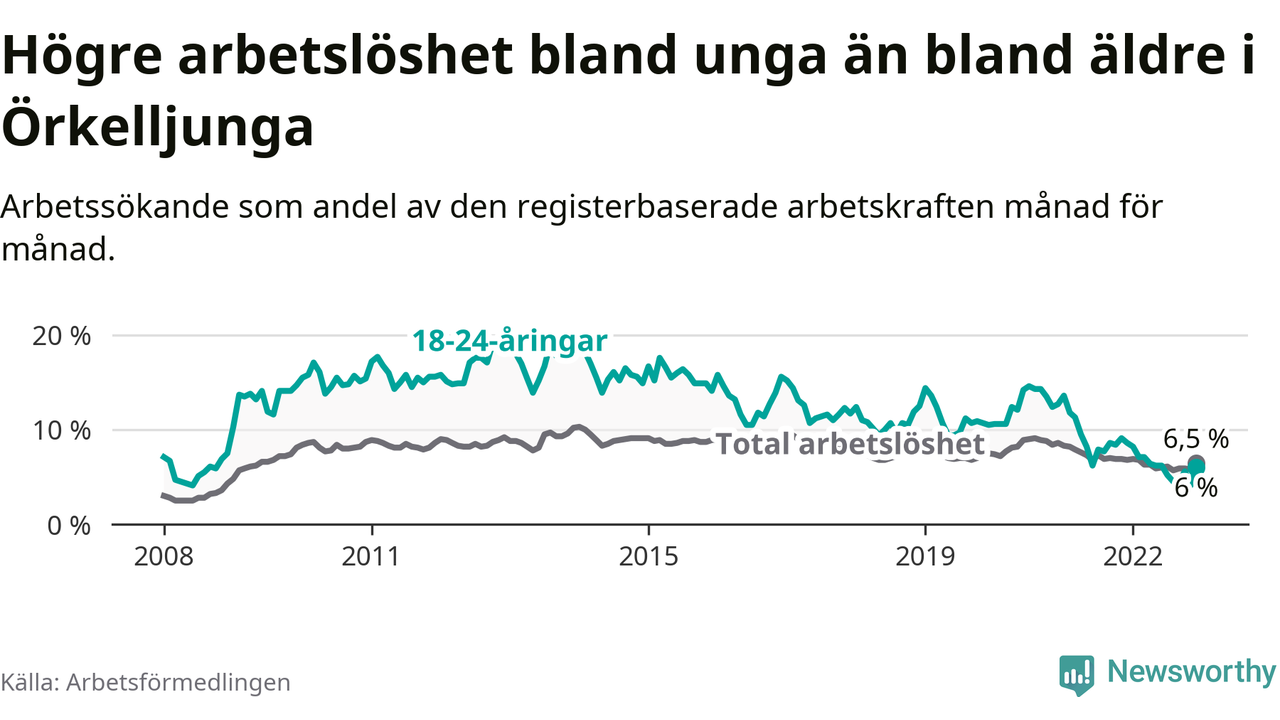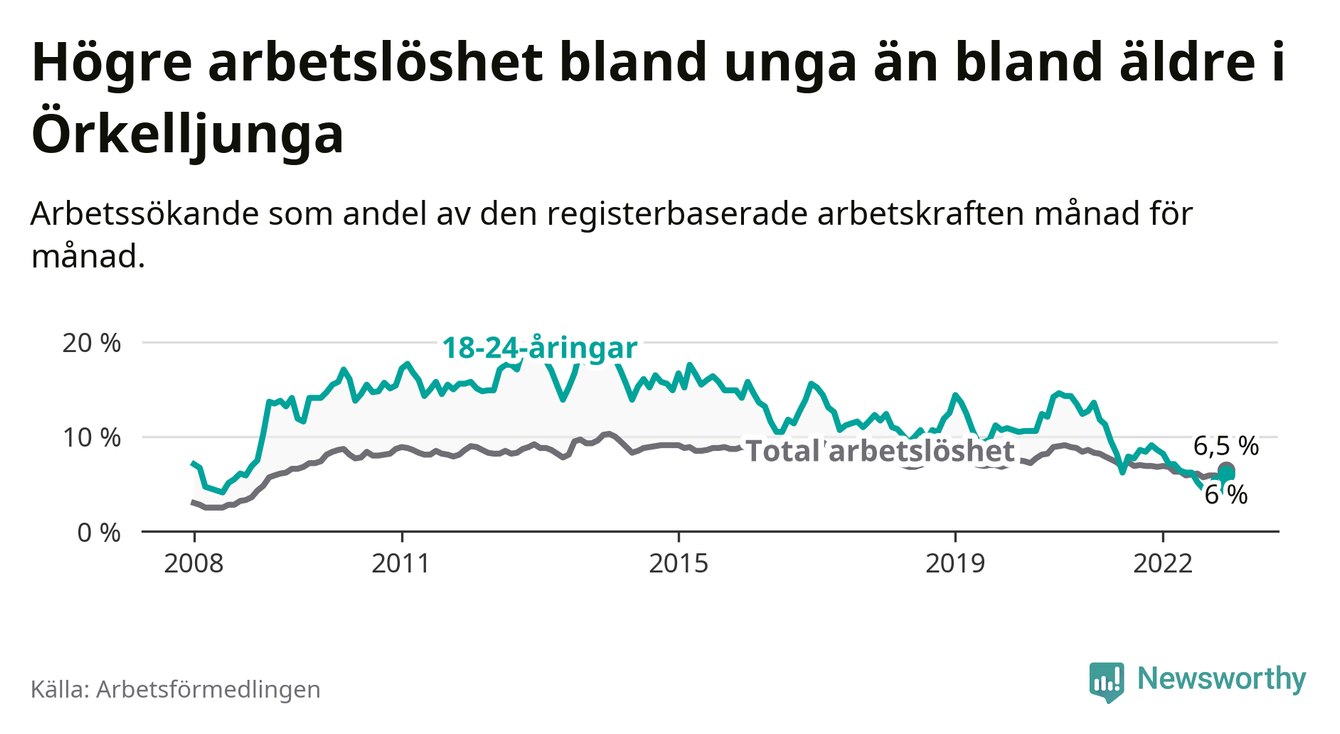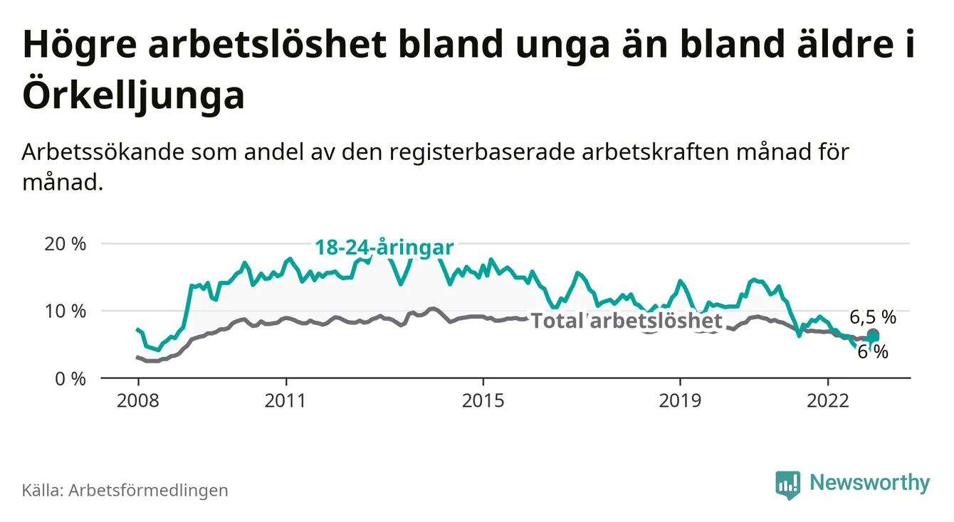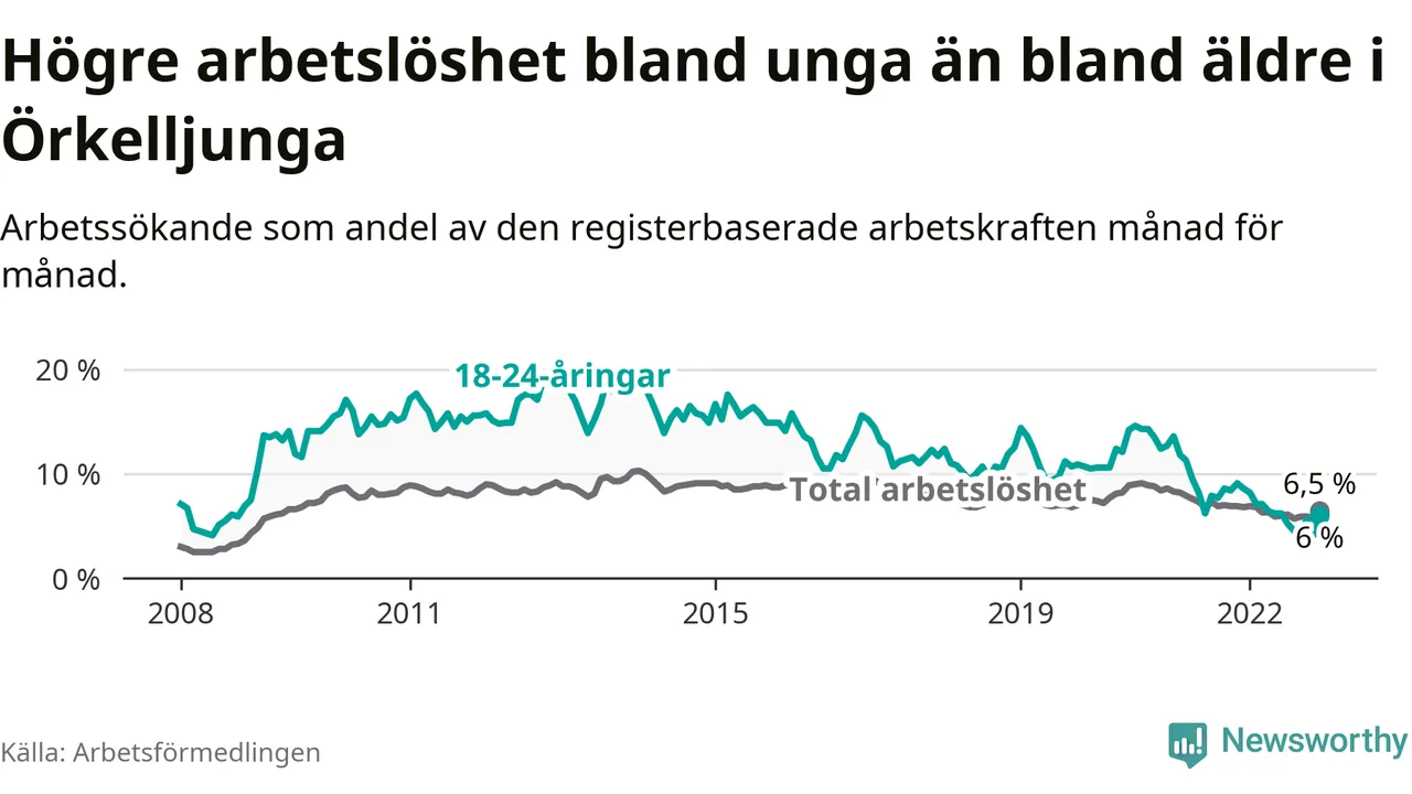 Precis som den totala arbetslösheten ligger ungdomsarbetslösheten i Örkelljunga lägre än i Skåne som helhet. Skillnaden mellan kommunen och länet är 4,2 procentenheter.