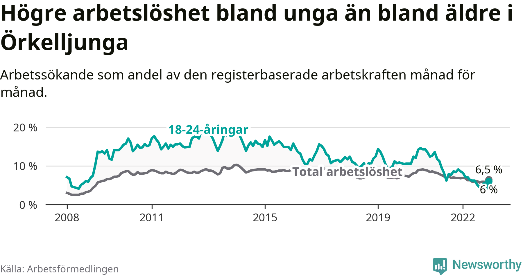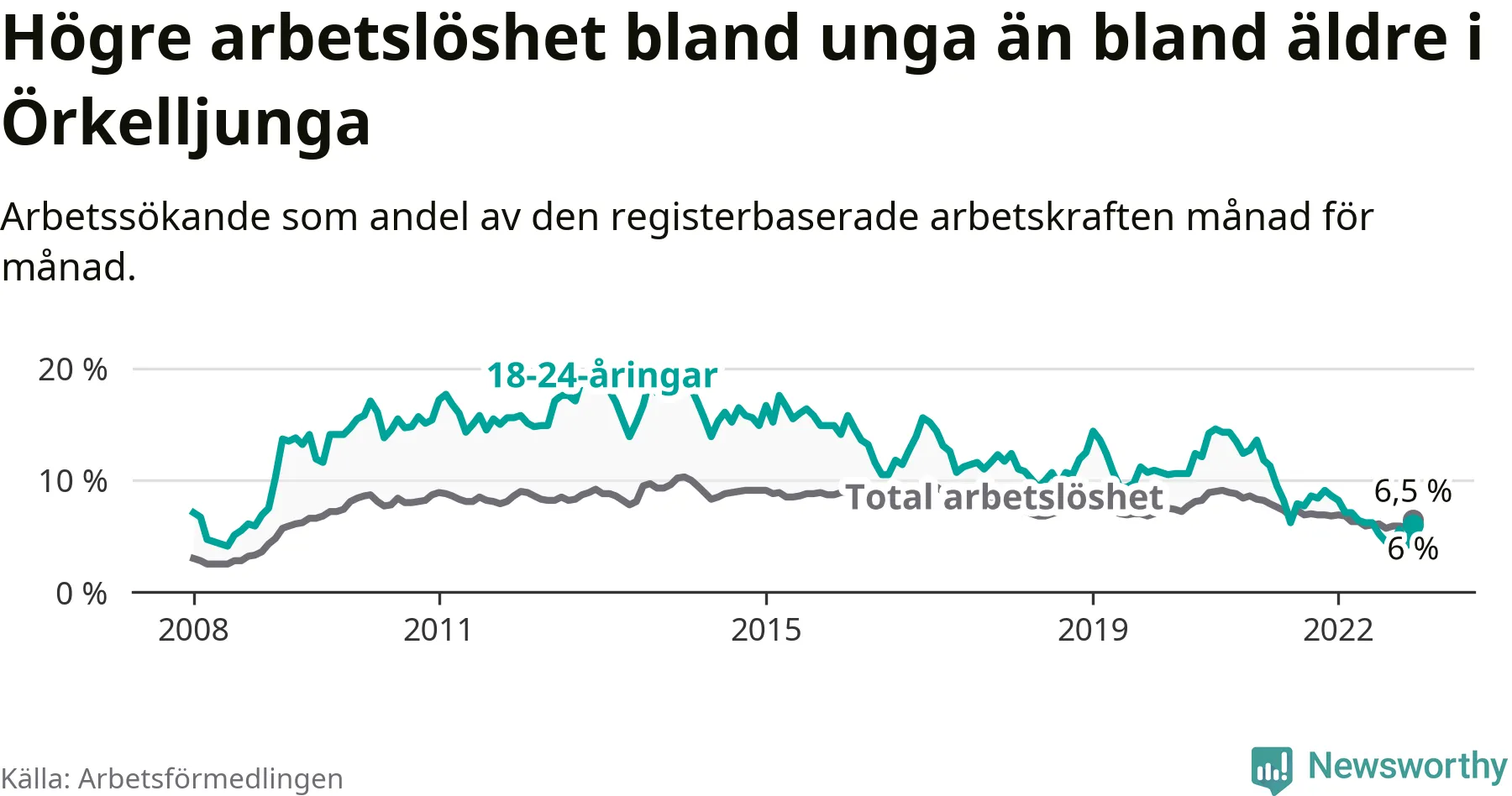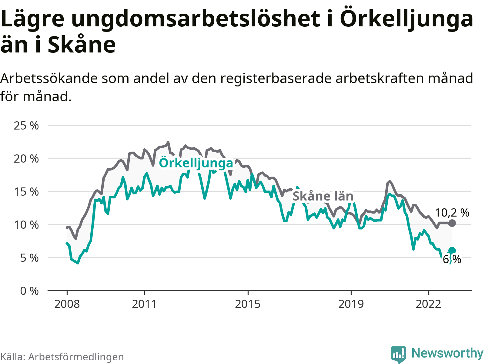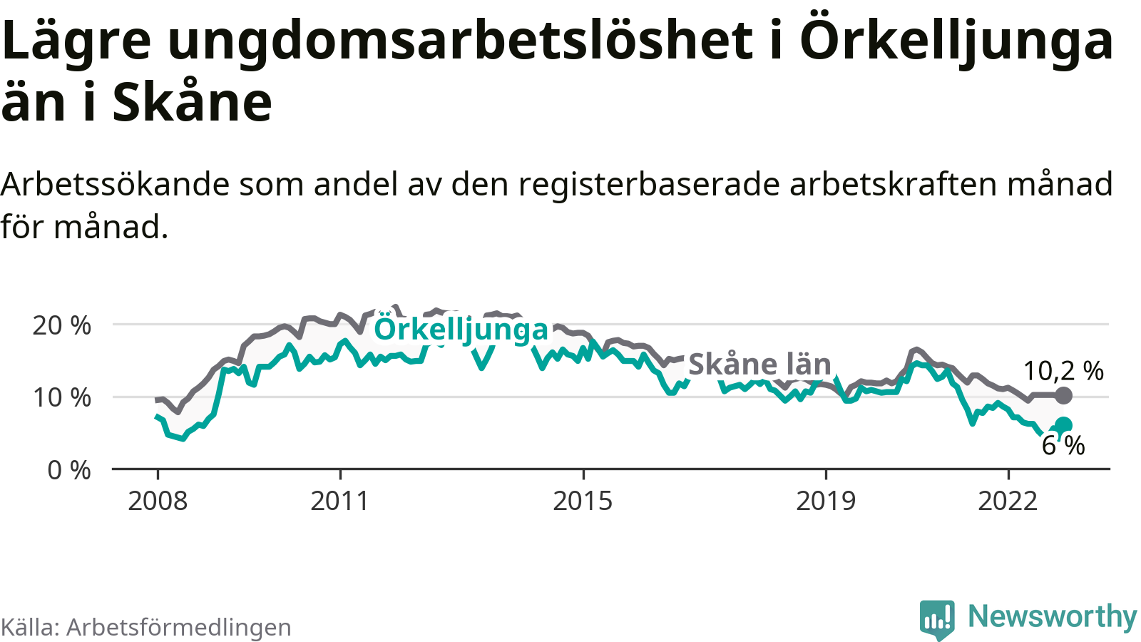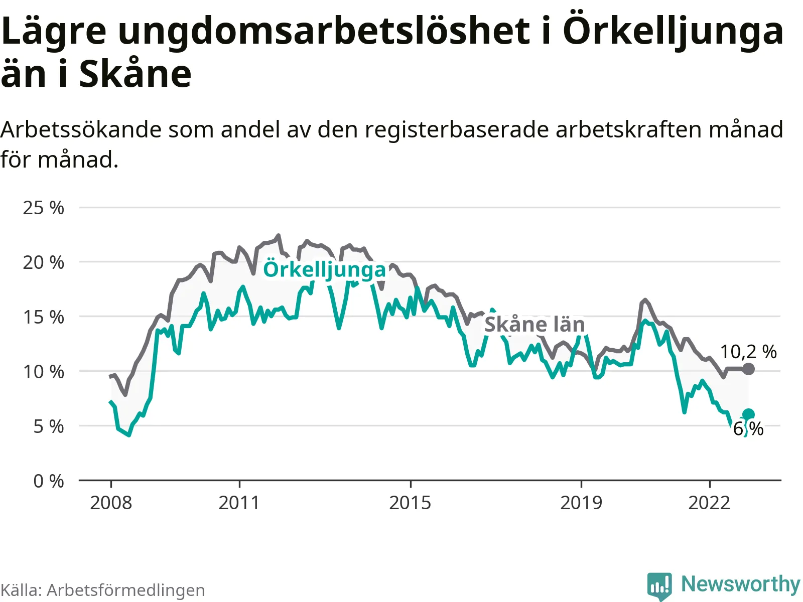 Precis som den totala arbetslösheten ligger ungdomsarbetslösheten i Örkelljunga lägre än i Skåne som helhet. Skillnaden mellan kommunen och länet är 4,2 procentenheter.