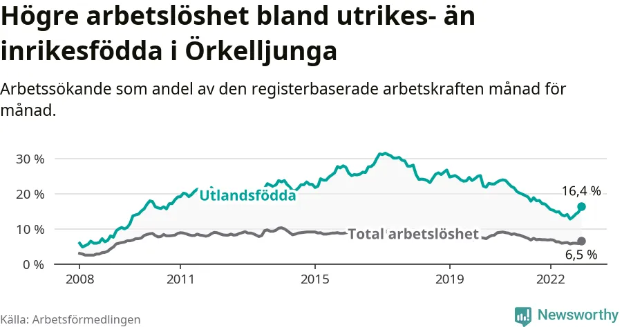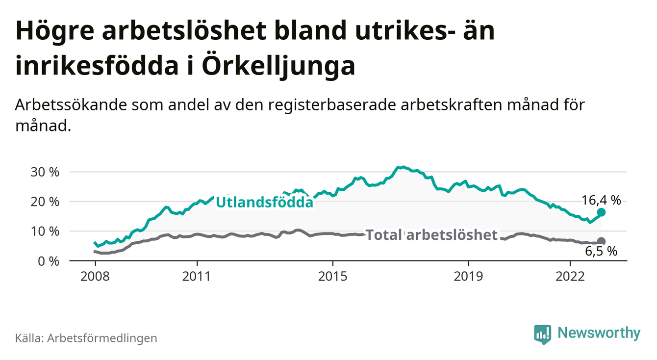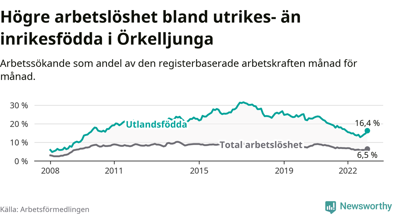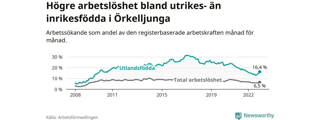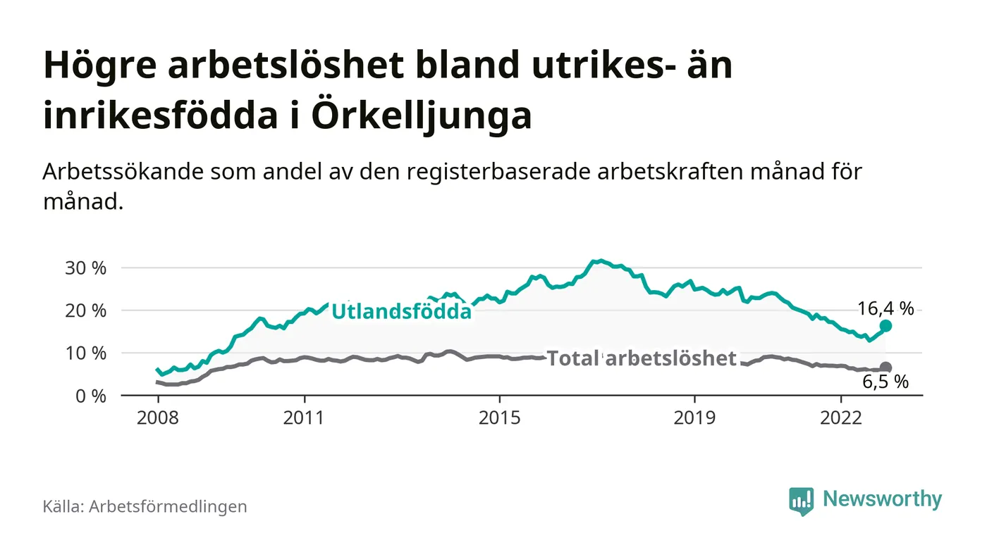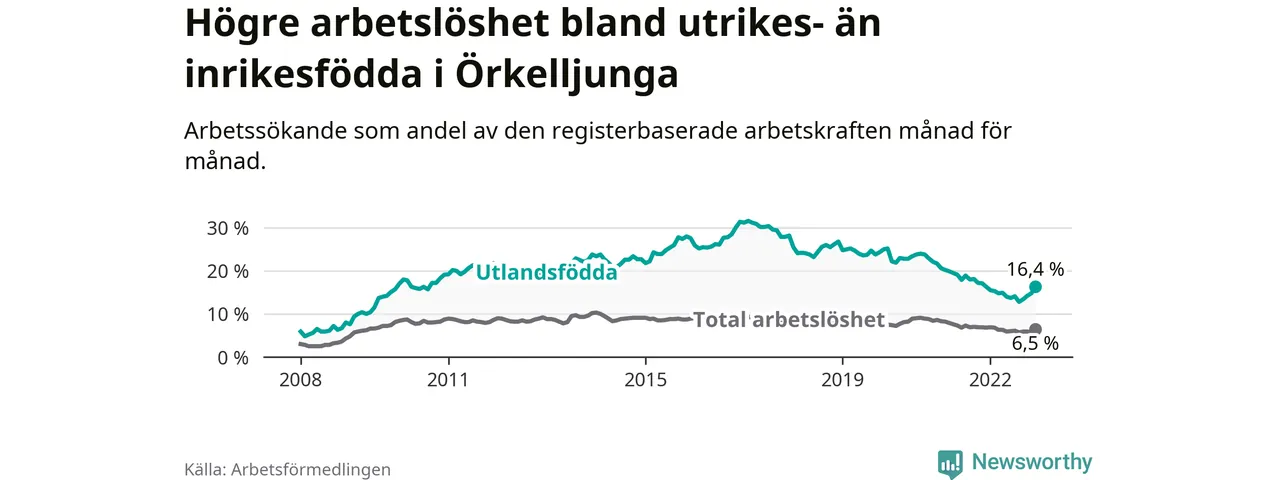 Arbetslösheten bland utlandsfödda var 16,4 procent i Örkelljunga under december månad, motsvarande 154 av 939 personer. Det är 0,1 procentenheter fler än vid samma tidpunkt i fjol (+8 om man räknar personer). Den senaste månadens uppgång innebär ett trendbrott. Under de 26 föregående månaderna hade arbetslösheten bland utlandsfödda varit lägre än motsvarande tidpunkt året innan.