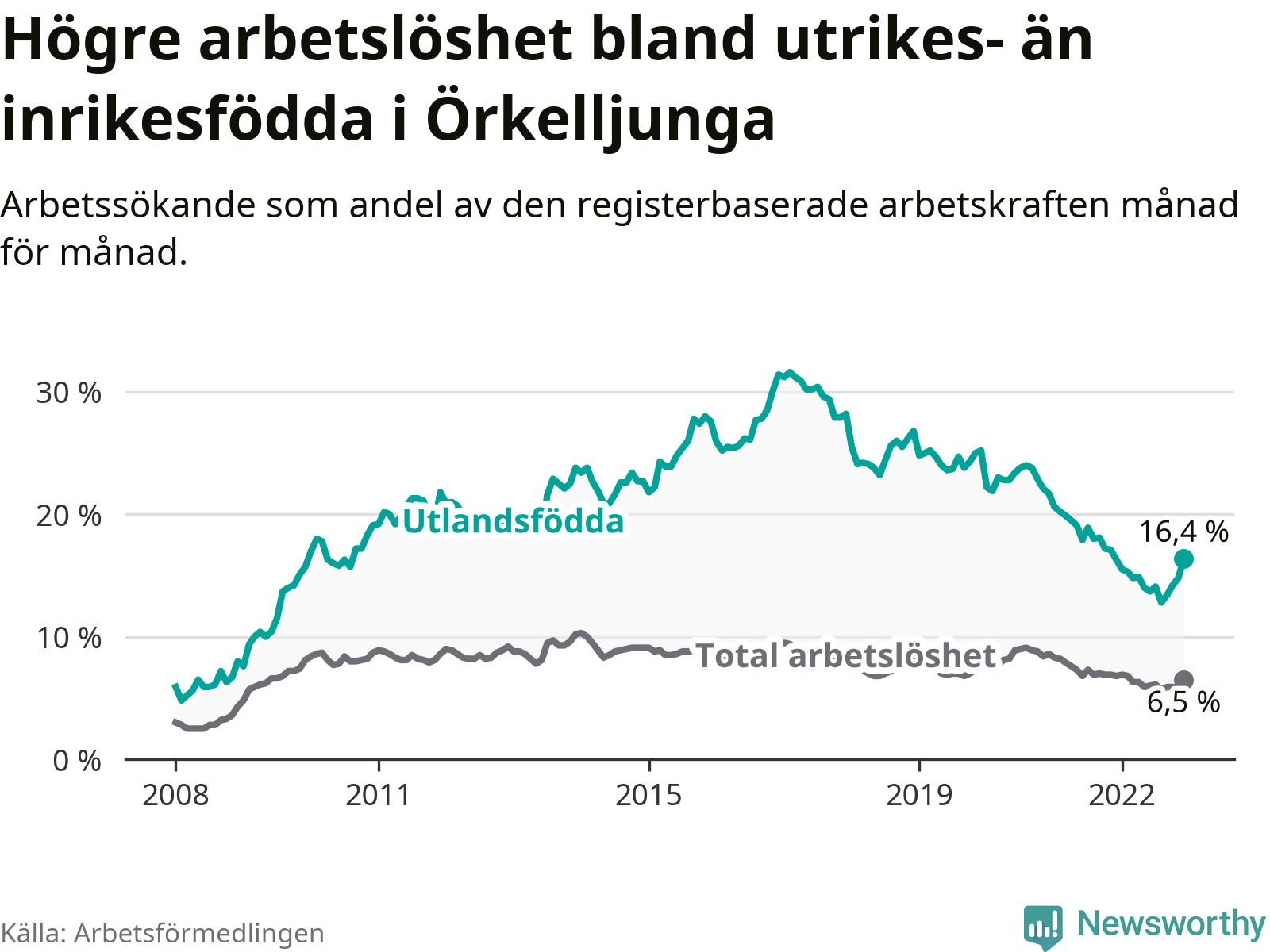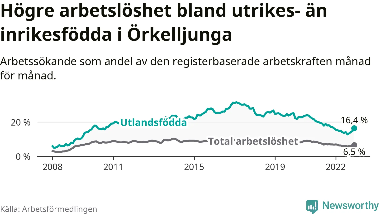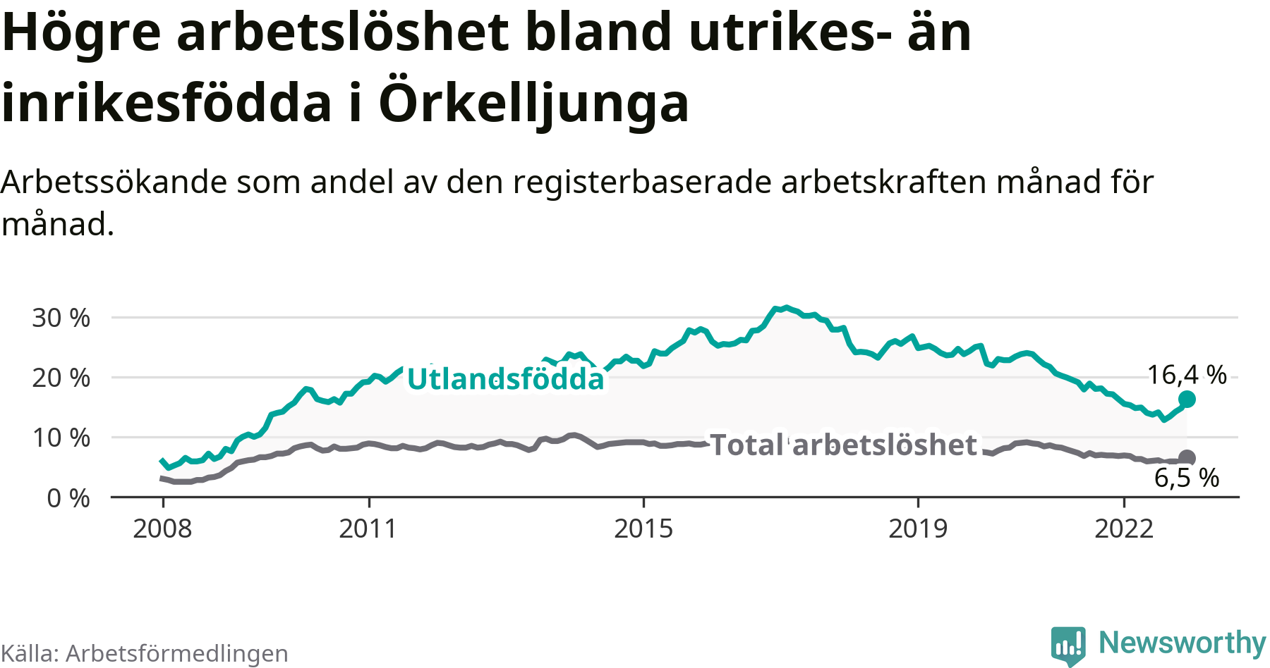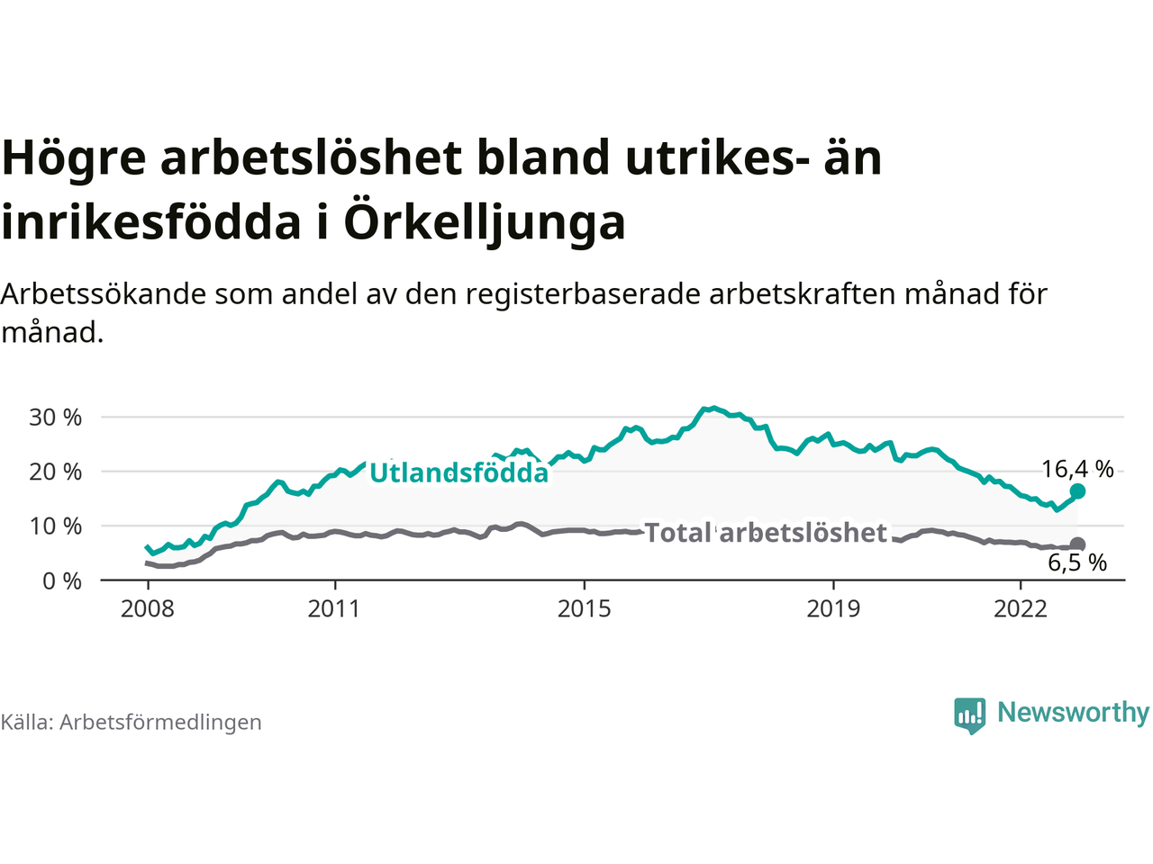 Arbetslösheten bland utlandsfödda var 16,4 procent i Örkelljunga under december månad, motsvarande 154 av 939 personer. Det är 0,1 procentenheter fler än vid samma tidpunkt i fjol (+8 om man räknar personer). Den senaste månadens uppgång innebär ett trendbrott. Under de 26 föregående månaderna hade arbetslösheten bland utlandsfödda varit lägre än motsvarande tidpunkt året innan.