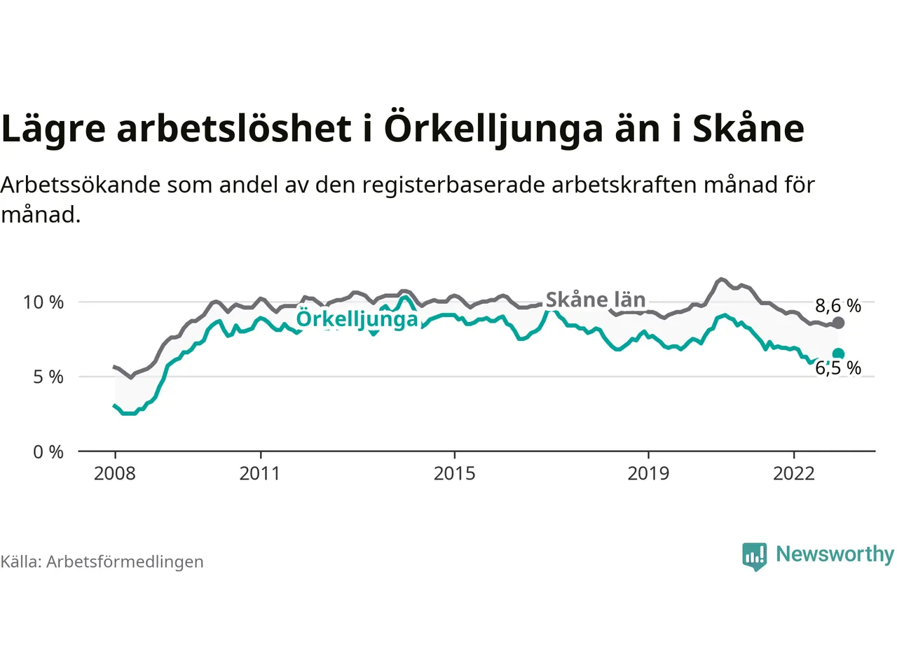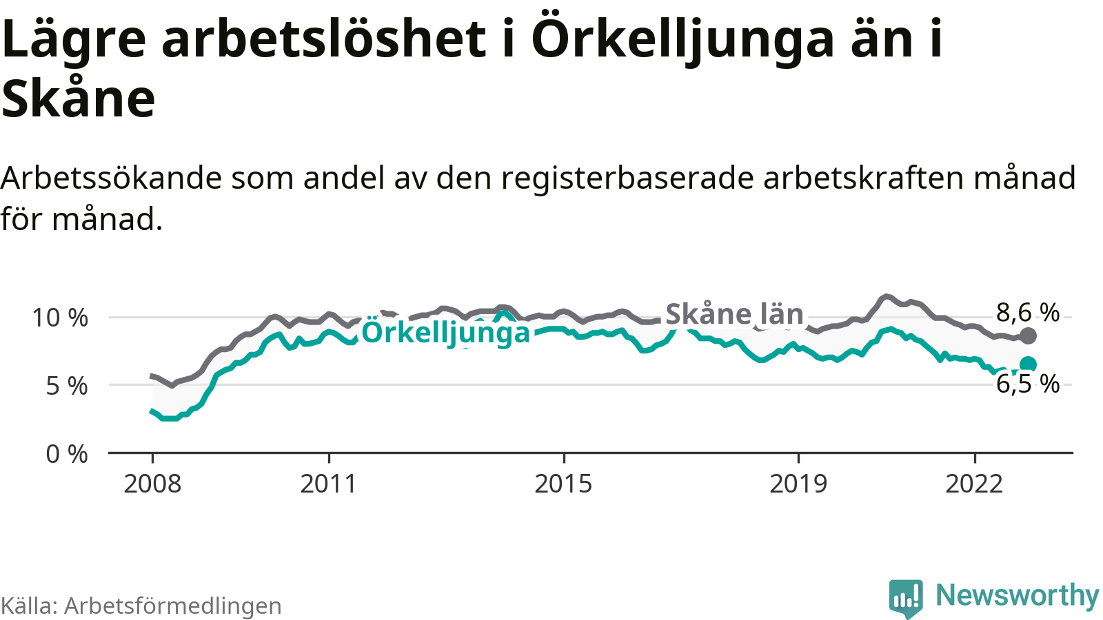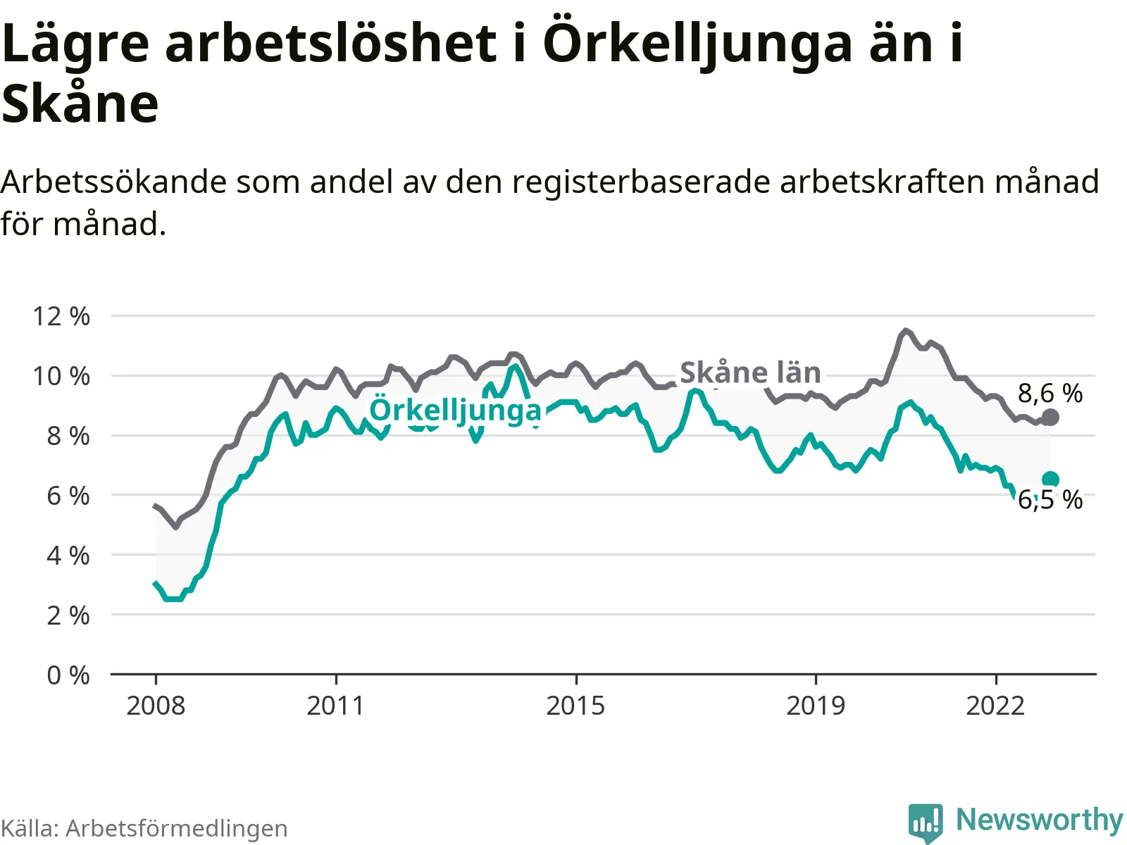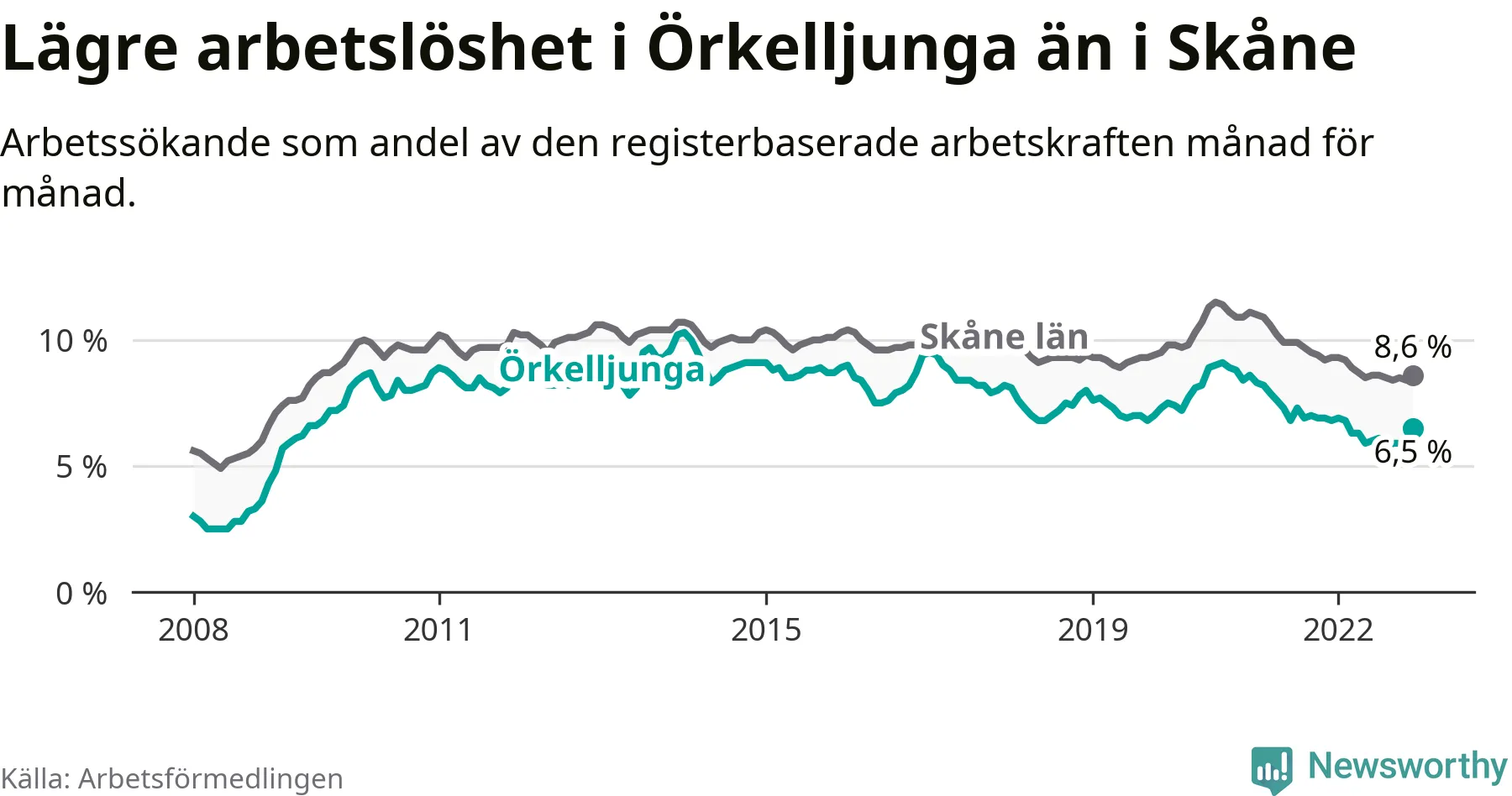 Under december månad rapporterade Örkelljunga kommun en total arbetslöshet på 6,5 procent. Det är en minskning jämfört med samma tidpunkt i fjol (−0,3 procentenheter). Även i Skåne län sjunker arbetslösheten .