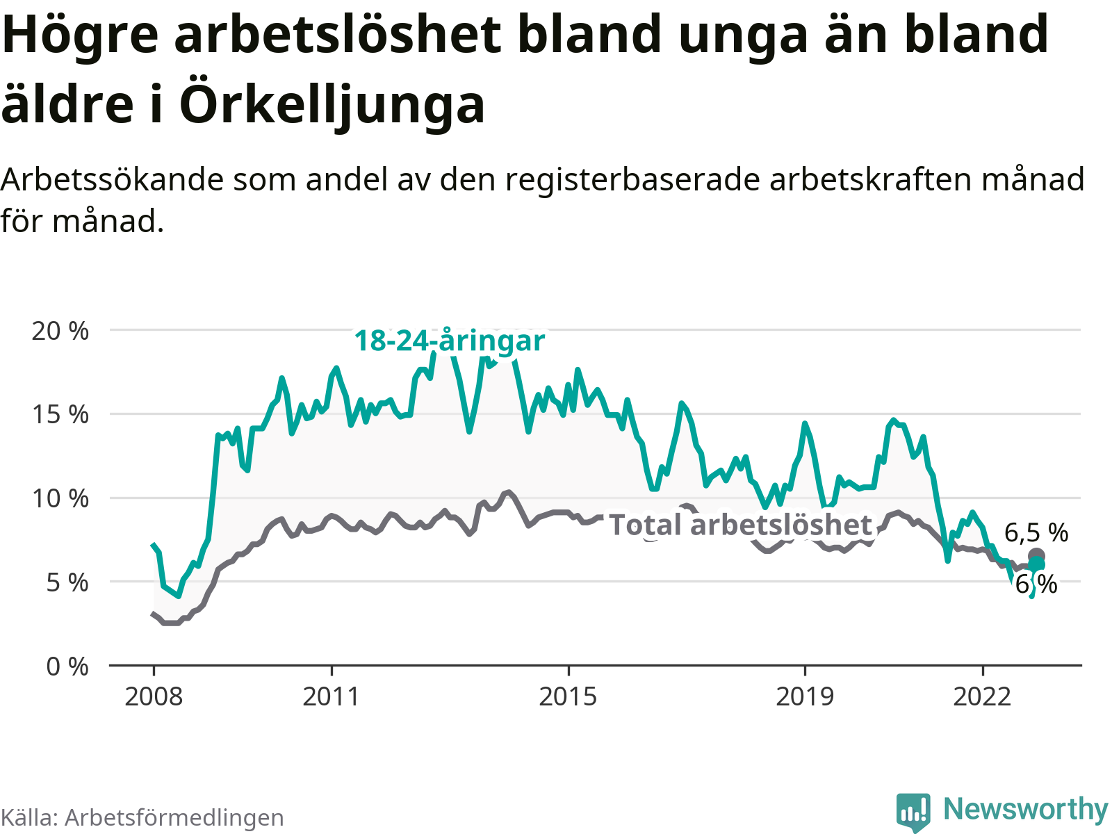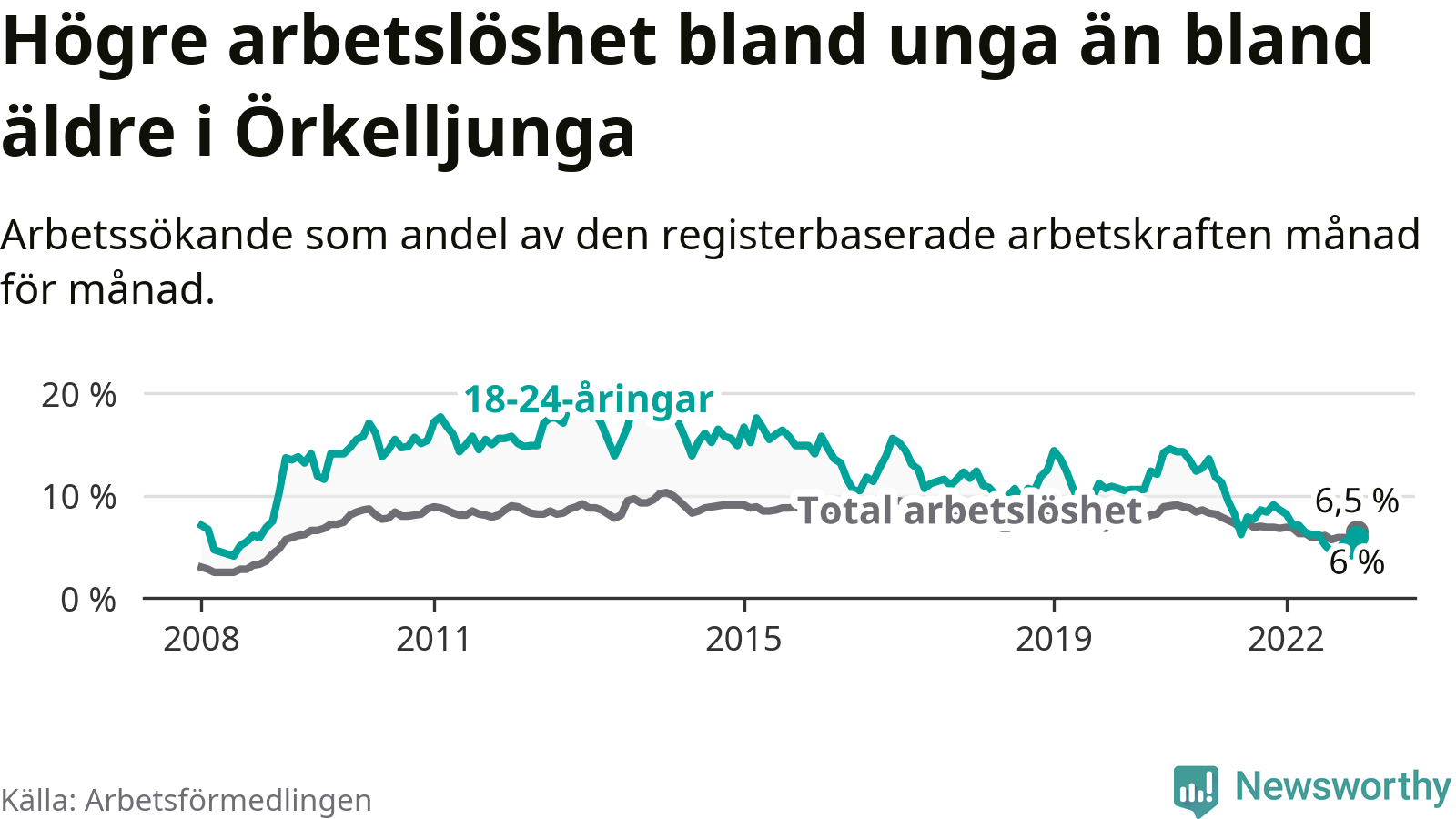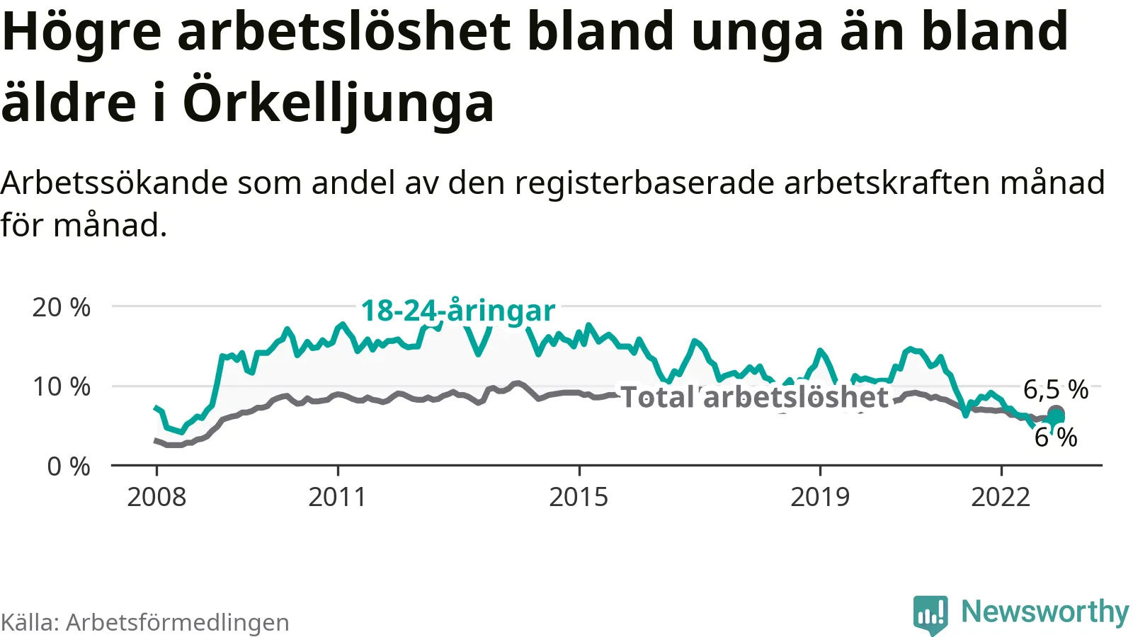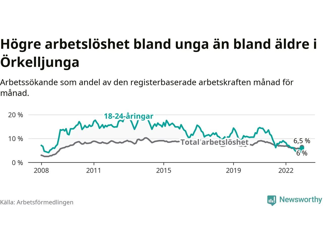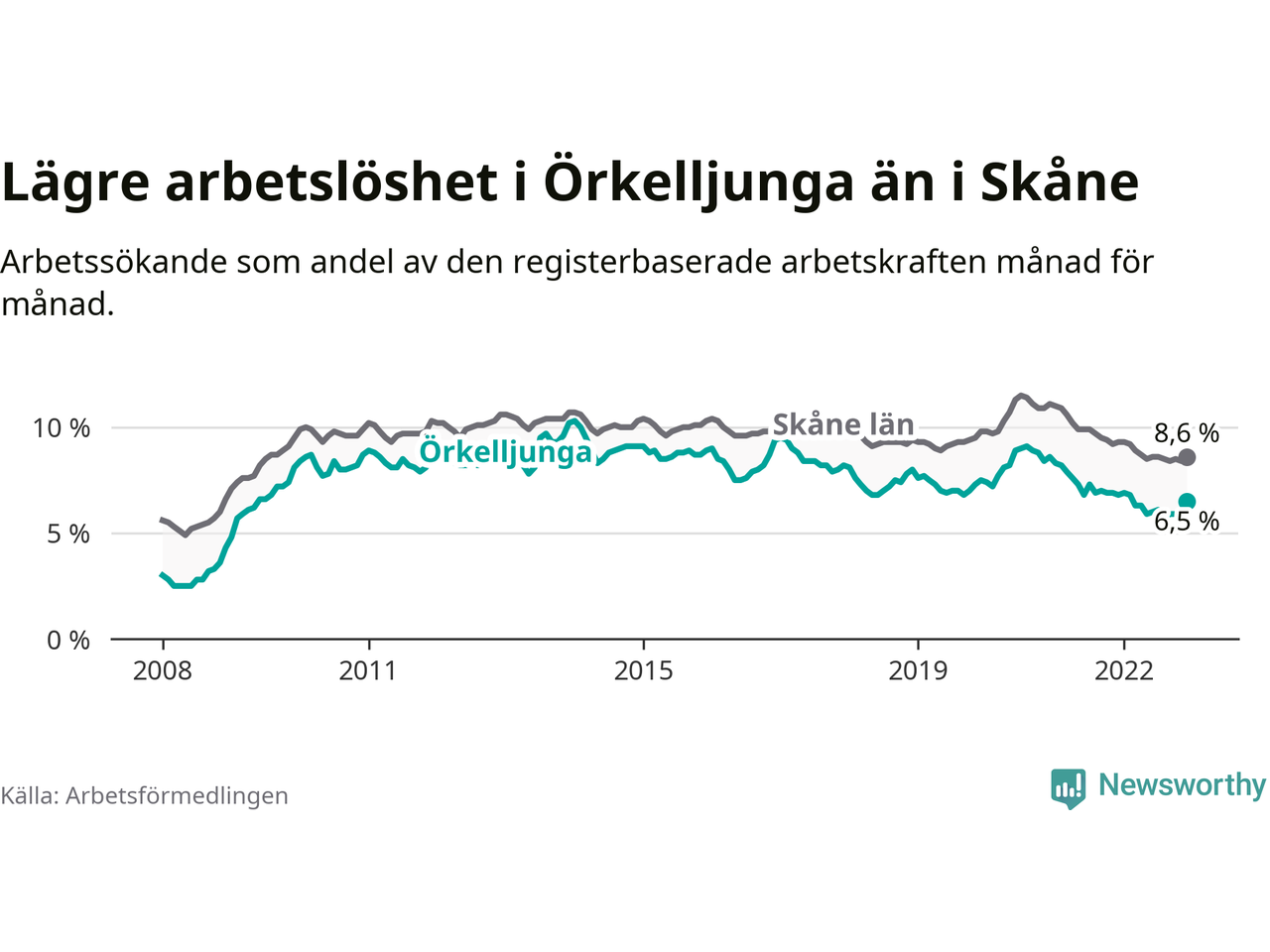 Under december månad rapporterade Örkelljunga kommun en total arbetslöshet på 6,5 procent. Det är en minskning jämfört med samma tidpunkt i fjol (−0,3 procentenheter). Även i Skåne län sjunker arbetslösheten .