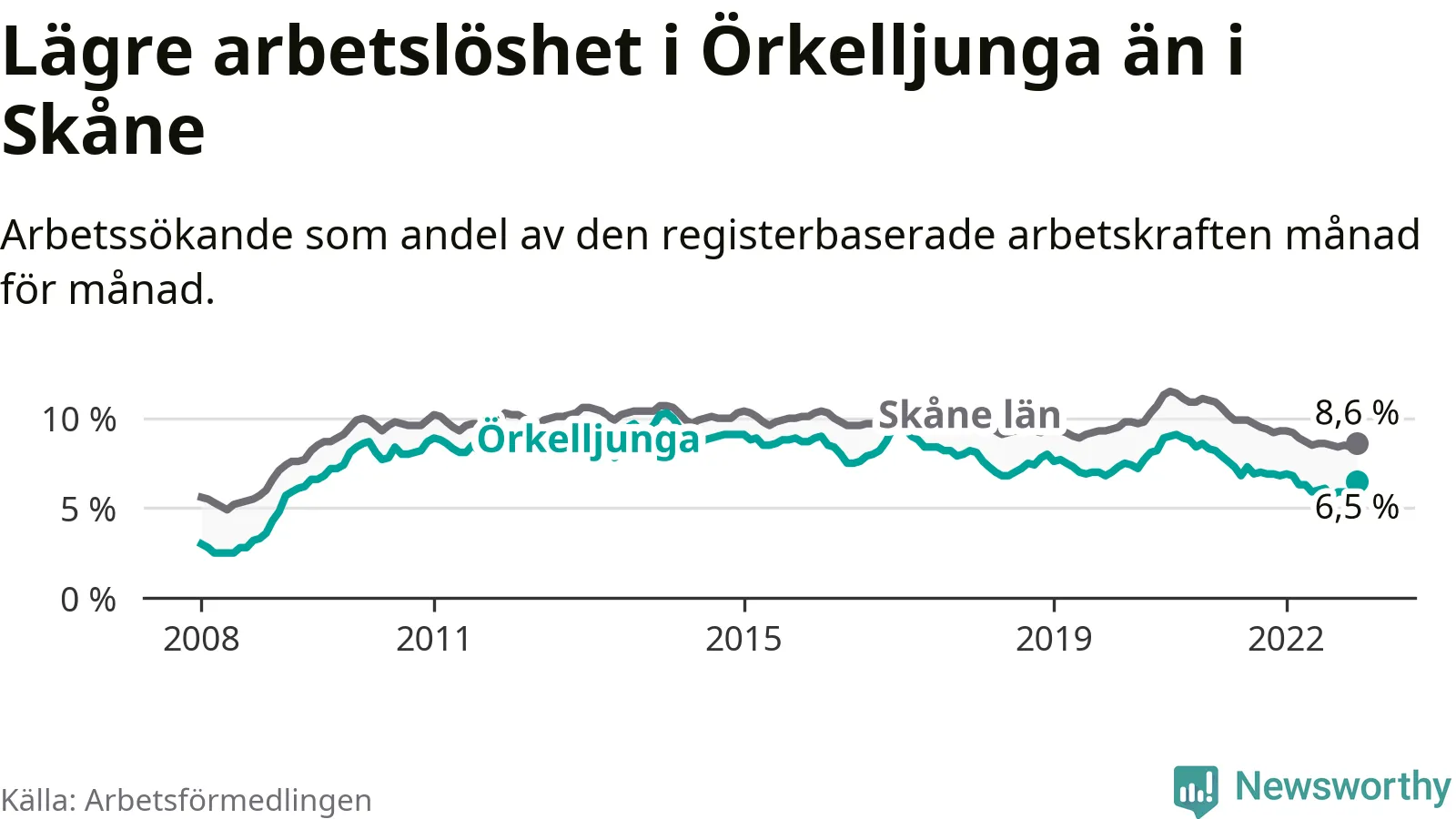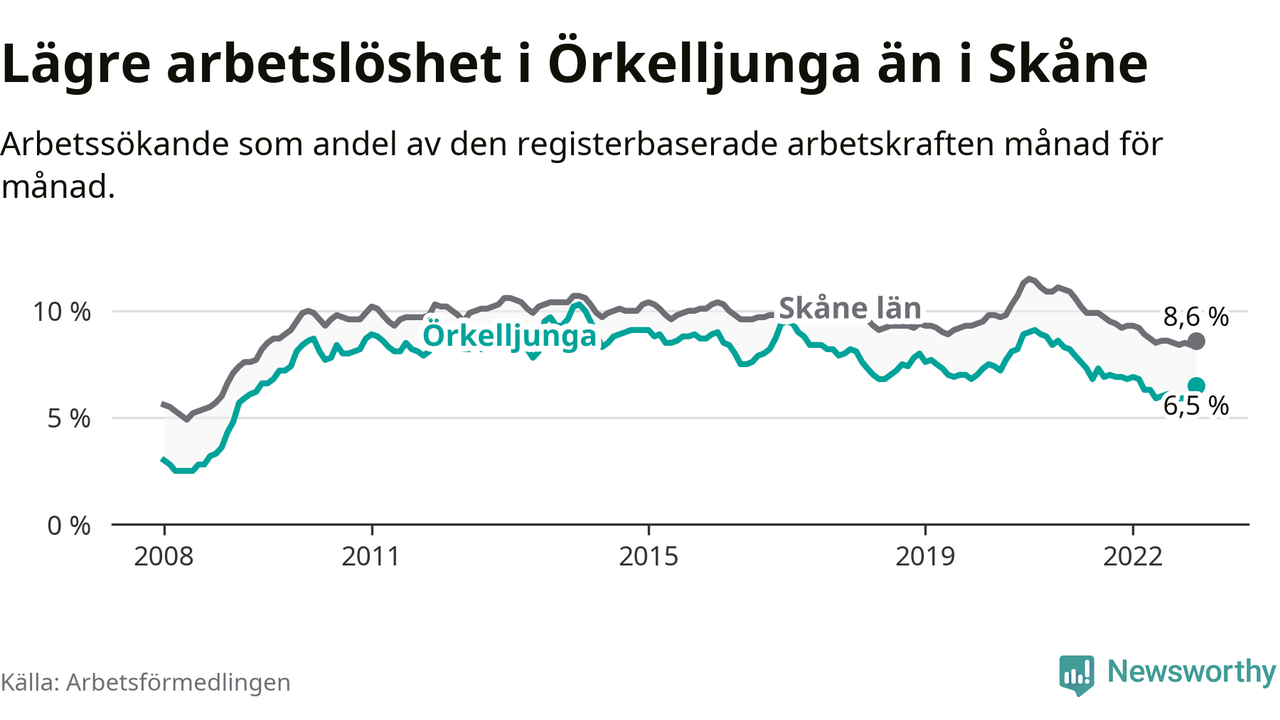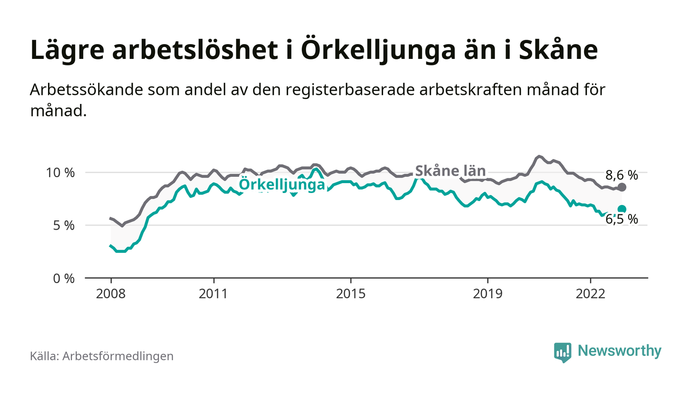 Örkelljunga hade redan tidigare lägre arbetslöshet än snittet i hela Skåne län och nu växer klyftan (6,5 procent i kommunen, jämfört med 8,6 procent i hela länet). Lomma har den lägsta arbetslösheten i länet (3,2 procent), medan Perstorp har den högsta (13,2 procent). För att Örkelljunga skulle komma ner i samma arbetslöshetsnivå som Lomma skulle 157 personer behöva sysselsättas.