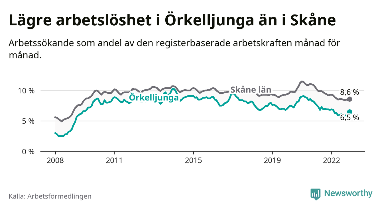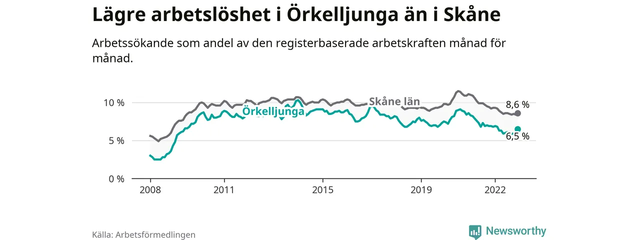 Det är 21:a månaden i följd som arbetslösheten i Örkelljunga är lägre än den var under samma tidpunkt året innan. Sedan mars 2021 har arbetslösheten gått ner från 7,9 till 6,5 procent.