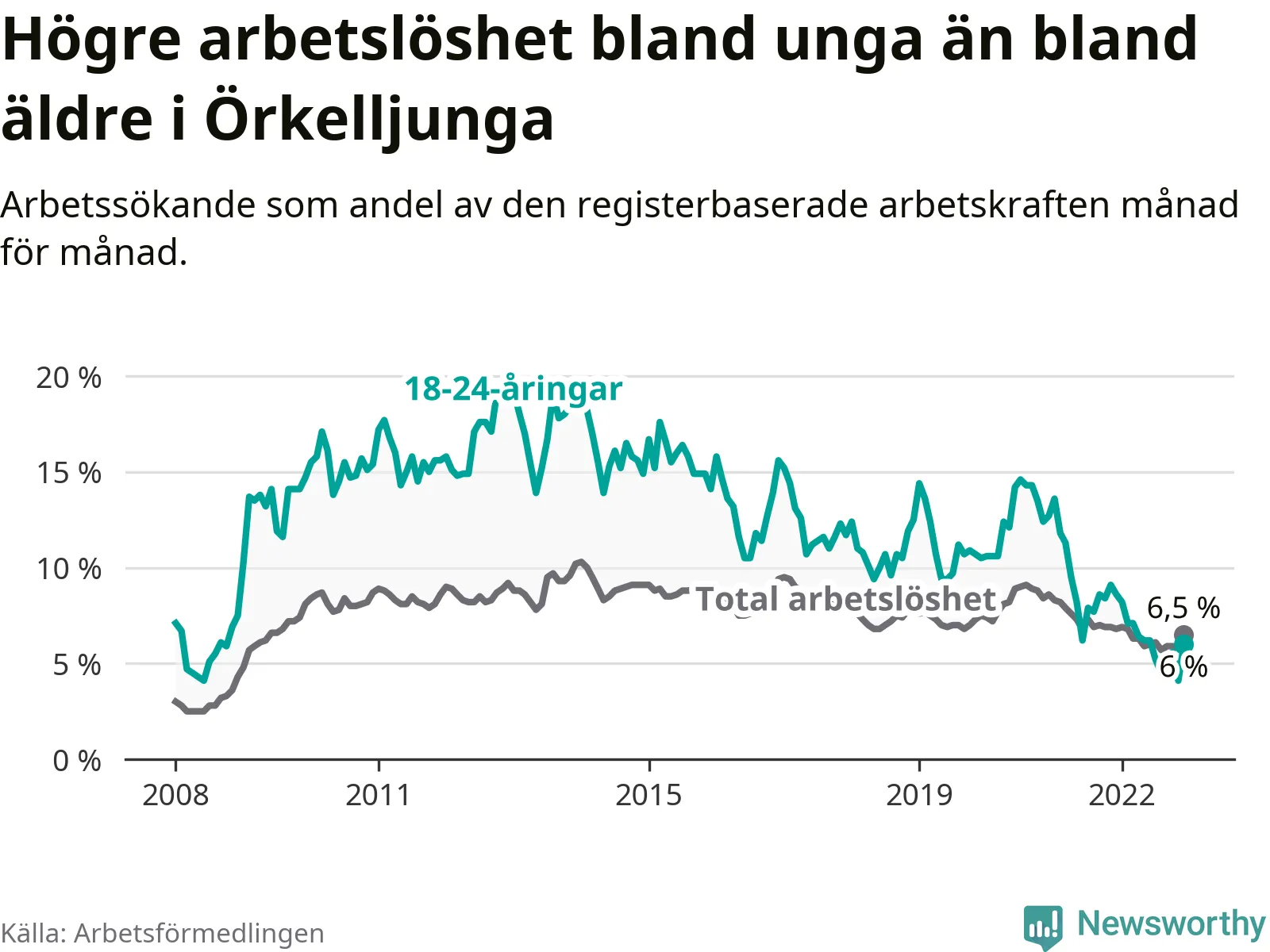 | Hela arbetskraften | 6,5 % | −0,3 % ▼ | 8,6 % | −0,7 % ▼ | 6,6 % | −0,6 % ▼ |