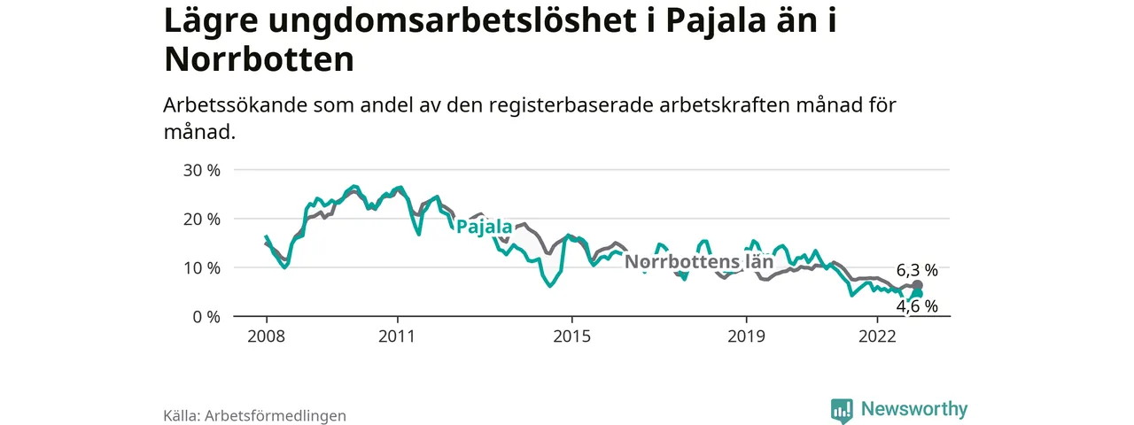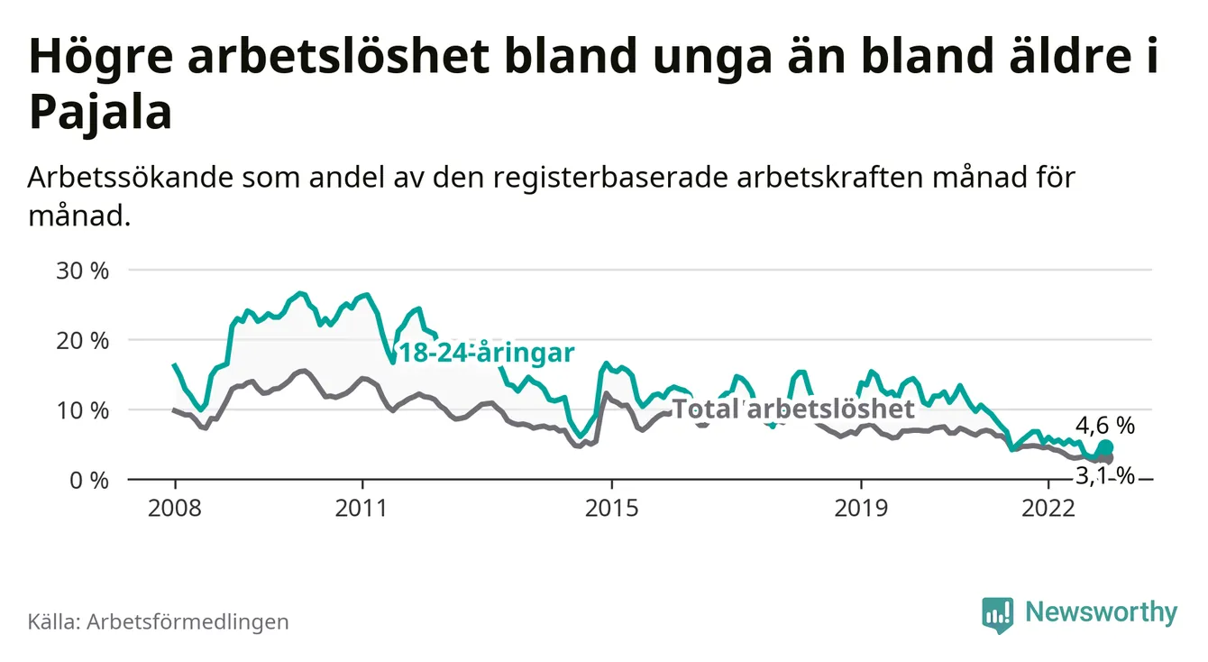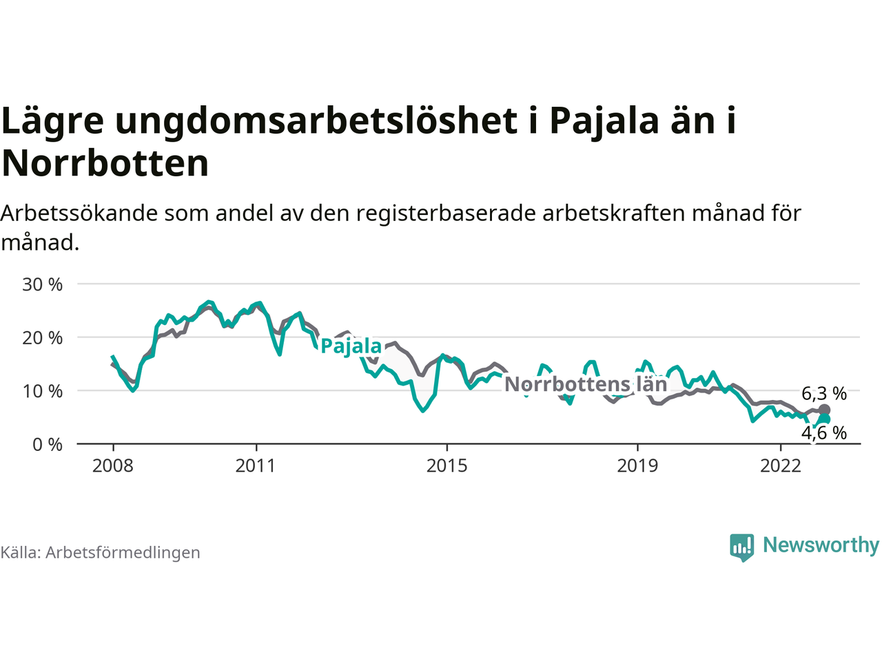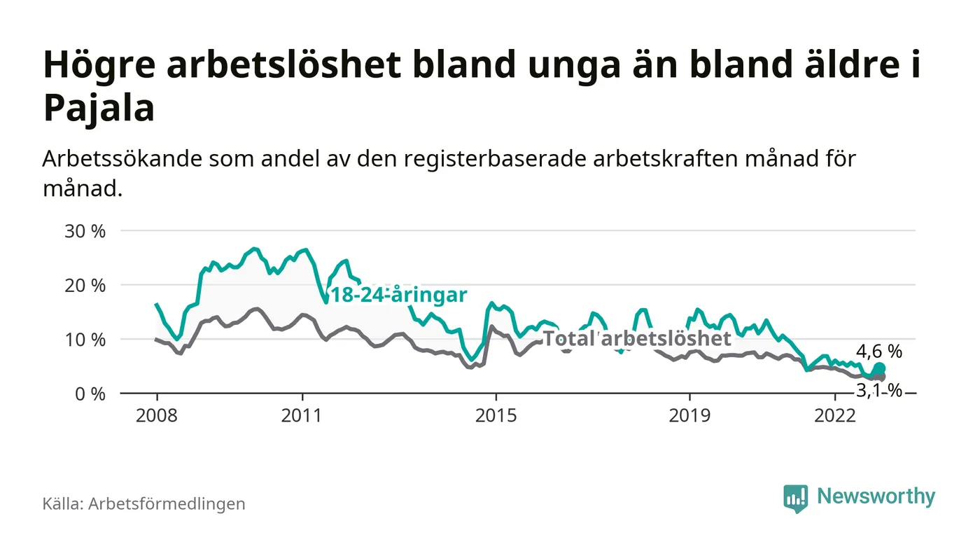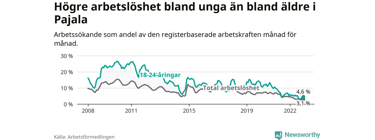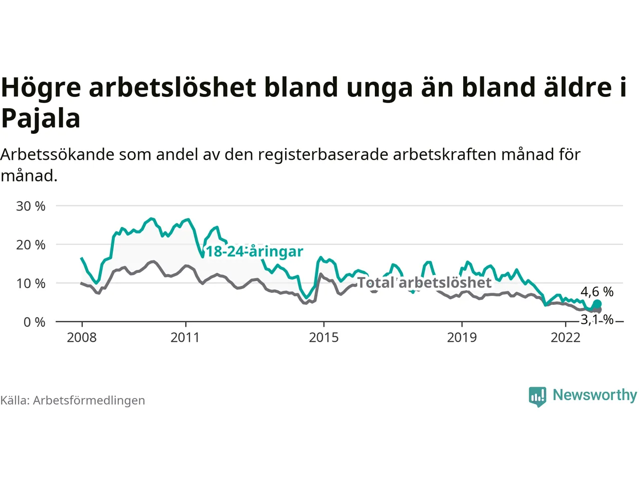 Graf: Arbetslöshet bland unga i Pajala kommun och Norrbottens län