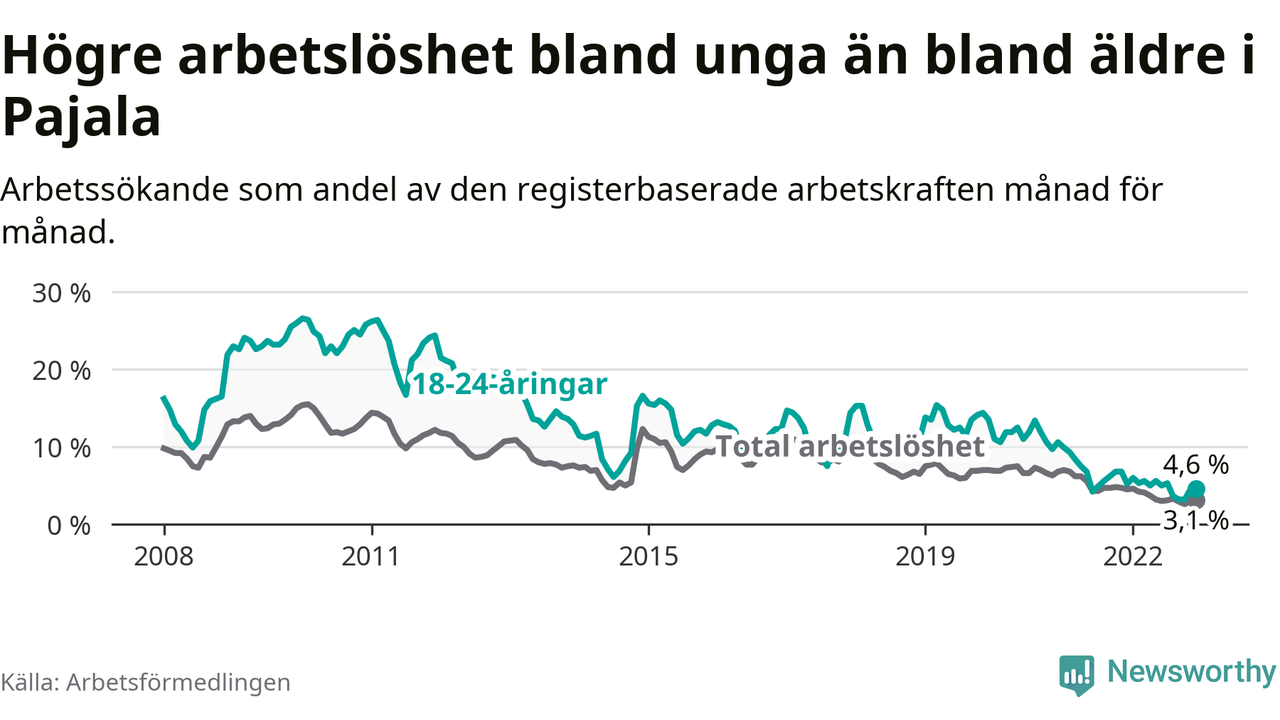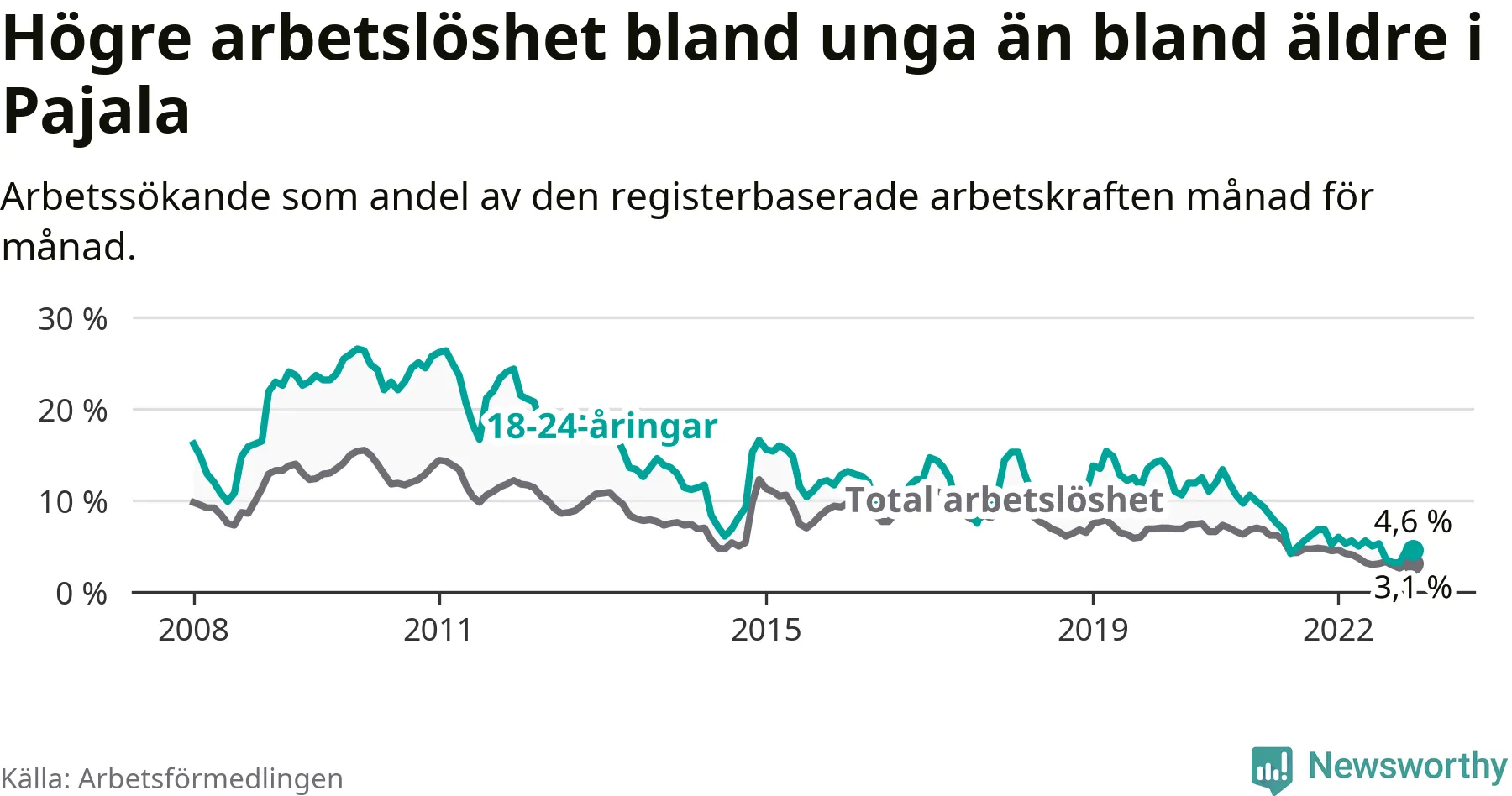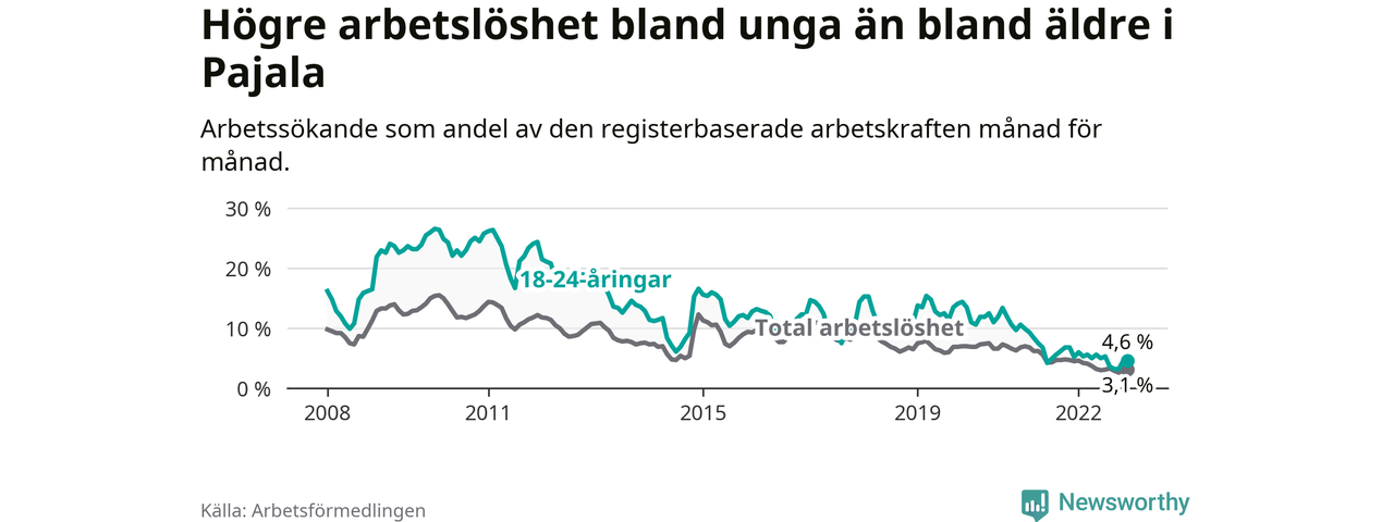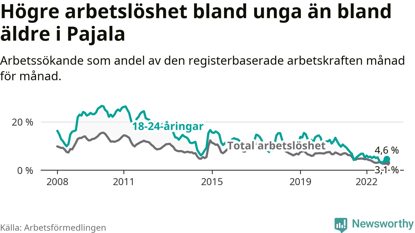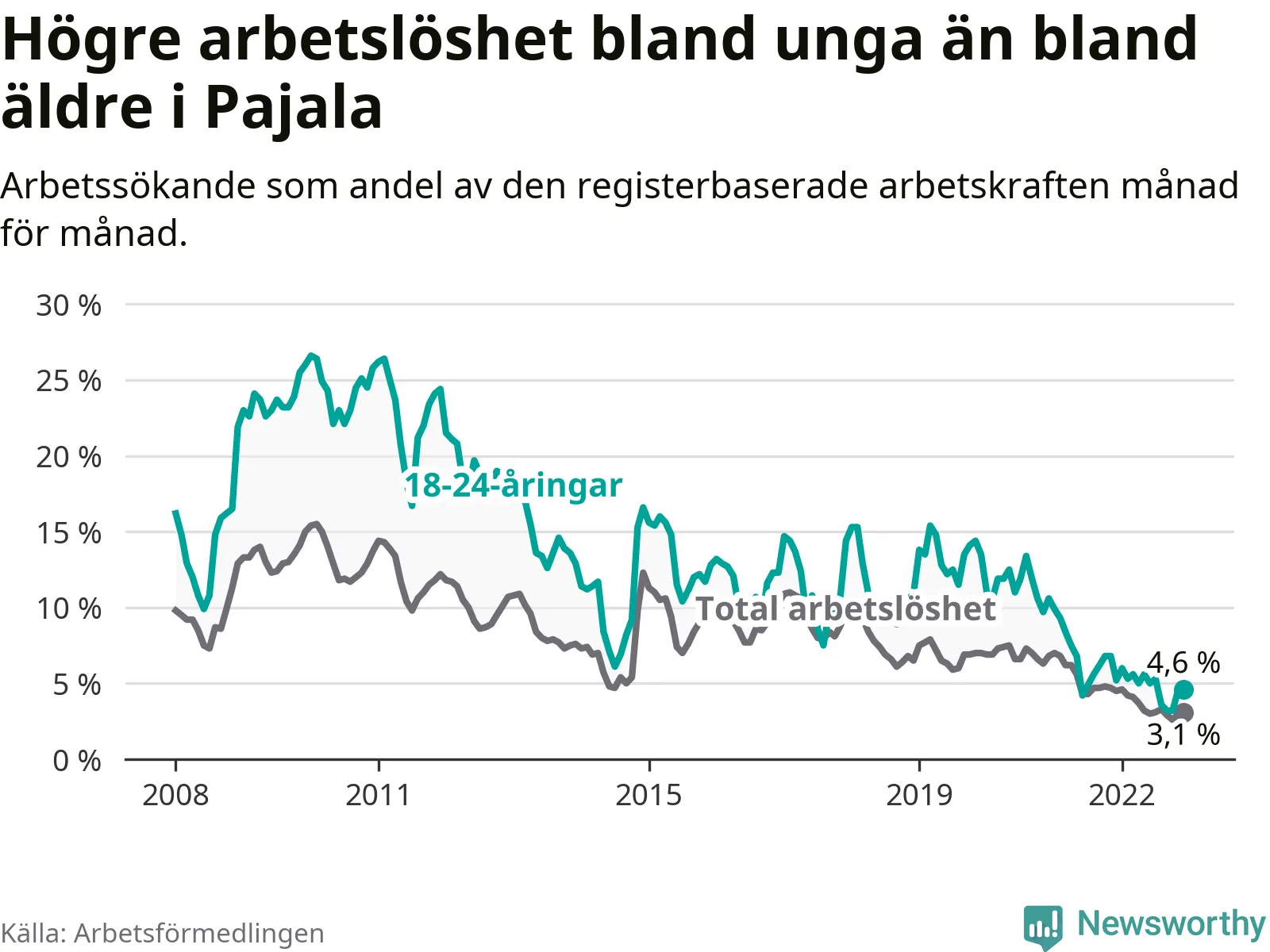 Graf: Arbetslöshet bland unga i Pajala kommun och Norrbottens län