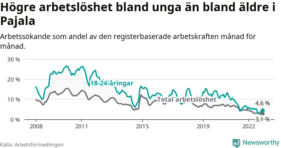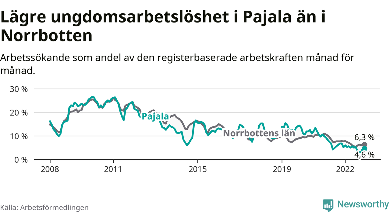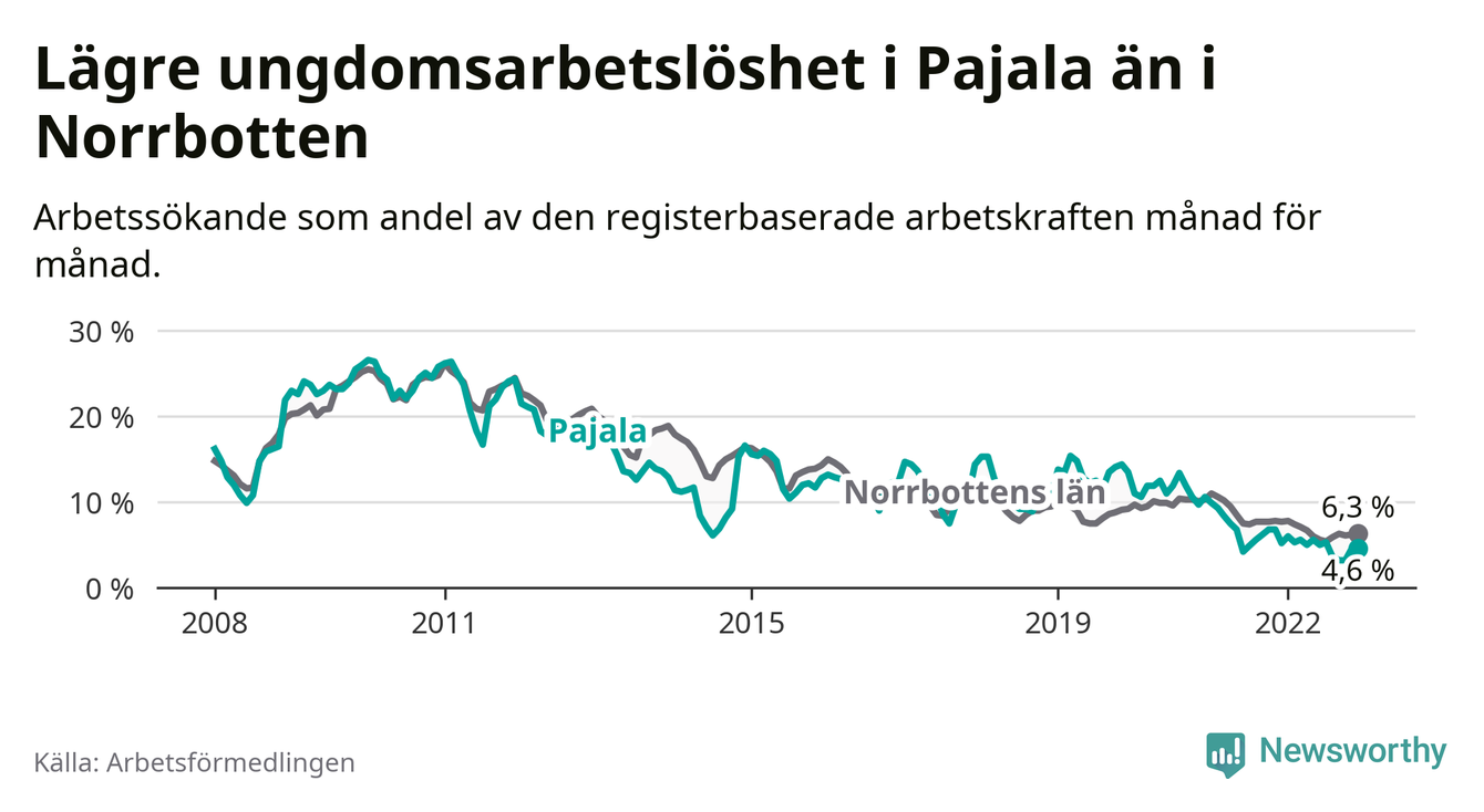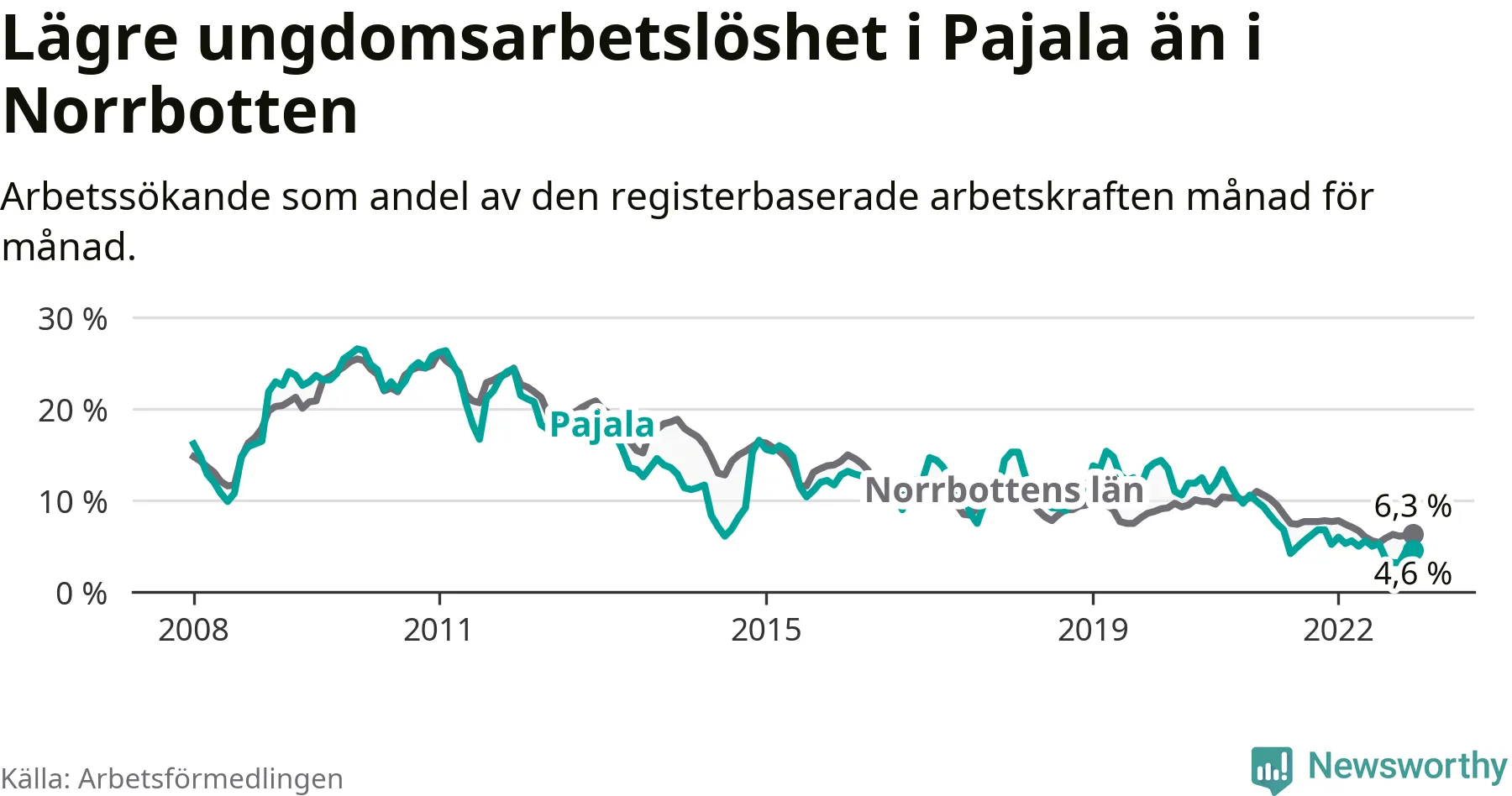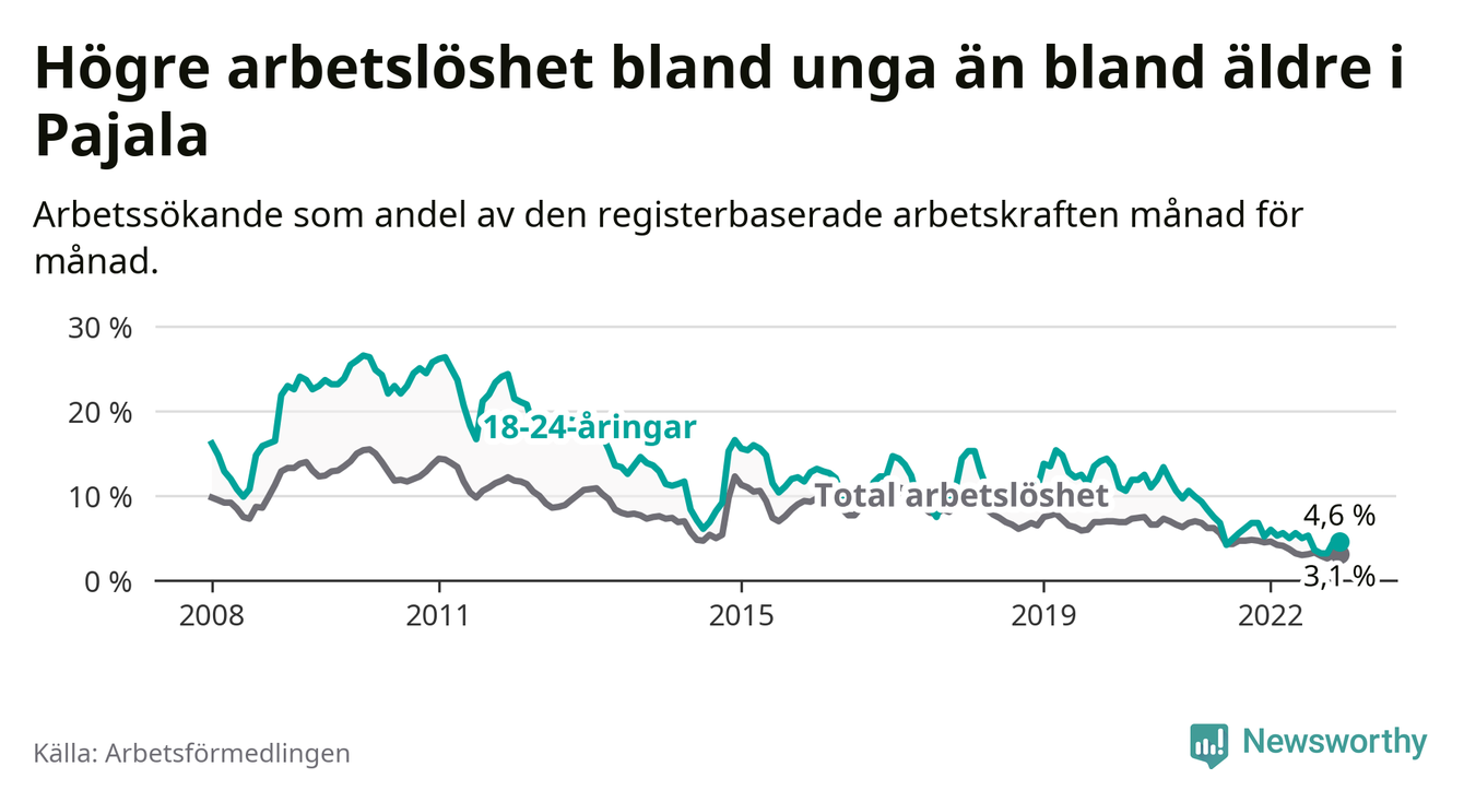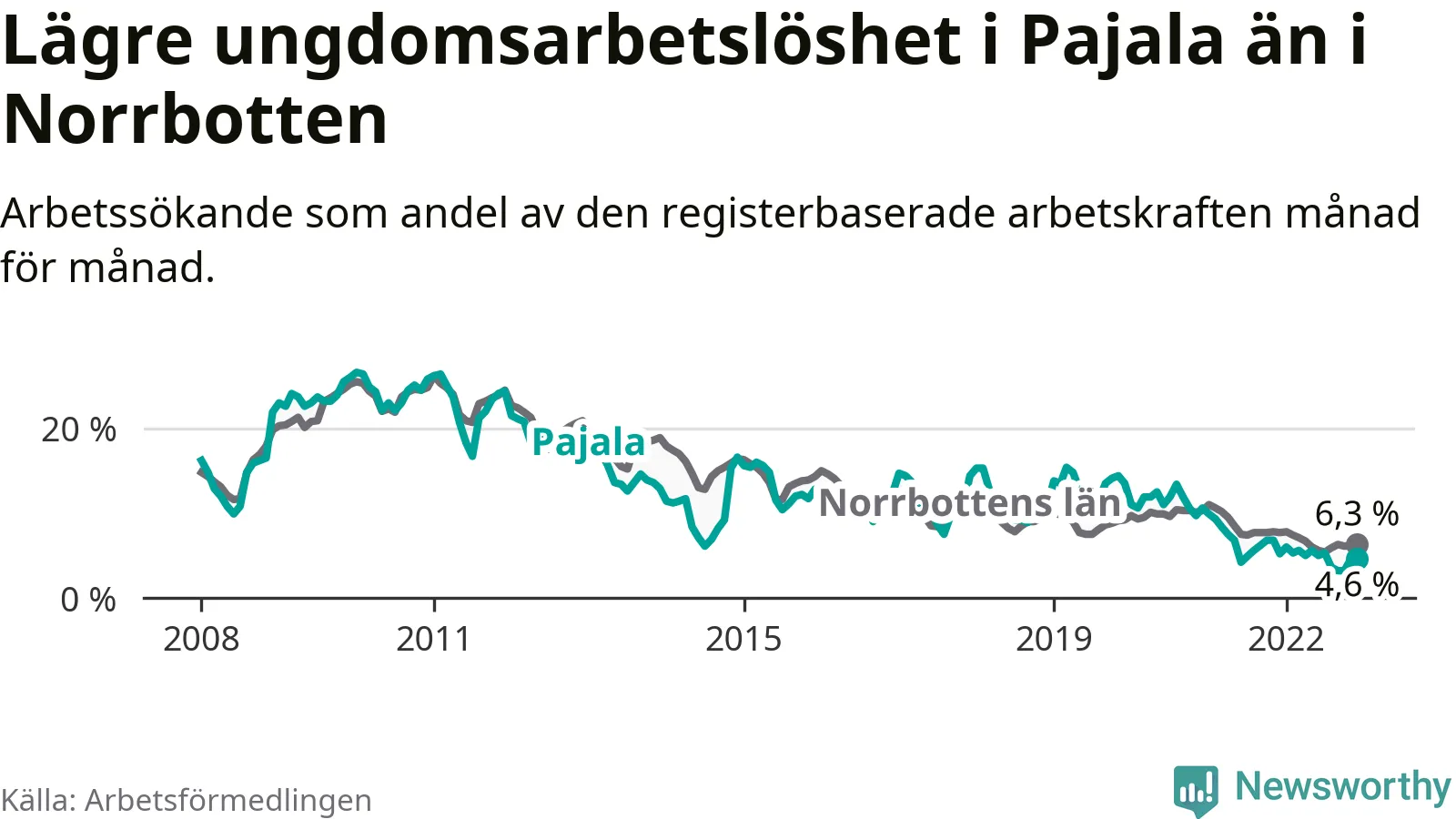 Graf: Arbetslöshet bland unga i Pajala kommun och Norrbottens län