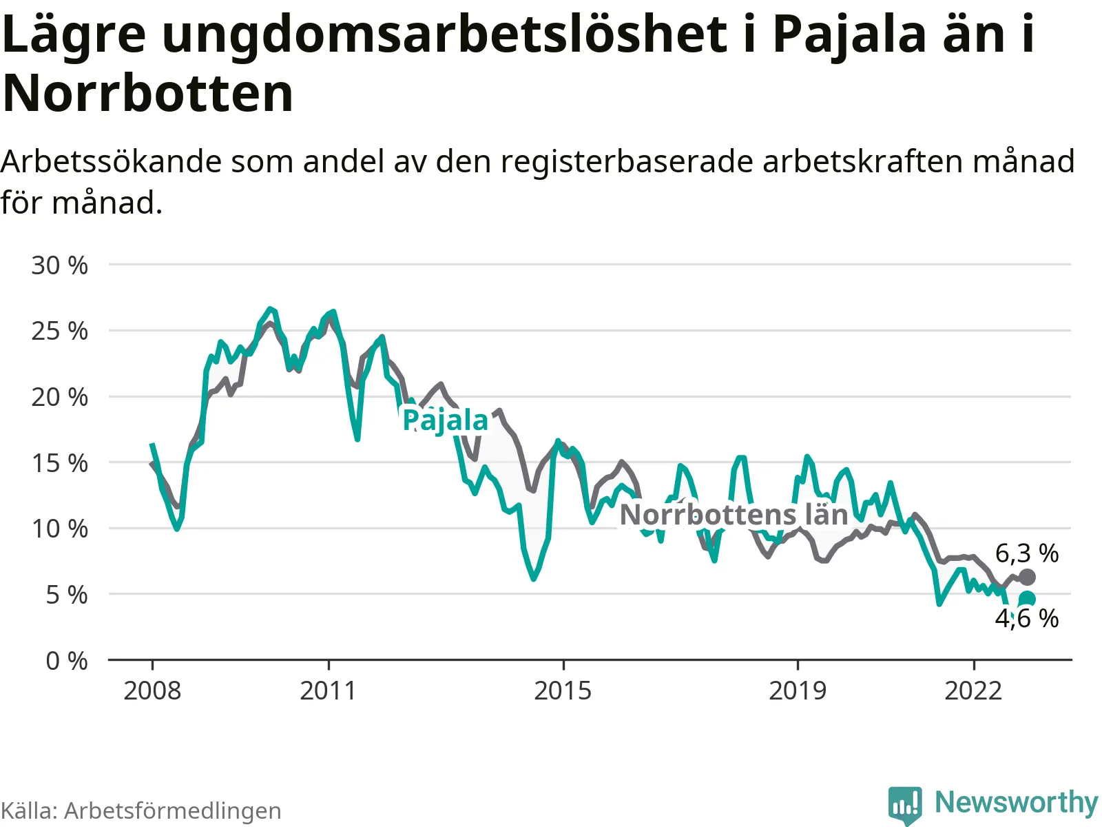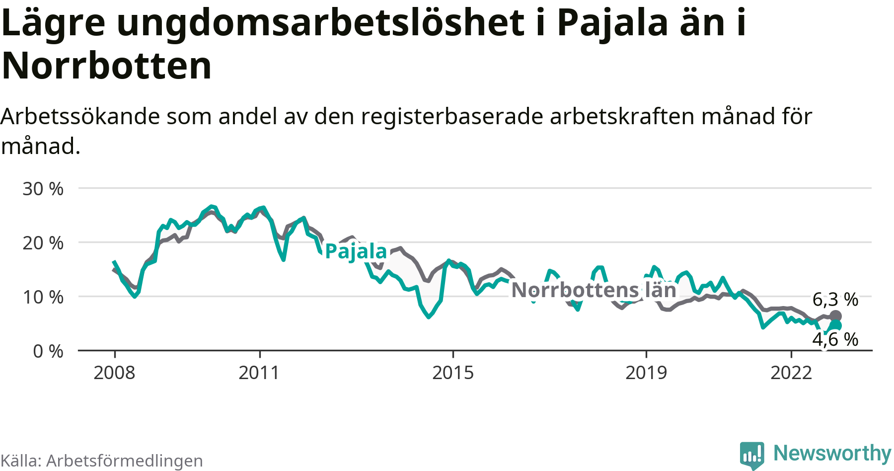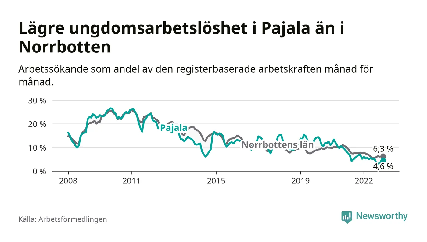 Precis som den totala arbetslösheten ligger ungdomsarbetslösheten i Pajala lägre än i Norrbotten som helhet. Skillnaden mellan kommunen och länet är 1,7 procentenheter.