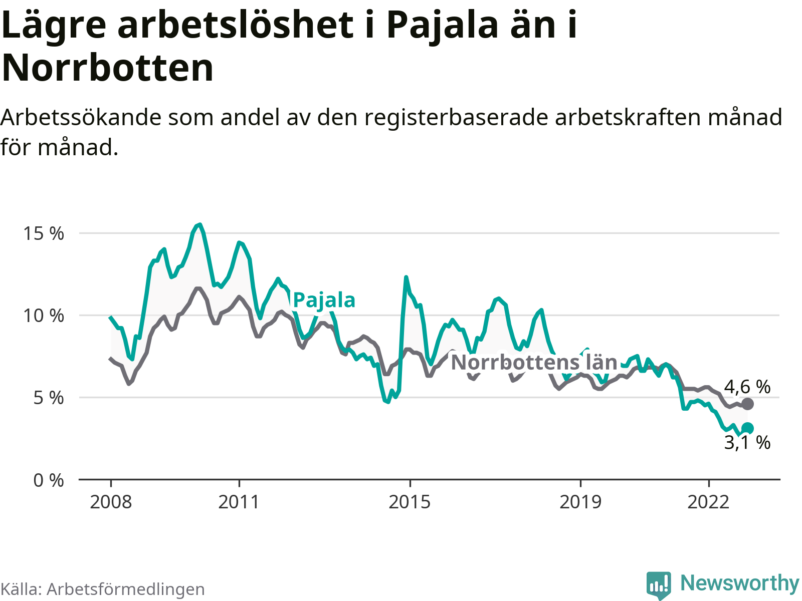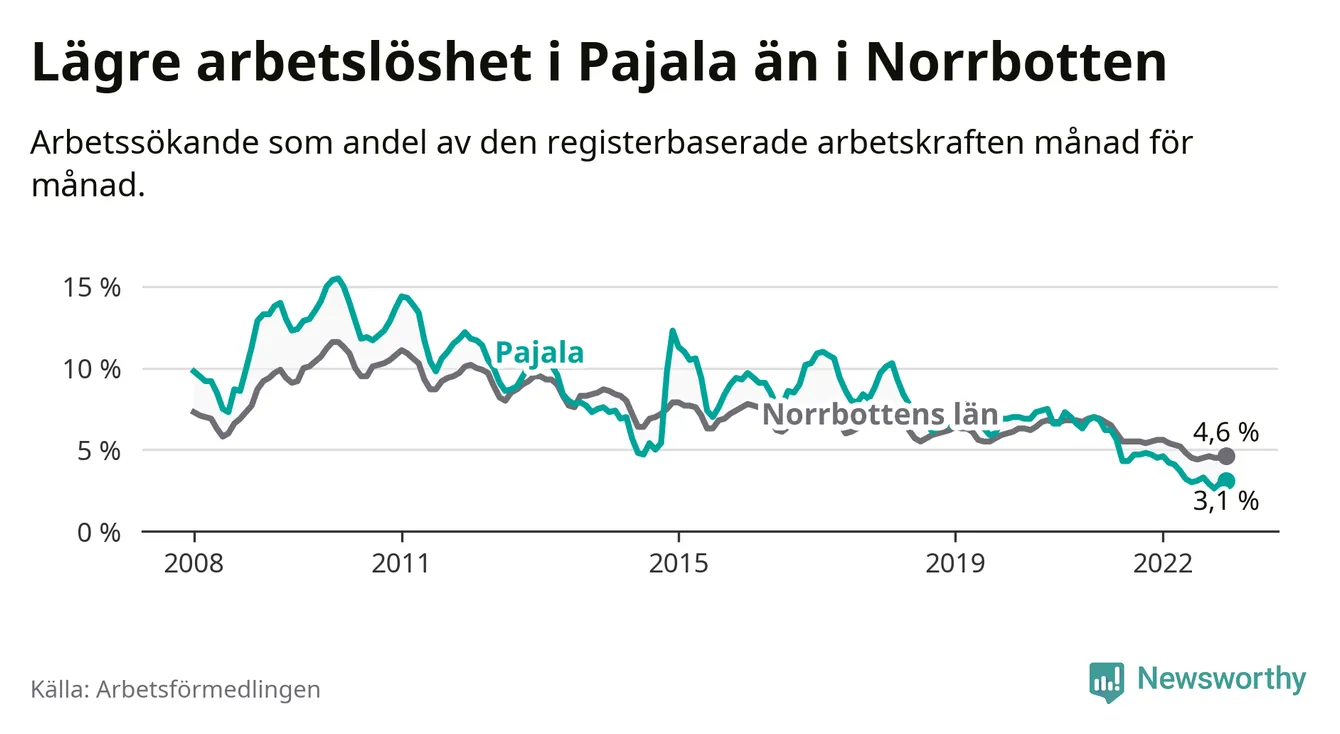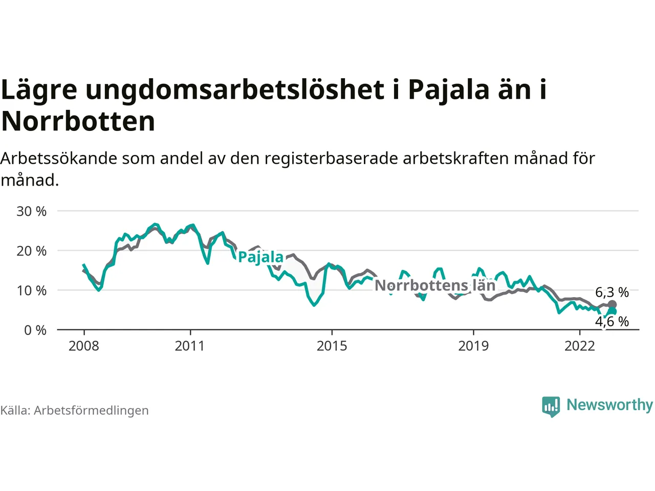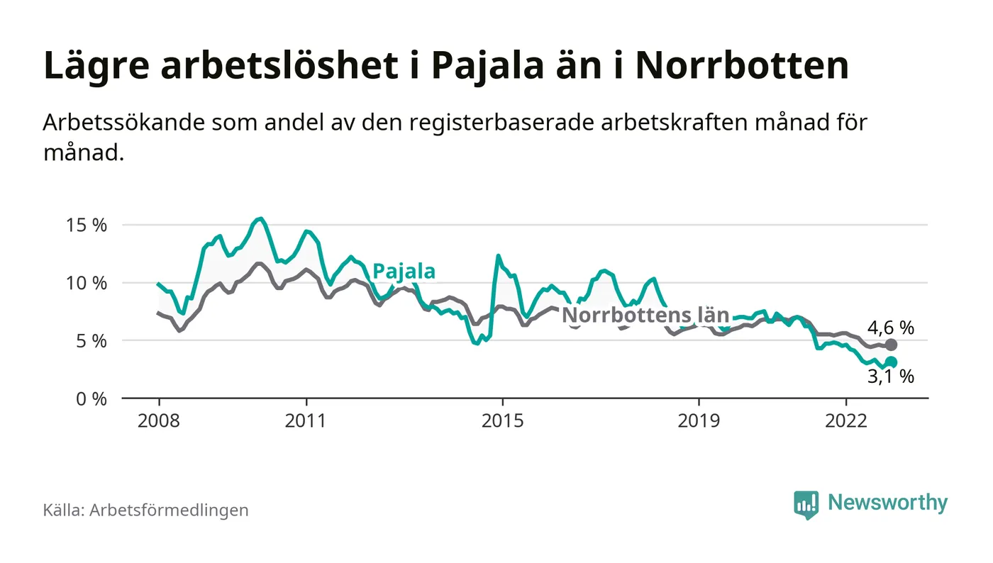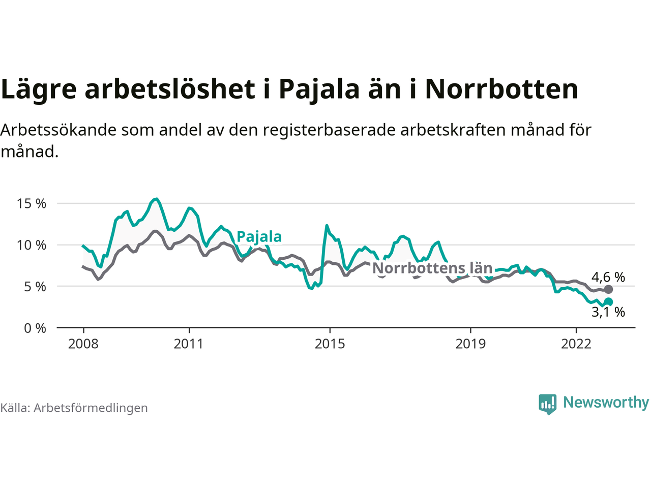 Det är 23:e månaden i följd som arbetslösheten i Pajala är lägre än den var under samma tidpunkt året innan. Sedan januari 2021 har arbetslösheten gått ner från 7,0 till 3,1 procent.