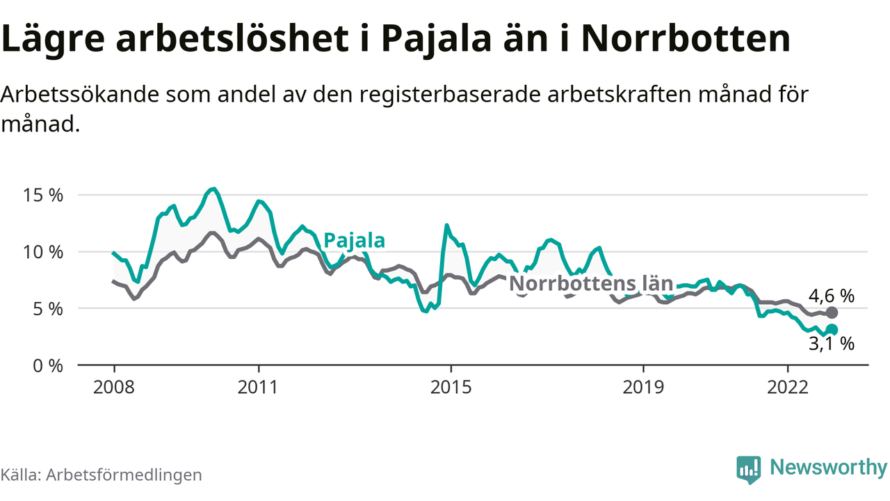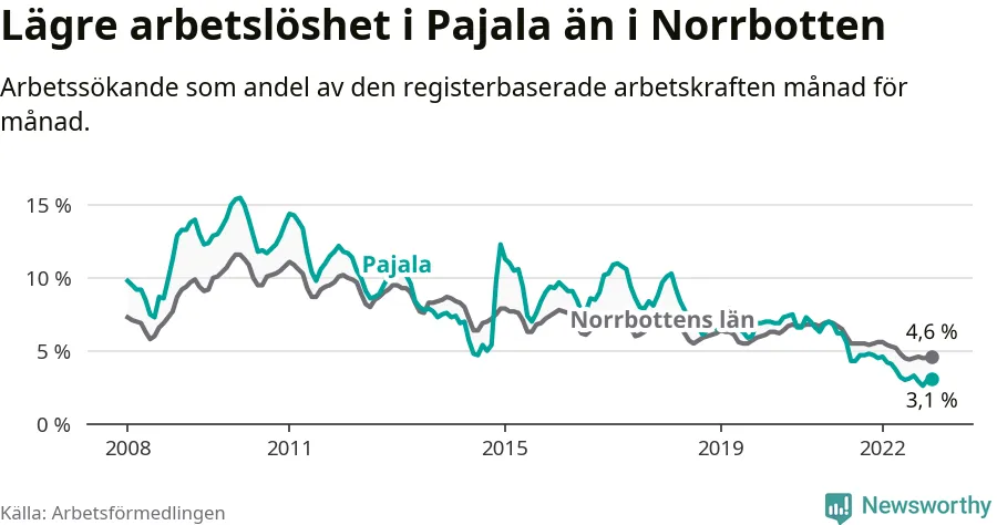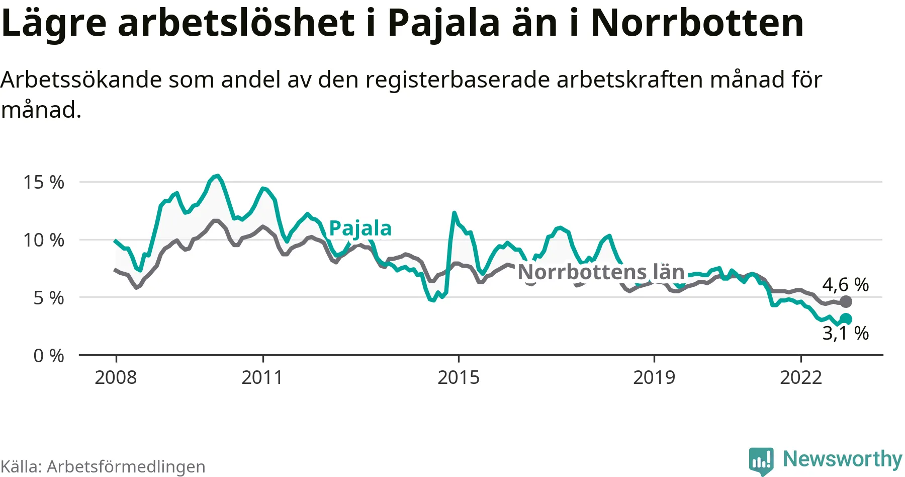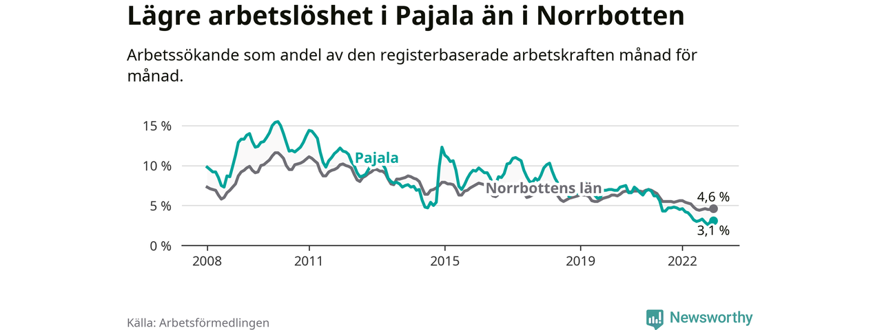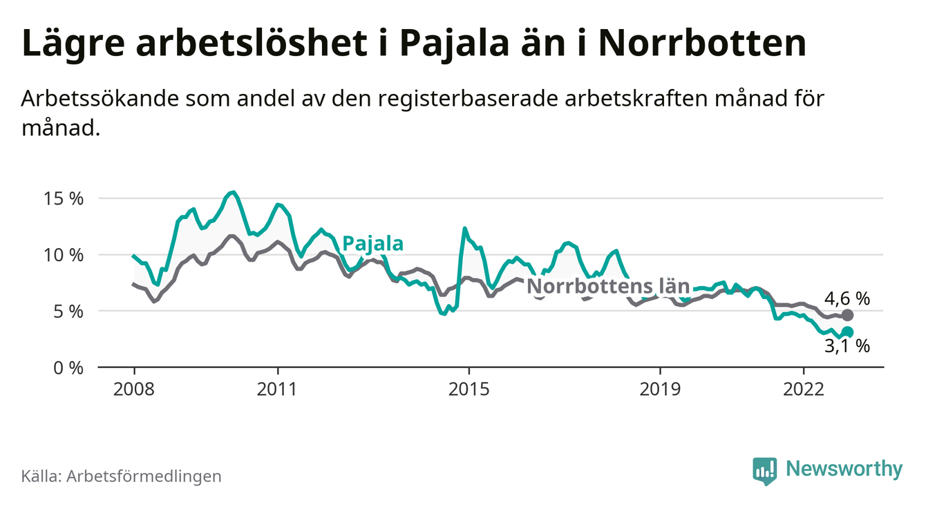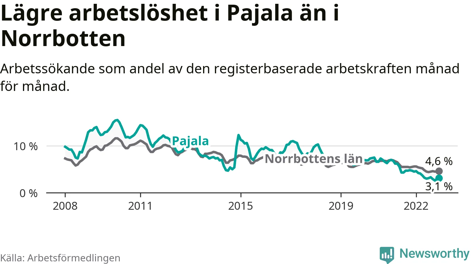 Det är 23:e månaden i följd som arbetslösheten i Pajala är lägre än den var under samma tidpunkt året innan. Sedan januari 2021 har arbetslösheten gått ner från 7,0 till 3,1 procent.
