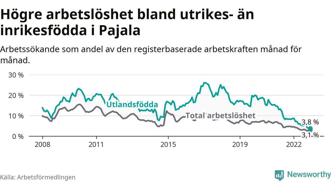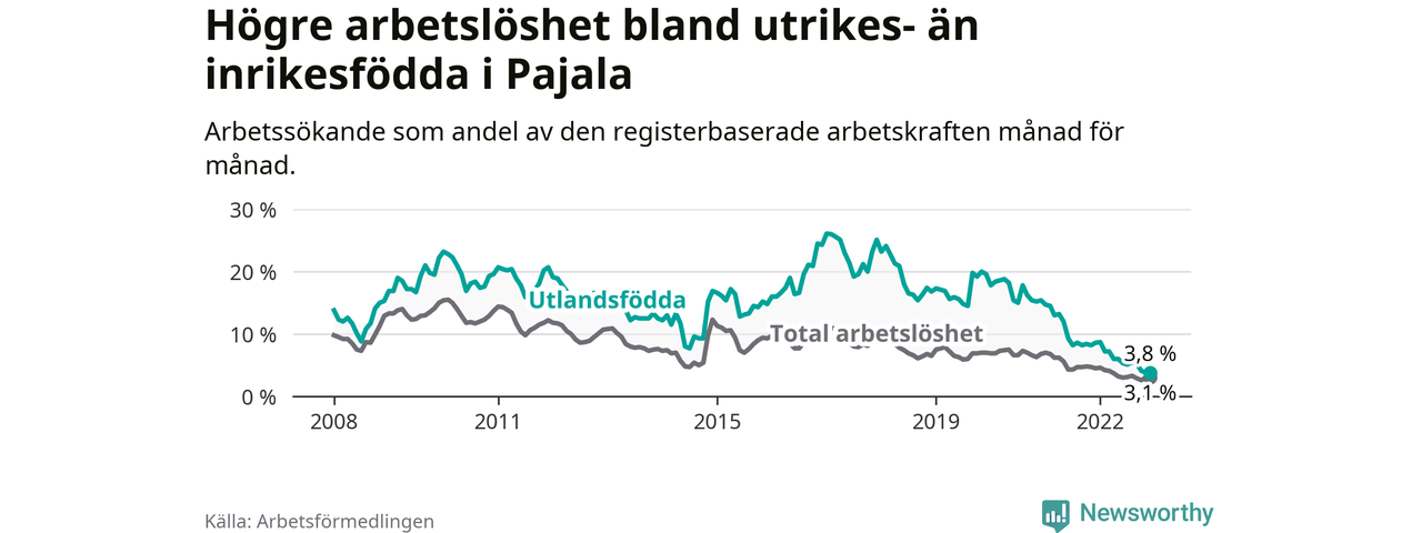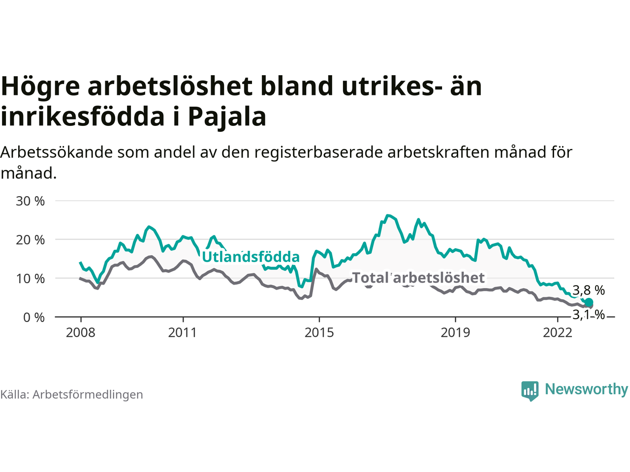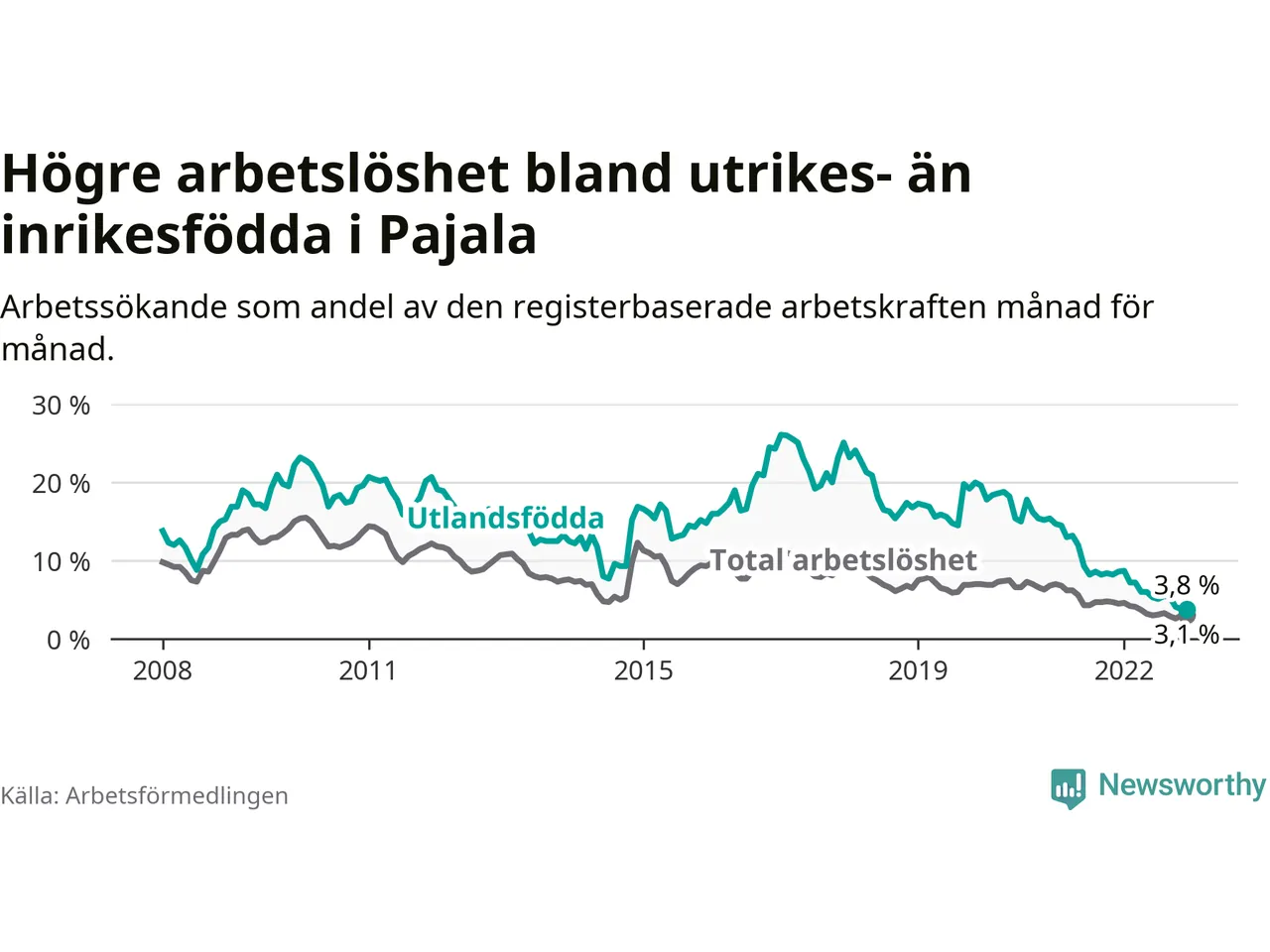 Arbetslösheten bland utlandsfödda var 3,8 procent i Pajala under december månad, motsvarande 15 av 395 personer. Det är 4,8 procentenheter färre än vid samma tidpunkt i fjol (−21 om man räknar personer). Därmed har de utlandsföddas arbetslöshet varit lägre än vid samma tidpunkt i fjol i över två år i sträck. Sedan augusti 2020 har arbetslösheten bland utlandsfödda minskat från 17,8 till 3,8 procent.