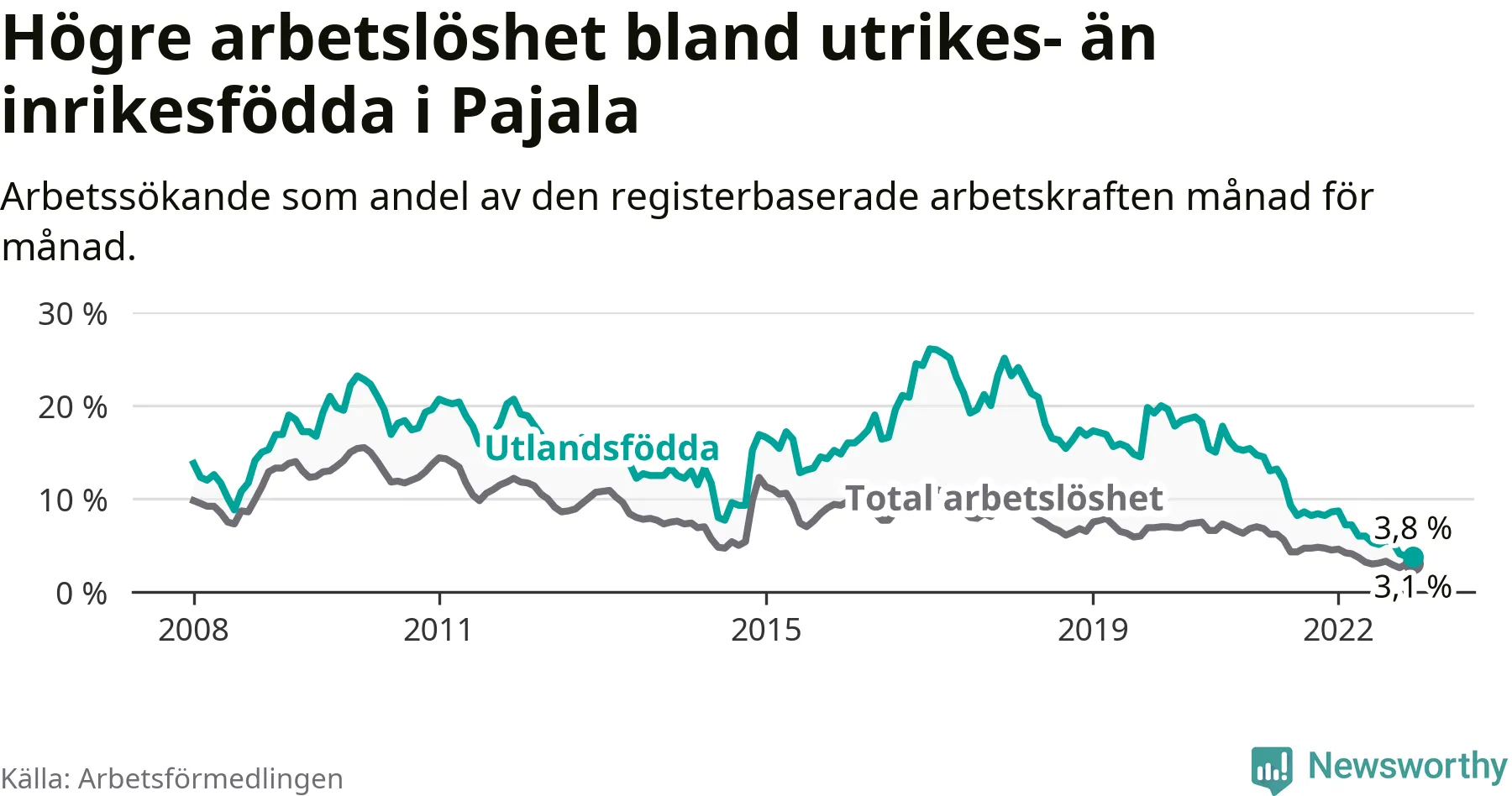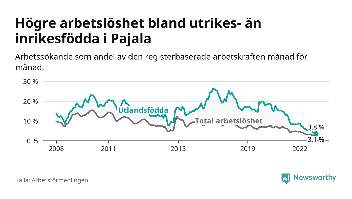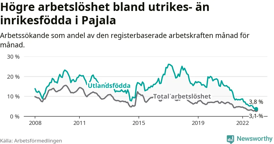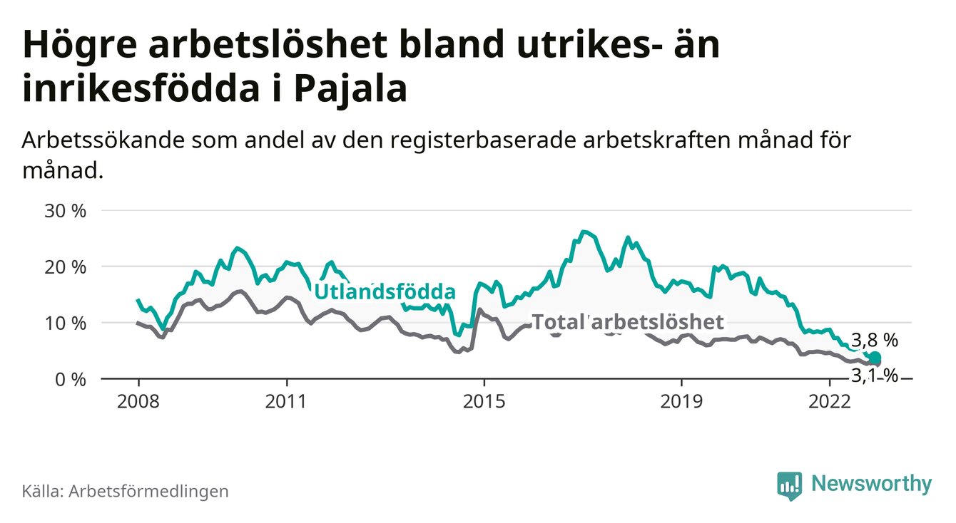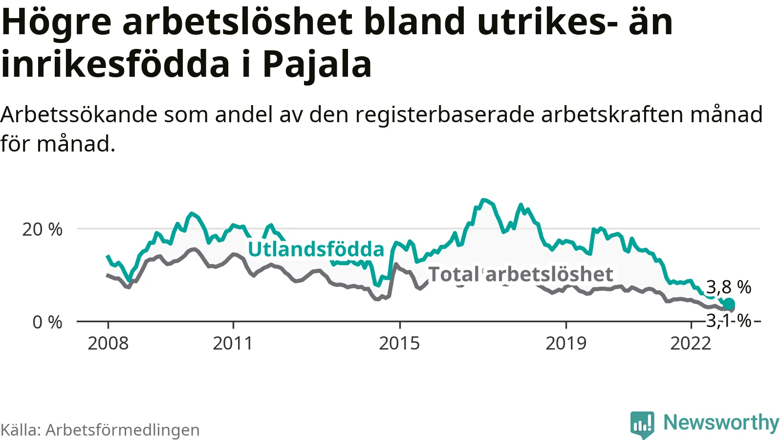 Arbetslösheten bland utlandsfödda var 3,8 procent i Pajala under december månad, motsvarande 15 av 395 personer. Det är 4,8 procentenheter färre än vid samma tidpunkt i fjol (−21 om man räknar personer). Därmed har de utlandsföddas arbetslöshet varit lägre än vid samma tidpunkt i fjol i över två år i sträck. Sedan augusti 2020 har arbetslösheten bland utlandsfödda minskat från 17,8 till 3,8 procent.