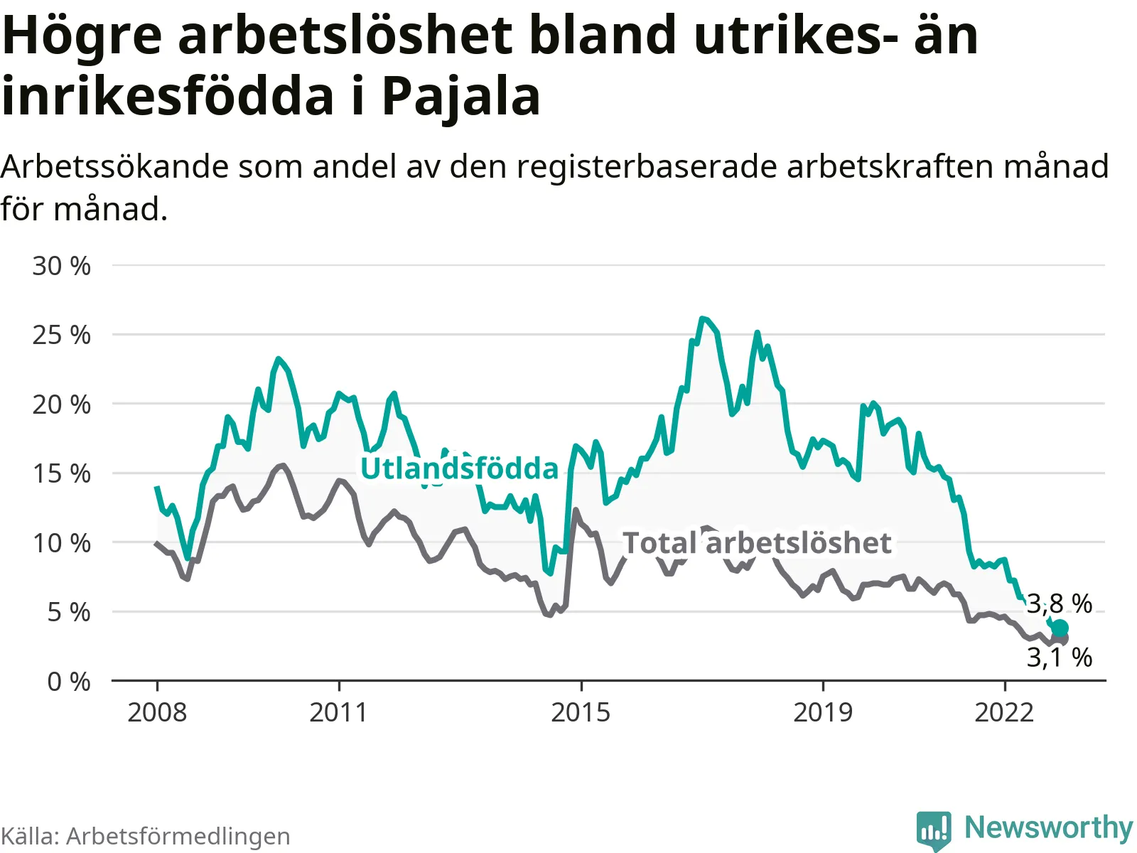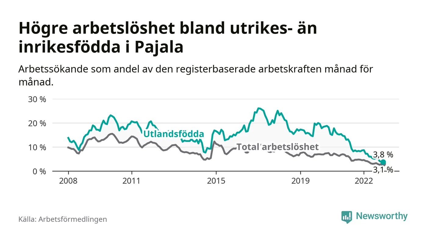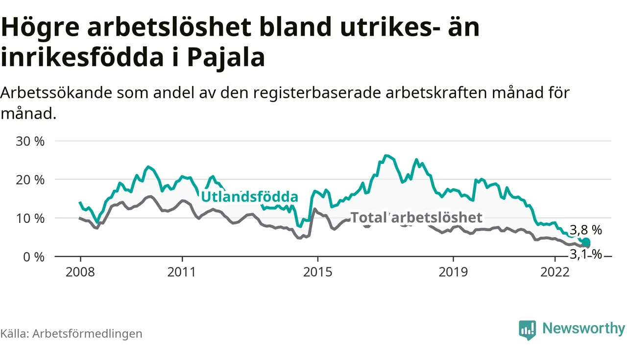 Den här skillnaden i arbetslöshet mellan inrikes- och utrikesfödda är ändå förhållandevis liten i Pajala om man jämför med andra kommuner i Norrbotten.
