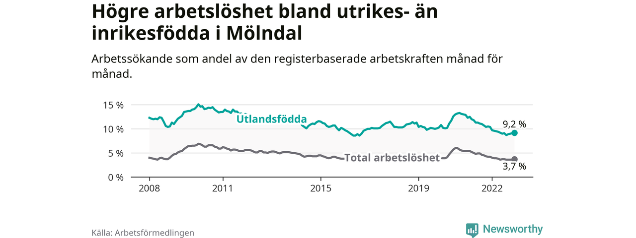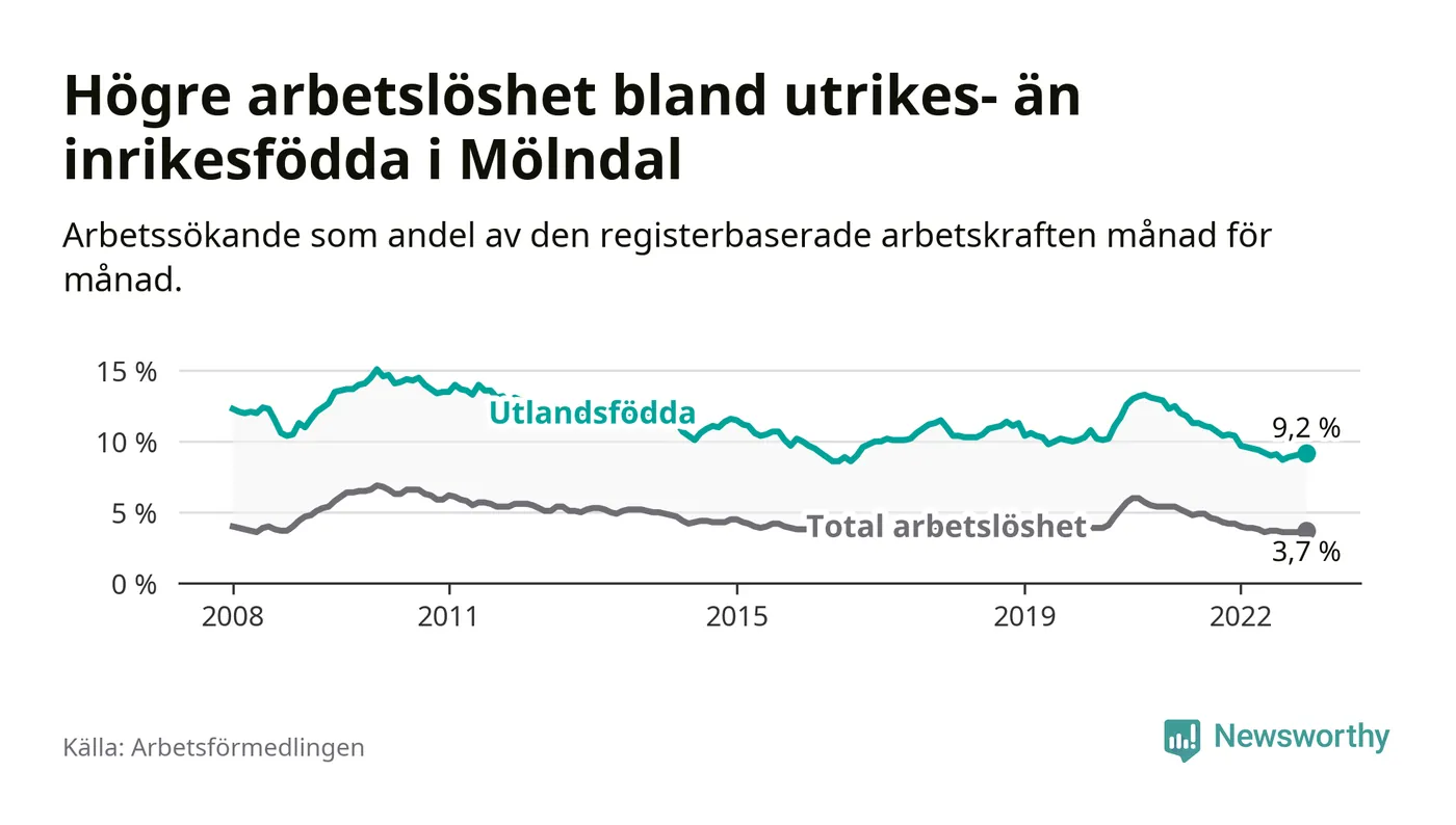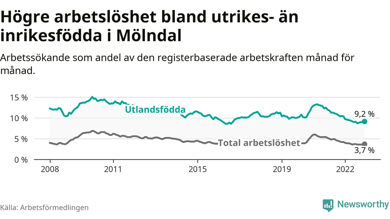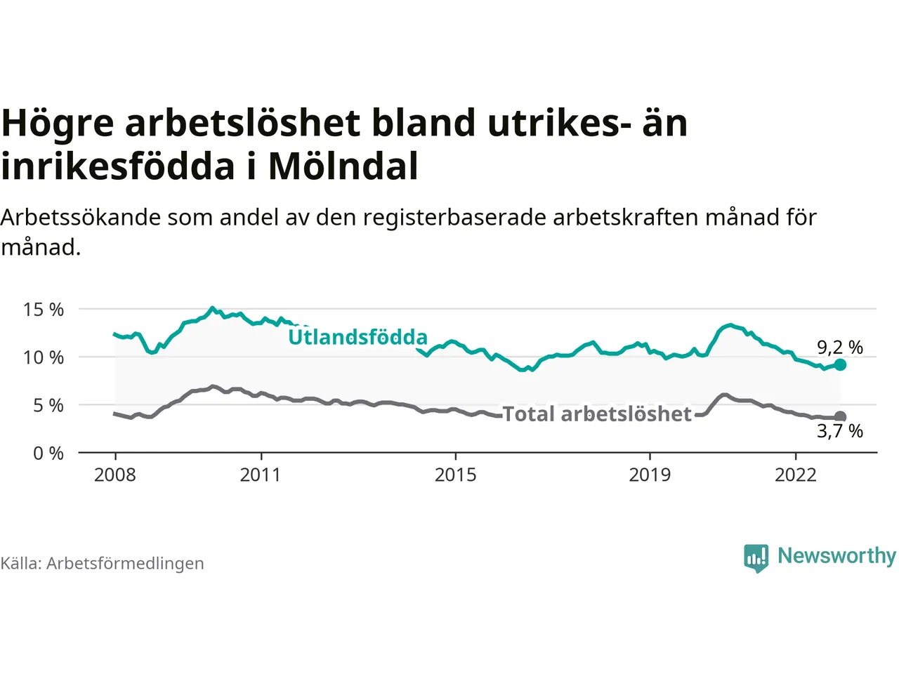 Skillnaden i arbetslöshet mellan utrikesfödda och hela befolkningen är 5,5 procentenheter i Mölndal. Det är en mindre skillnad än för ett år sedan (−0,7 procentenheter).