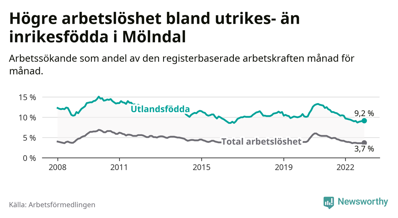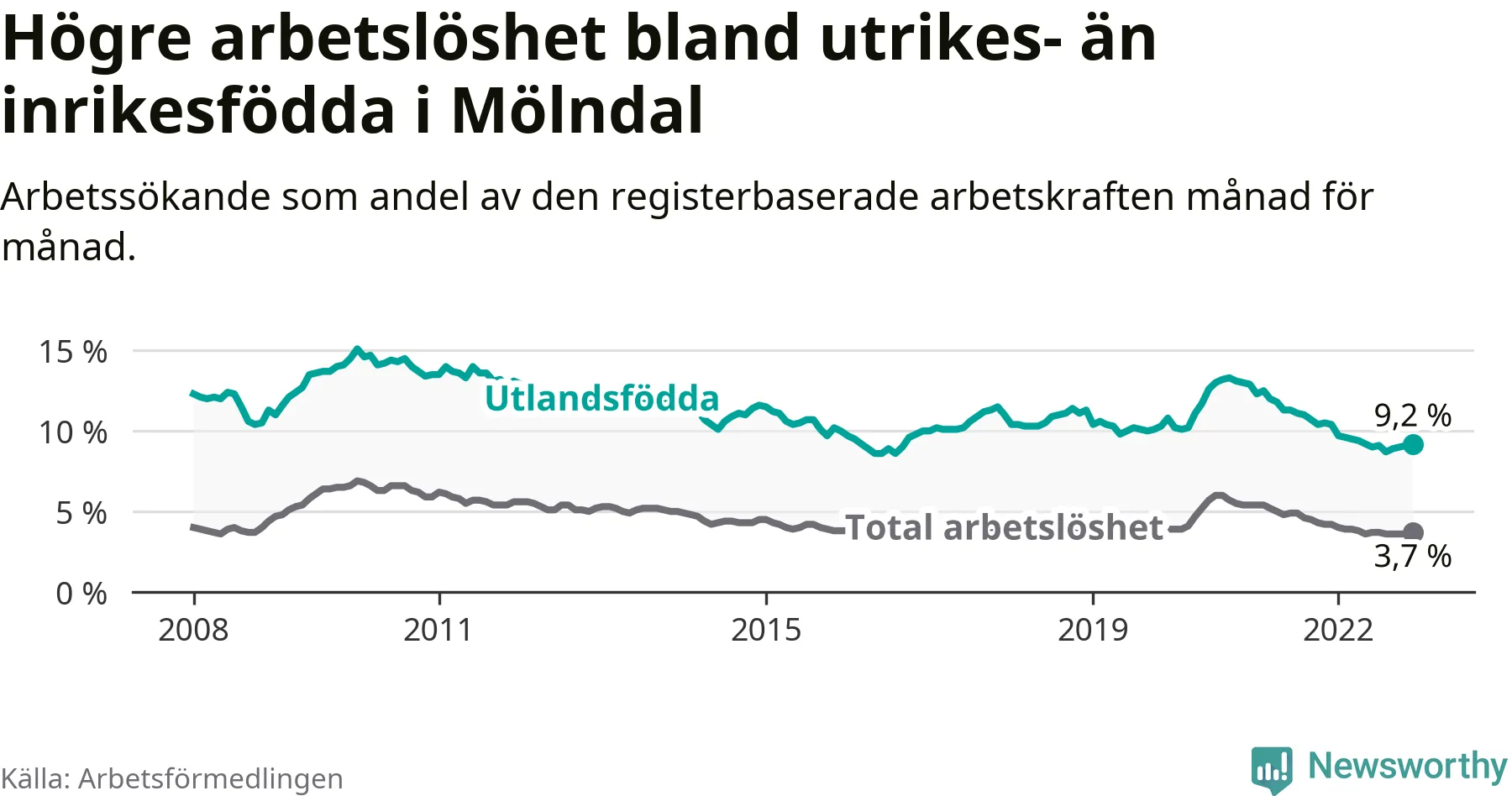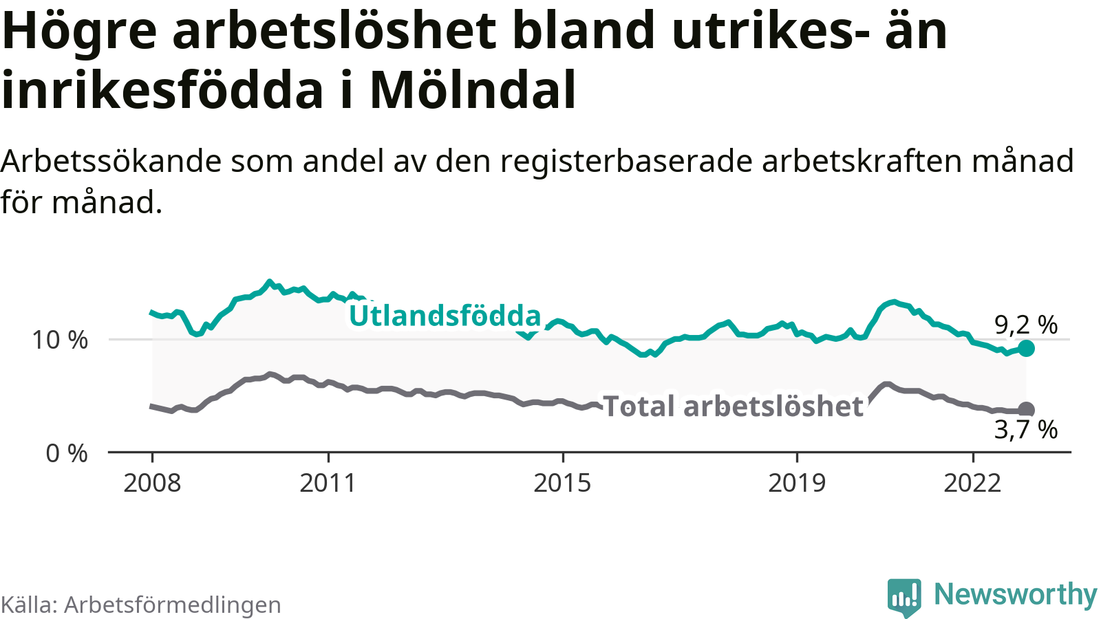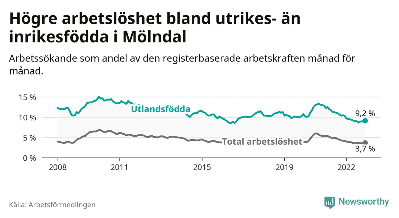 Skillnaden i arbetslöshet mellan utrikesfödda och hela befolkningen är 5,5 procentenheter i Mölndal. Det är en mindre skillnad än för ett år sedan (−0,7 procentenheter).