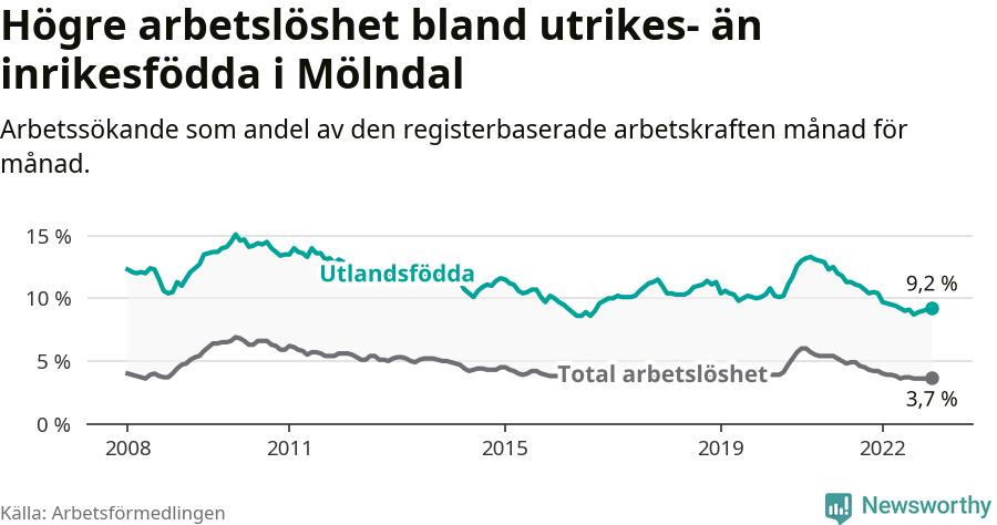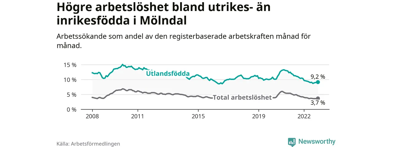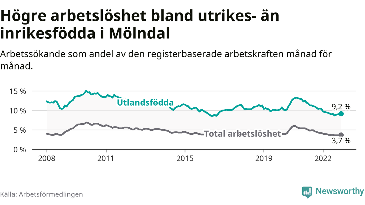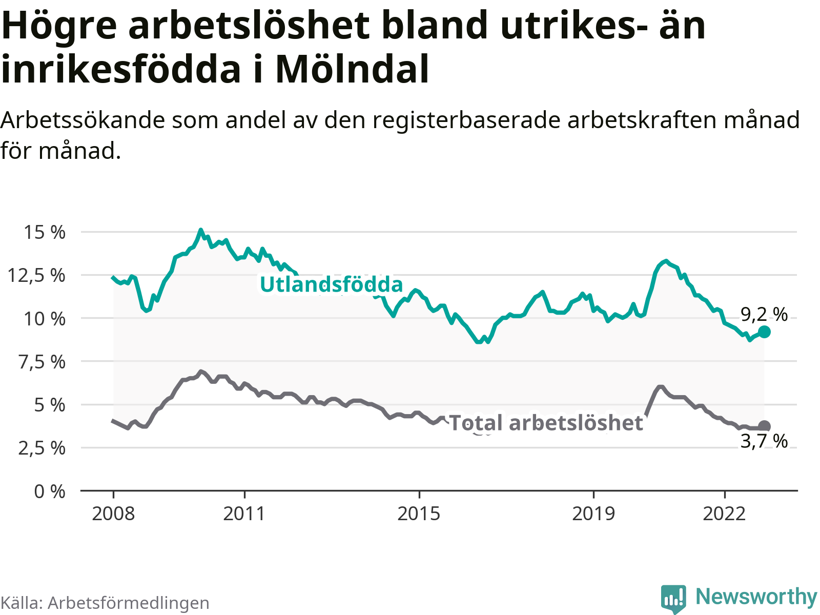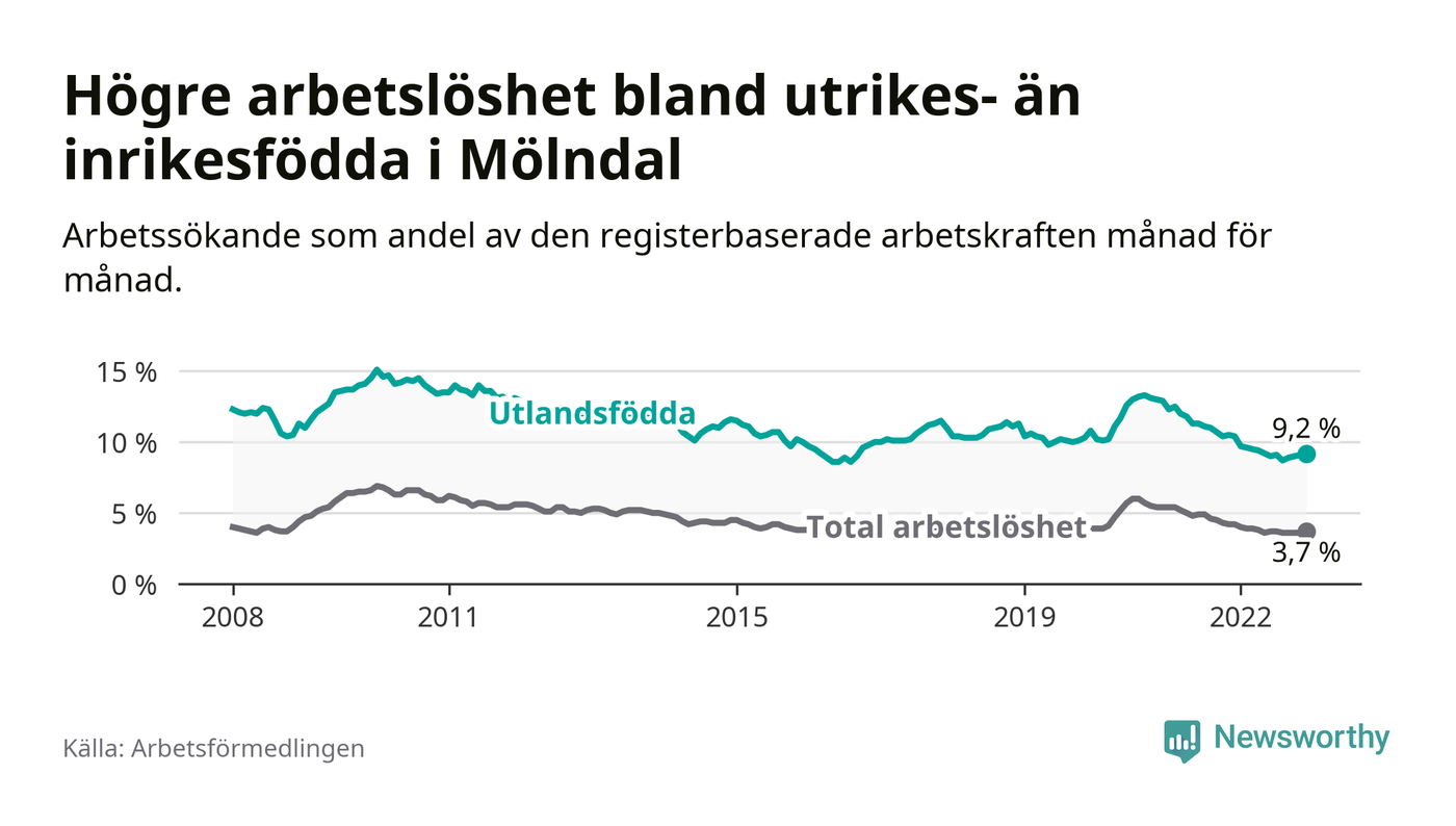 Arbetslösheten bland utlandsfödda var 9,2 procent i Mölndal under december månad, motsvarande 734 av 7 978 personer. Det är 1,2 procentenheter färre än vid samma tidpunkt i fjol (−98 om man räknar personer). Därmed är de utlandsföddas arbetslöshet lägre än vid samma tidpunkt i fjol för 20:e månaden i följd. Sedan april 2021 har arbetslösheten bland utlandsfödda minskat från 11,8 till 9,2 procent.