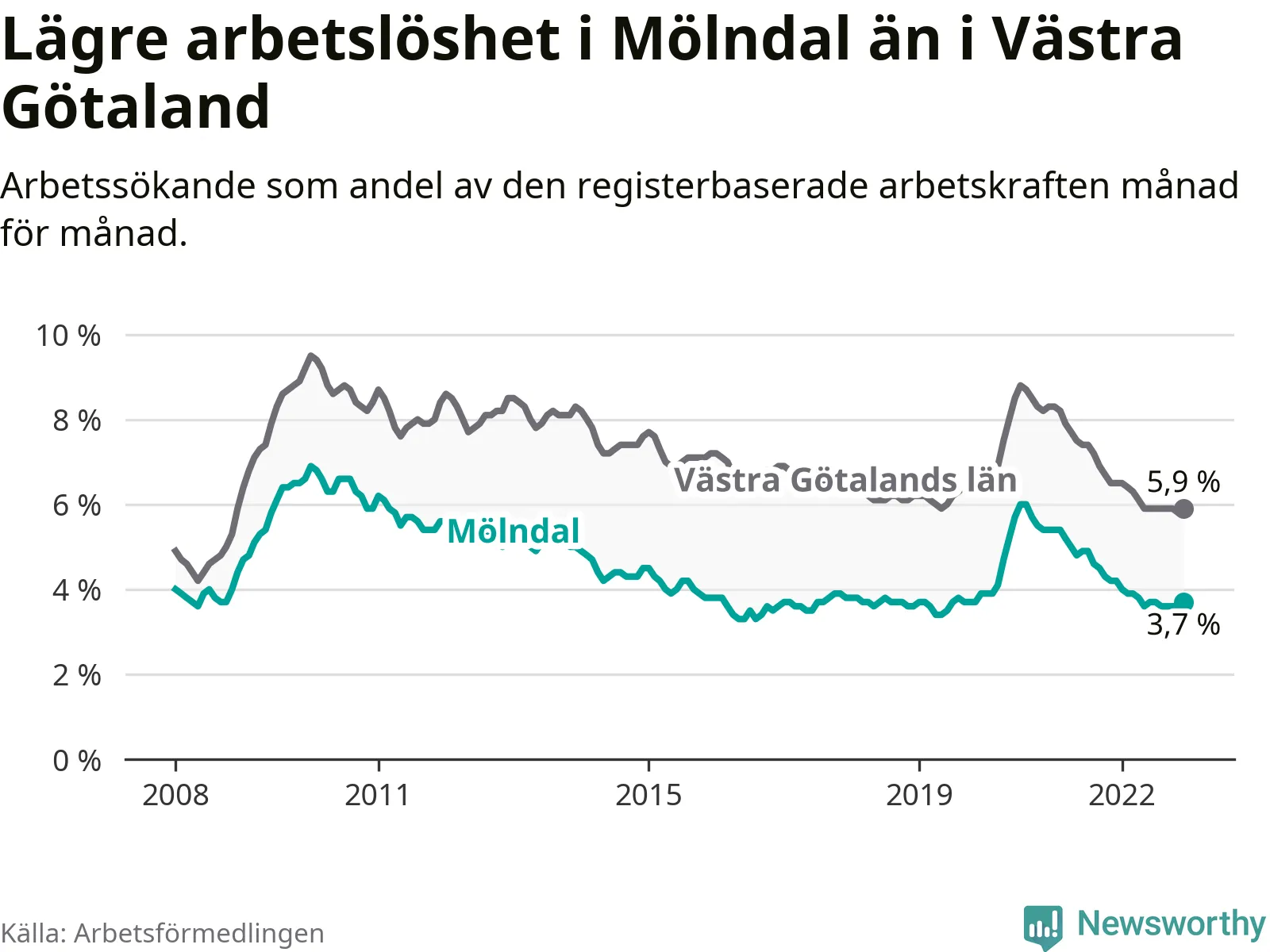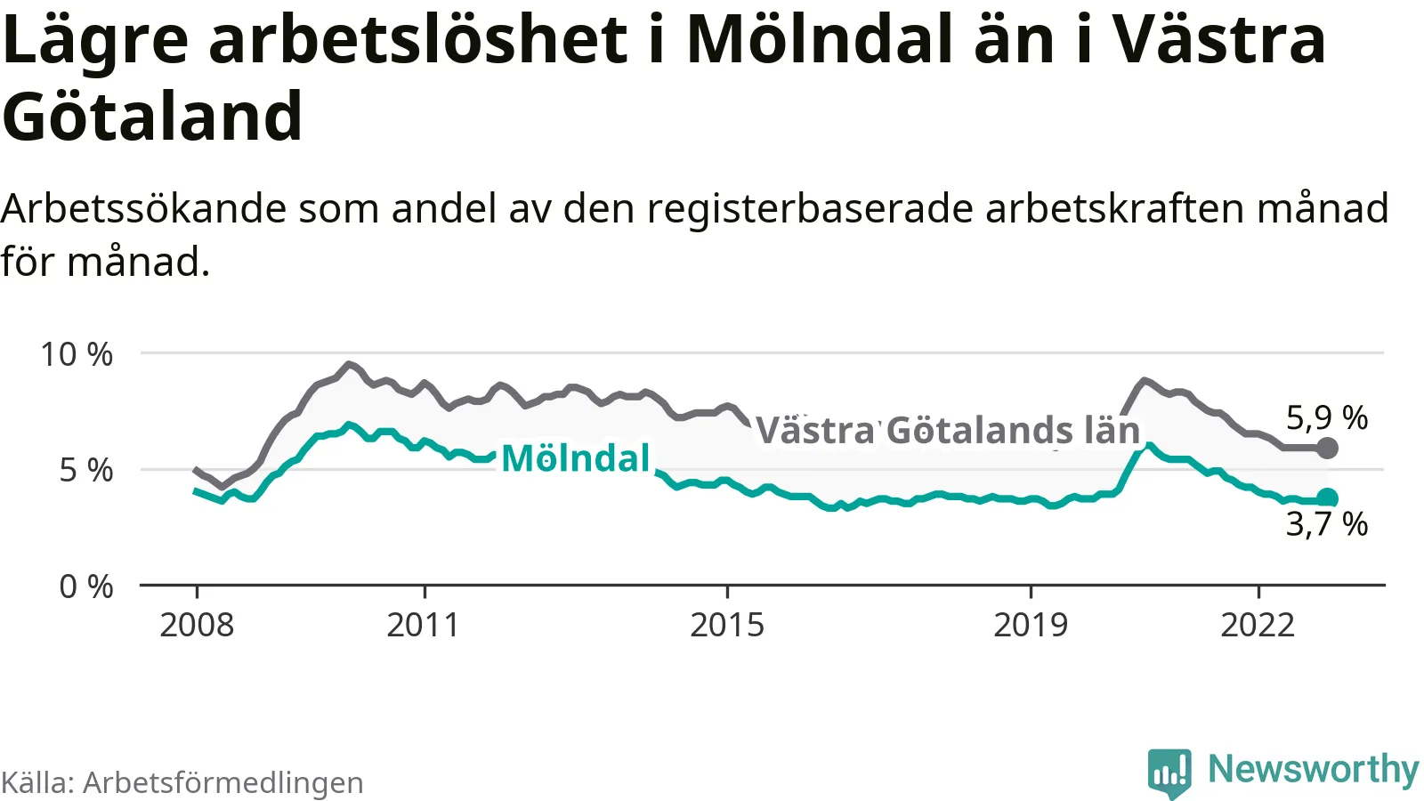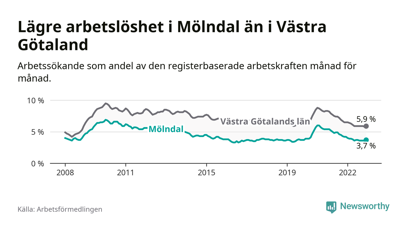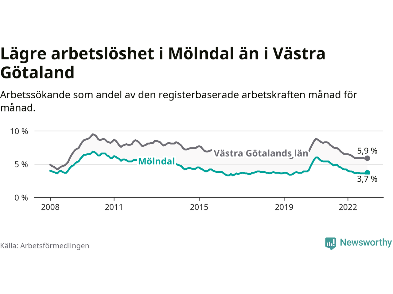 Mölndal hade redan tidigare lägre arbetslöshet än snittet i hela Västra Götalands län och nu växer klyftan (3,7 procent i kommunen, jämfört med 5,9 procent i hela länet). Tjörn och Öckerö har den lägsta arbetslösheten i länet (2,6 procent), medan Trollhättan har den högsta (9,1 procent). För att Mölndal skulle komma ner i samma arbetslöshetsnivå som Tjörn och Öckerö skulle 407 personer behöva sysselsättas.