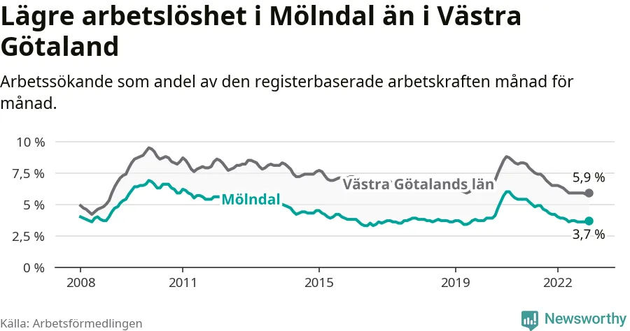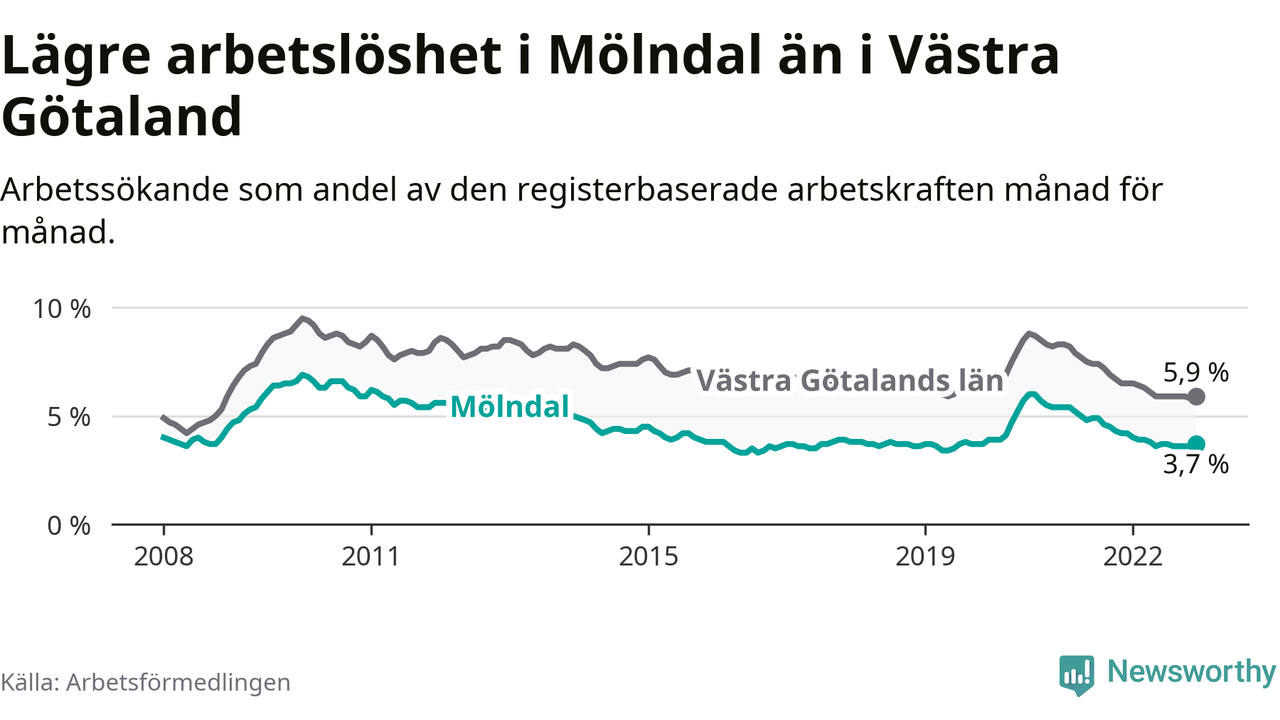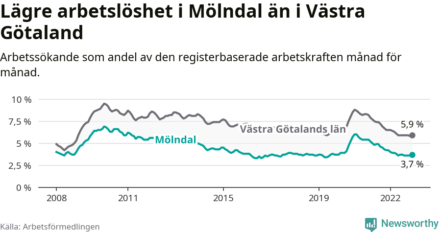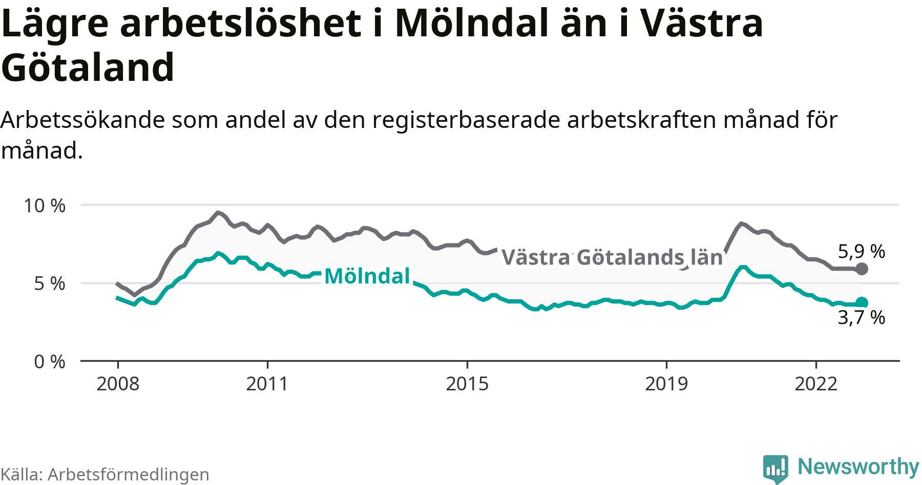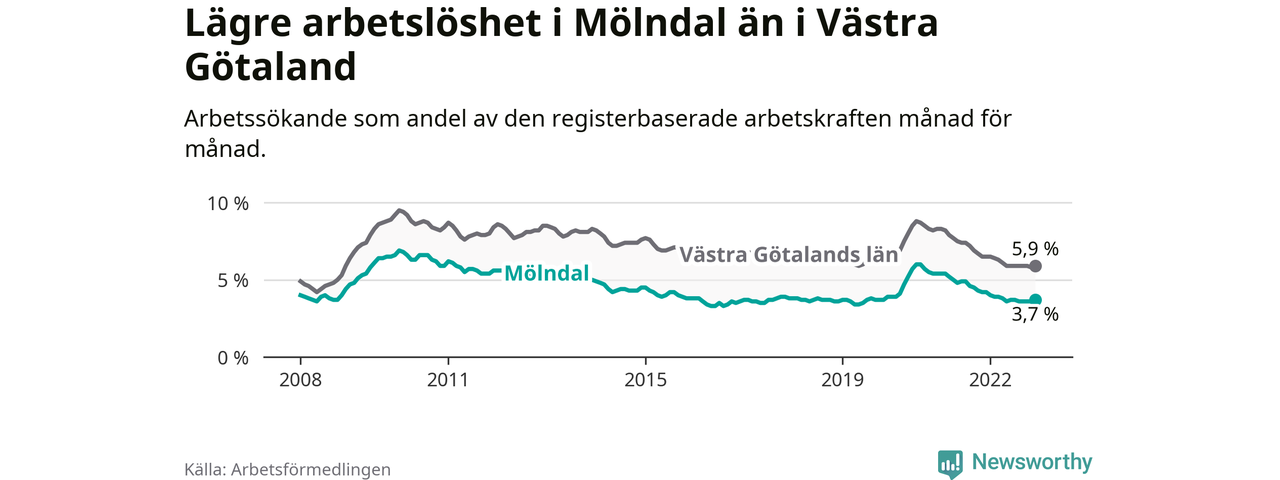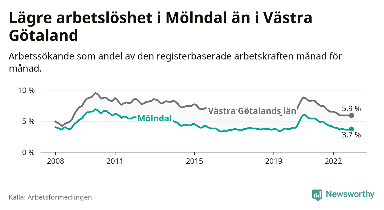 Mölndal hade redan tidigare lägre arbetslöshet än snittet i hela Västra Götalands län och nu växer klyftan (3,7 procent i kommunen, jämfört med 5,9 procent i hela länet). Tjörn och Öckerö har den lägsta arbetslösheten i länet (2,6 procent), medan Trollhättan har den högsta (9,1 procent). För att Mölndal skulle komma ner i samma arbetslöshetsnivå som Tjörn och Öckerö skulle 407 personer behöva sysselsättas.