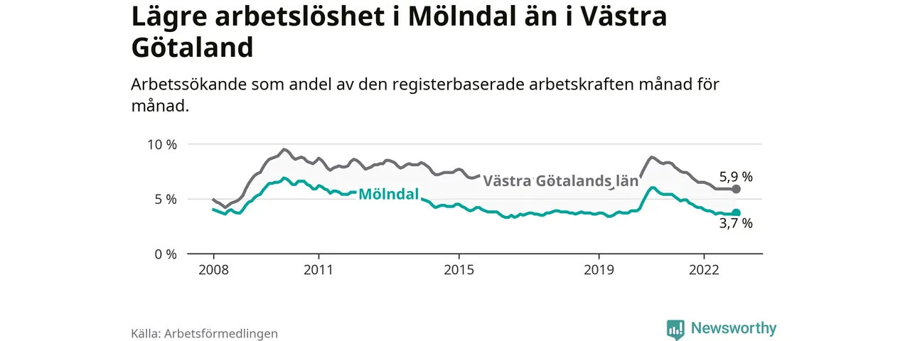 Det är 20:e månaden i följd som arbetslösheten i Mölndal är lägre än den var under samma tidpunkt året innan. Sedan april 2021 har arbetslösheten gått ner från 5,0 till 3,7 procent.