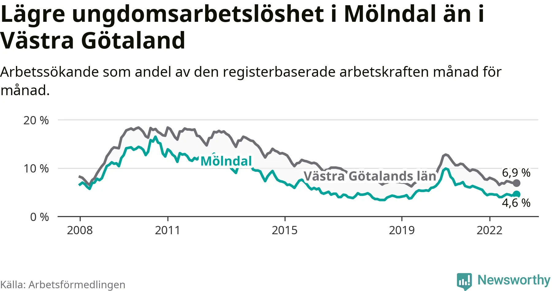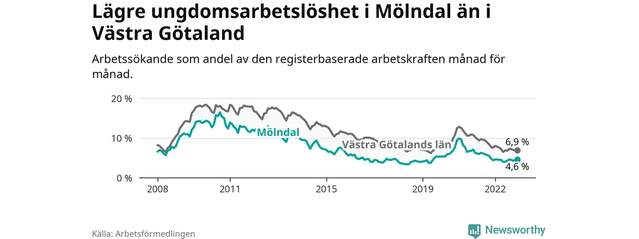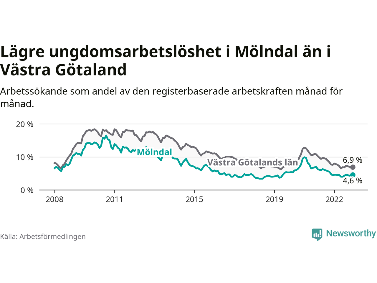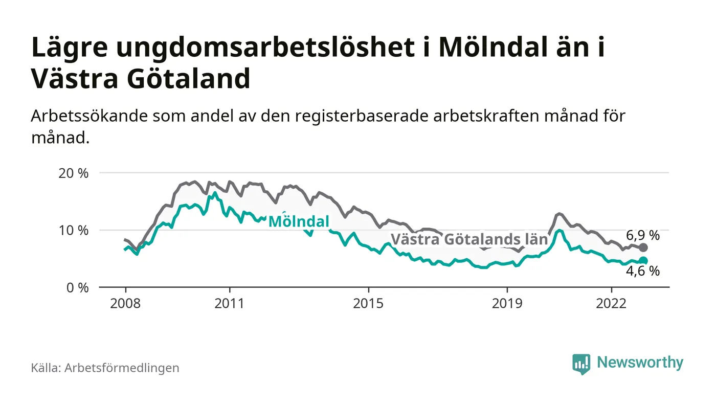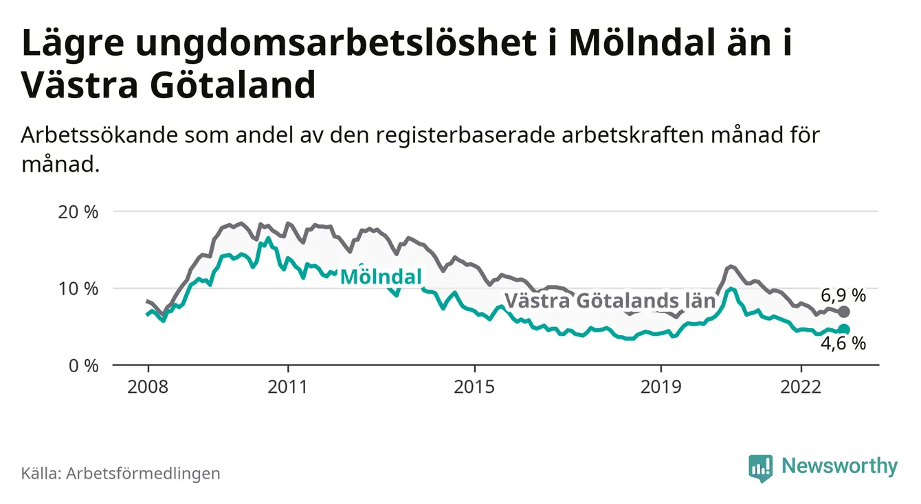 Precis som den totala arbetslösheten ligger ungdomsarbetslösheten i Mölndal lägre än i Västra Götaland som helhet. Skillnaden mellan kommunen och länet är 2,3 procentenheter.