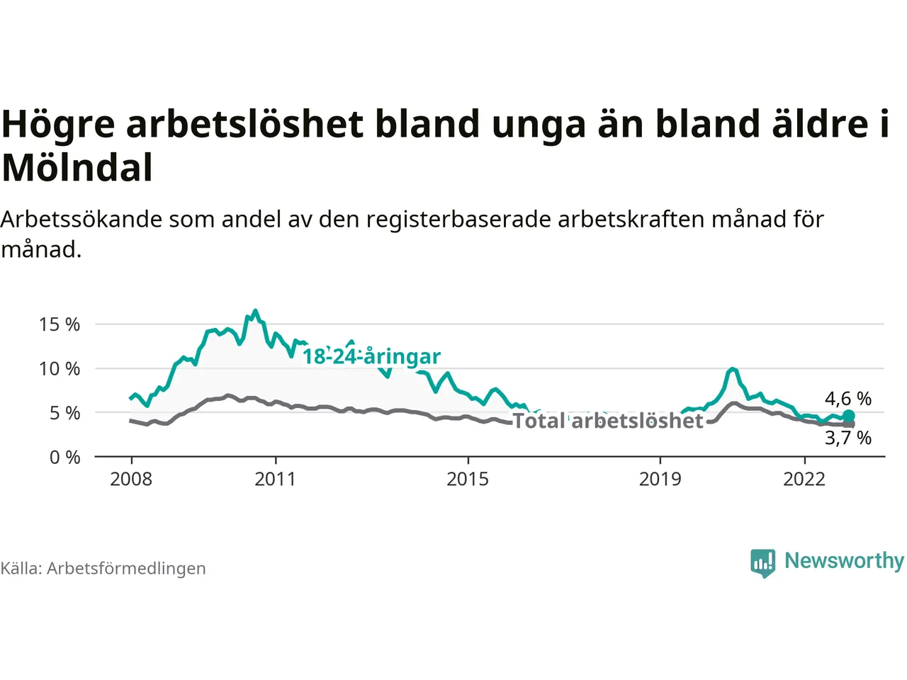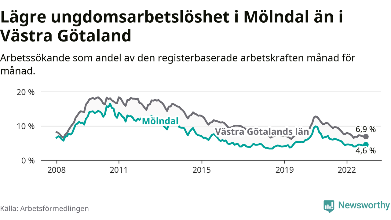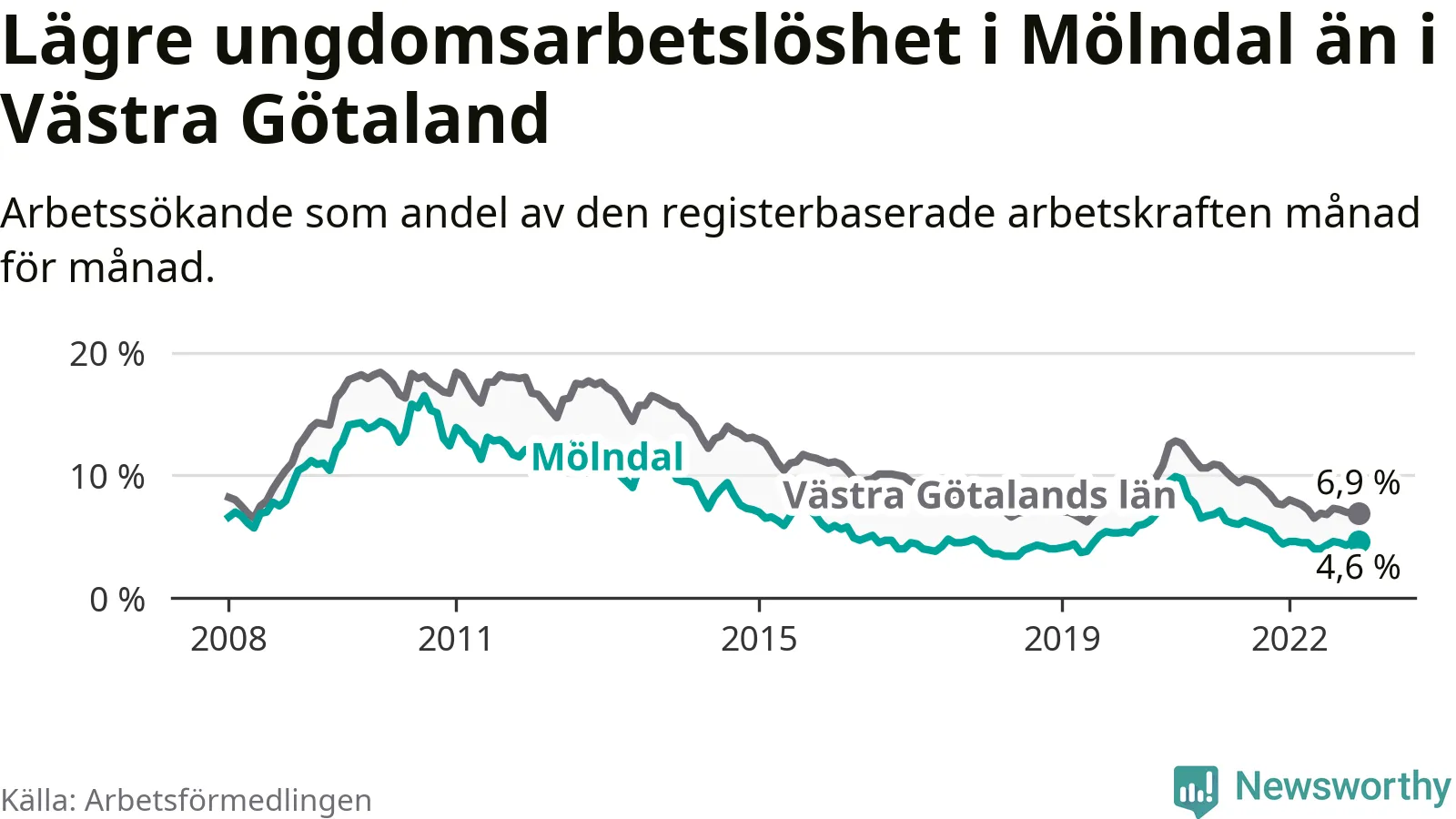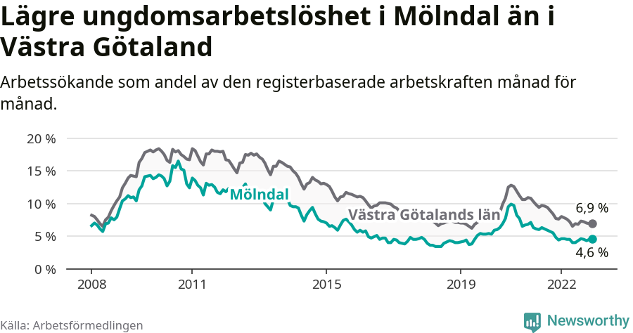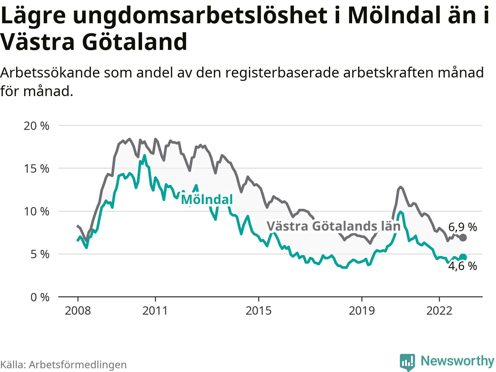 Precis som den totala arbetslösheten ligger ungdomsarbetslösheten i Mölndal lägre än i Västra Götaland som helhet. Skillnaden mellan kommunen och länet är 2,3 procentenheter.