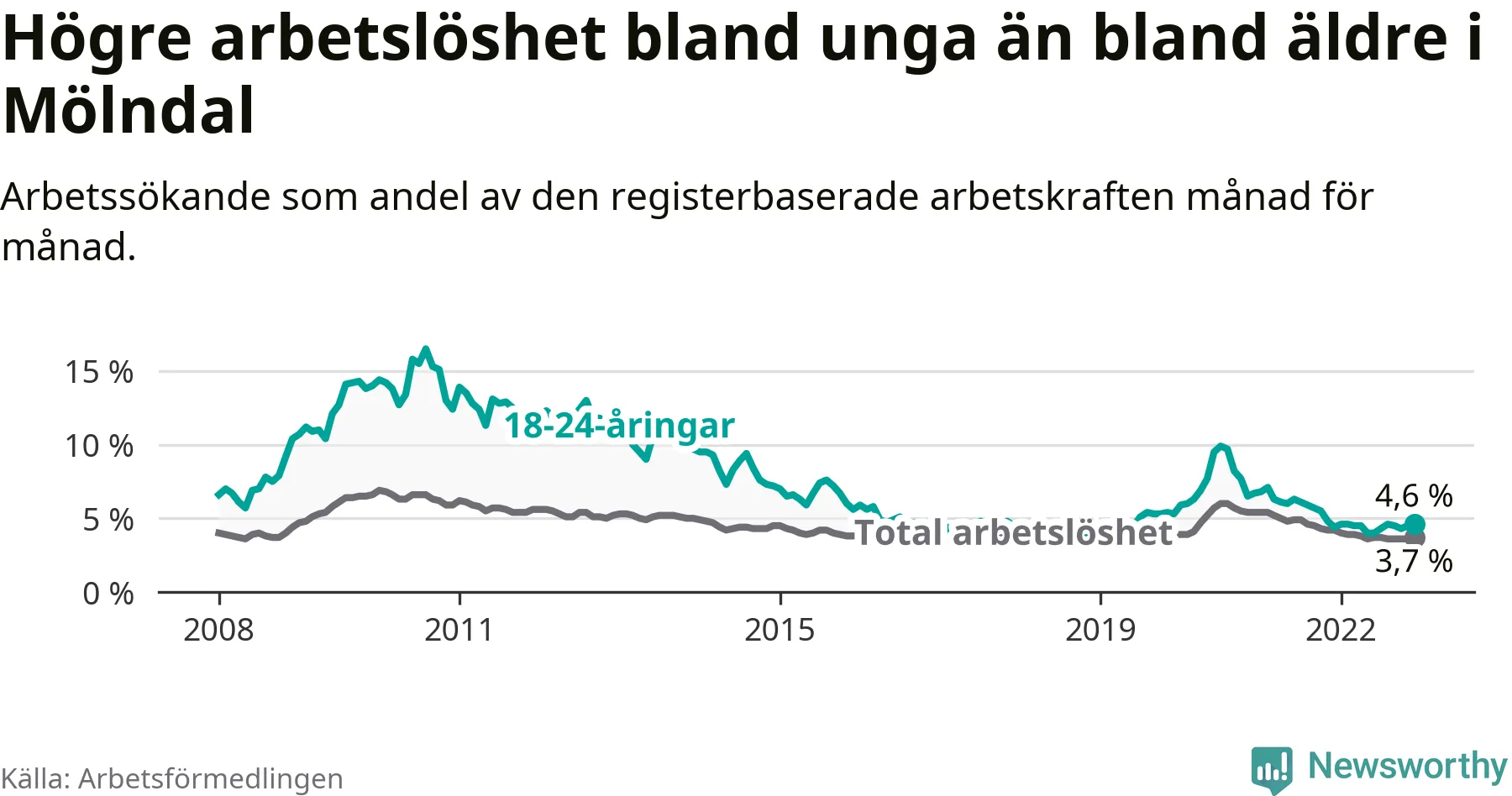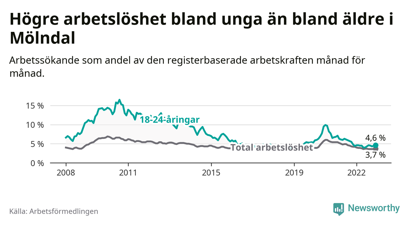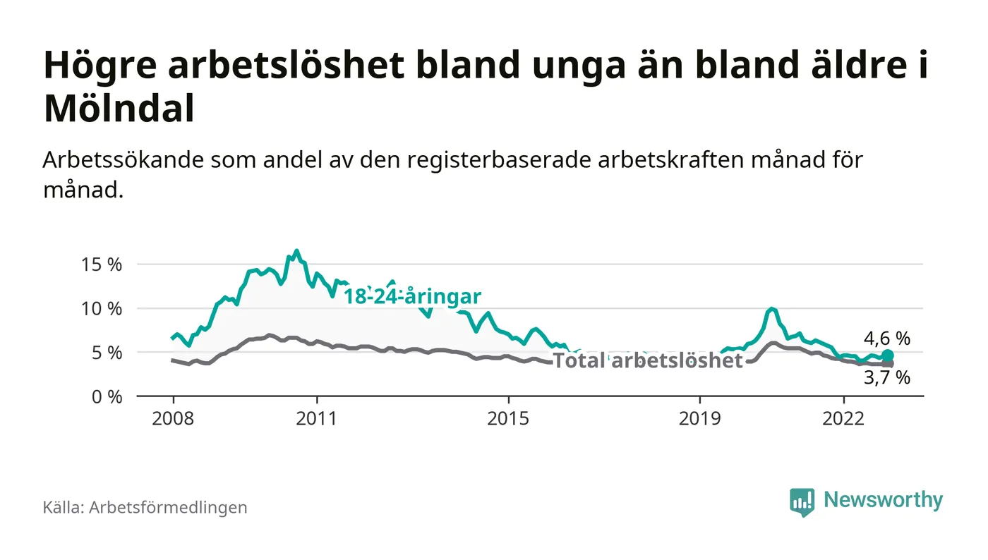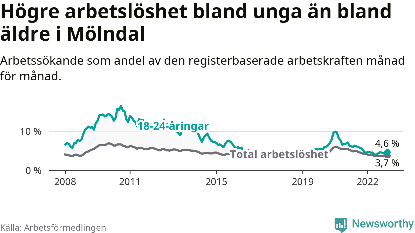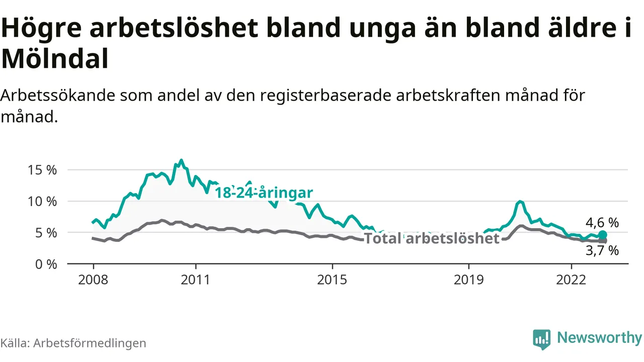 Precis som den totala arbetslösheten ligger ungdomsarbetslösheten i Mölndal lägre än i Västra Götaland som helhet. Skillnaden mellan kommunen och länet är 2,3 procentenheter.