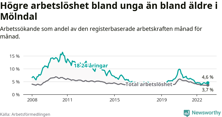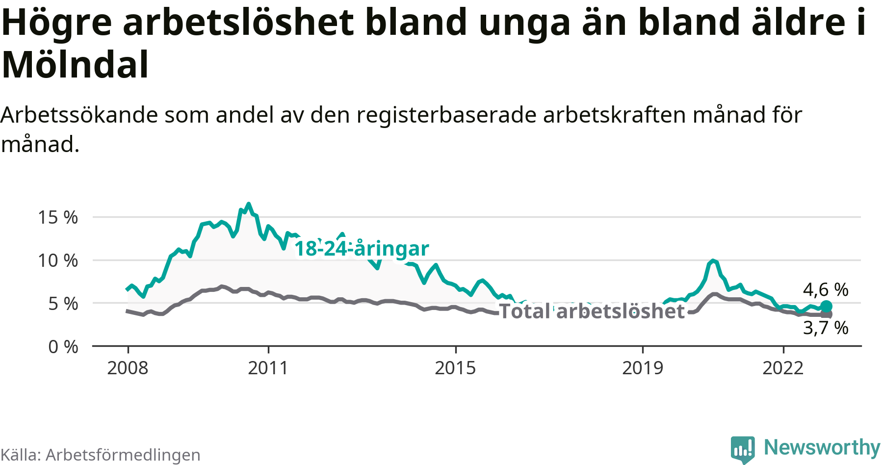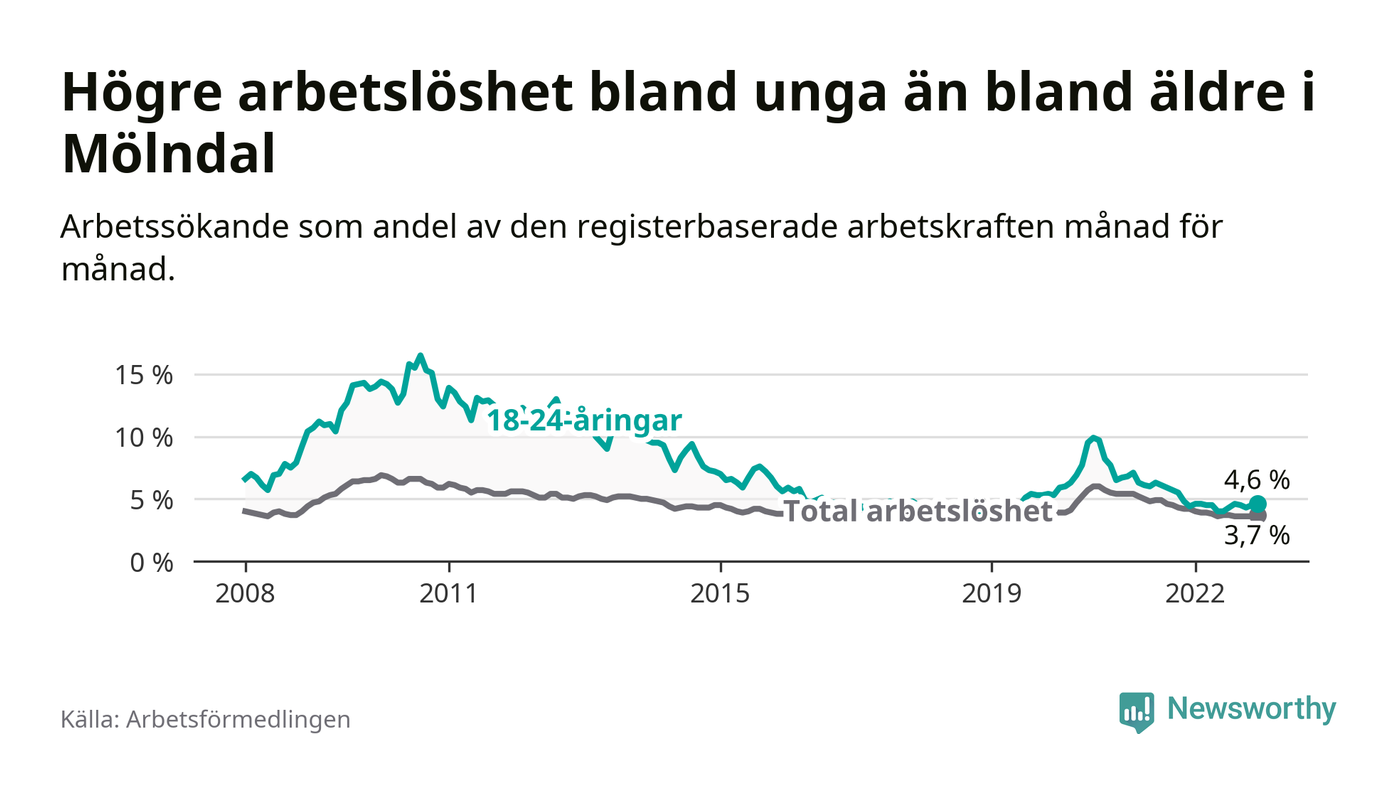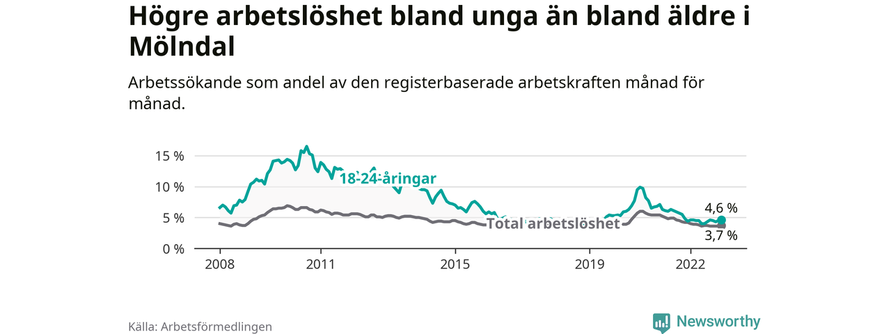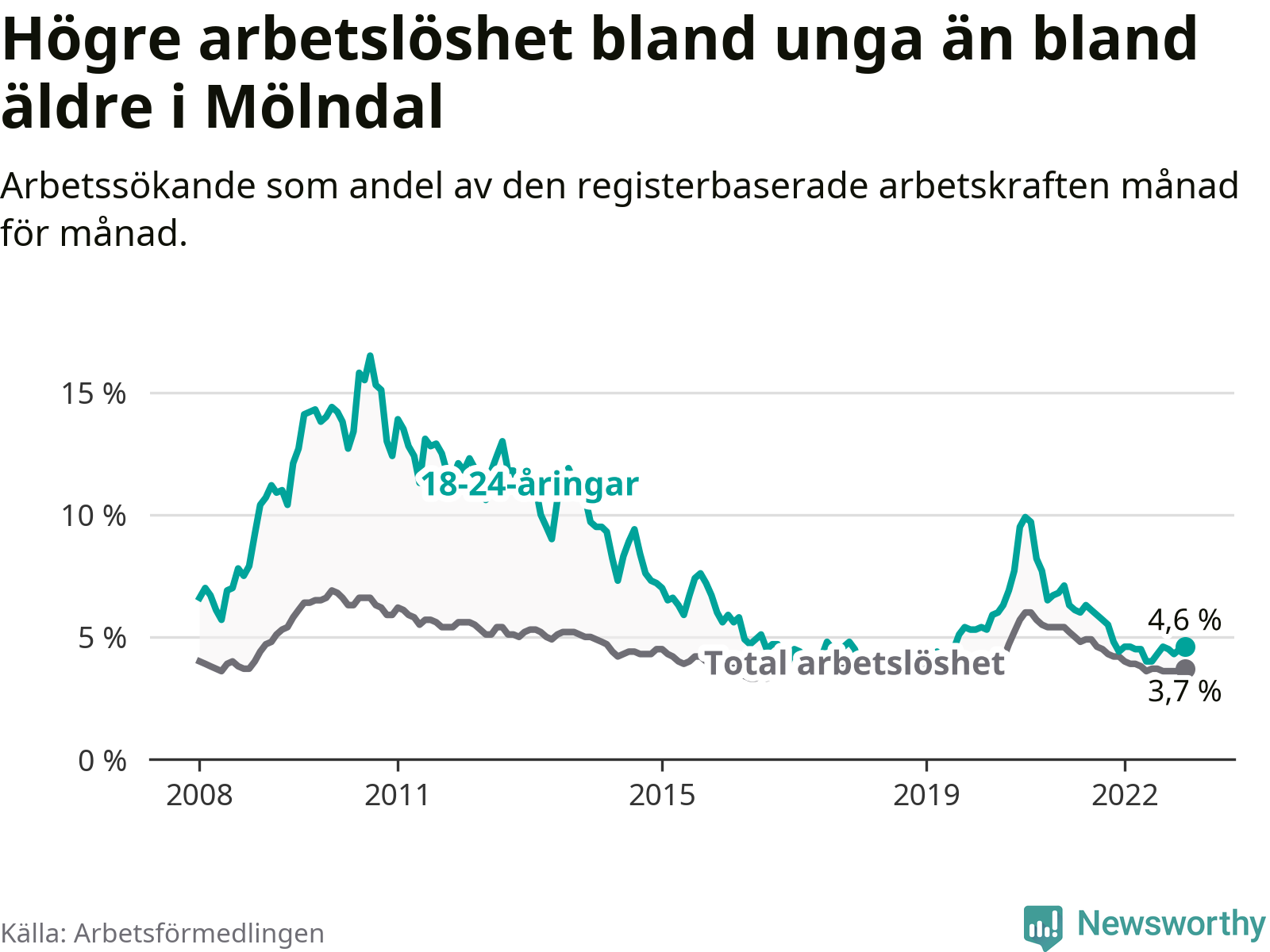 Precis som den totala arbetslösheten ligger ungdomsarbetslösheten i Mölndal lägre än i Västra Götaland som helhet. Skillnaden mellan kommunen och länet är 2,3 procentenheter.