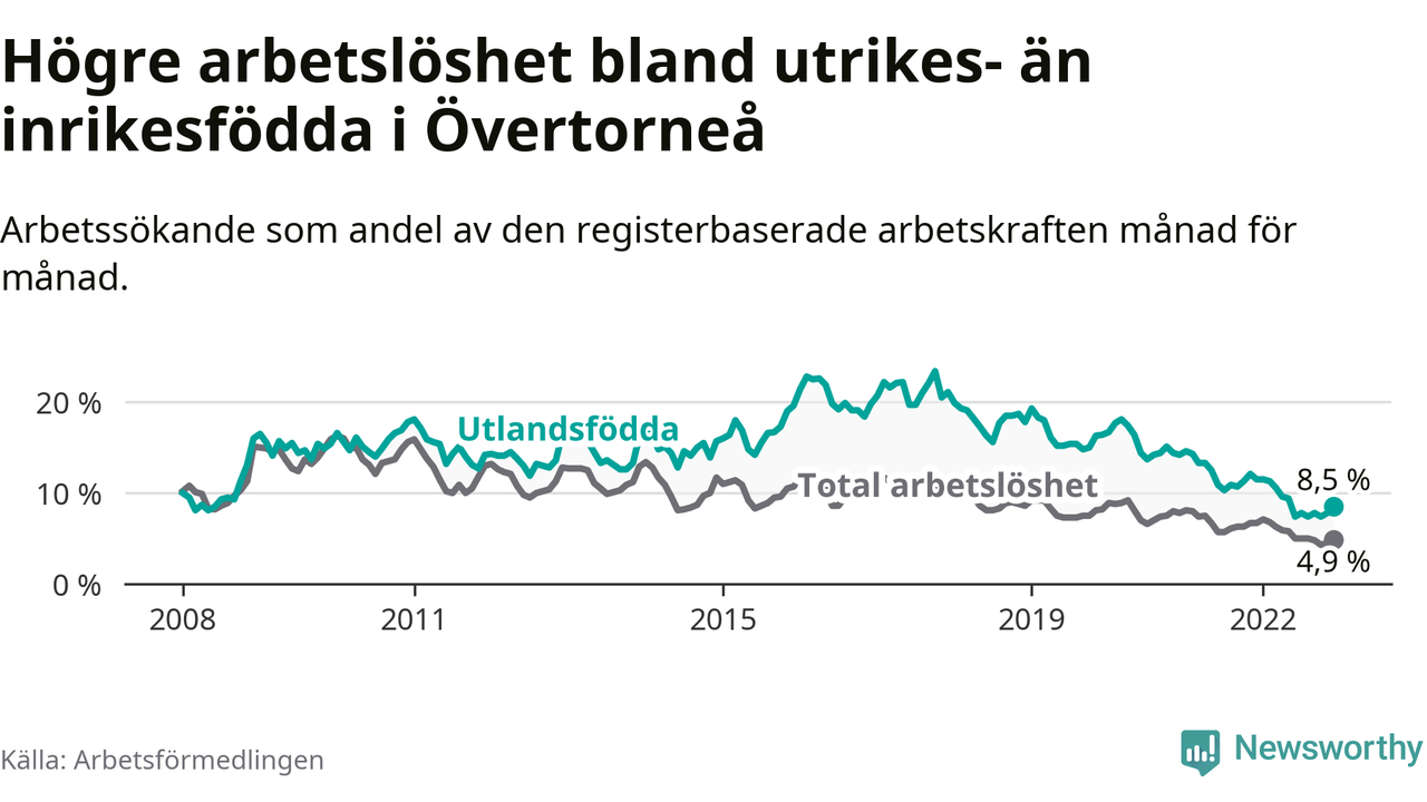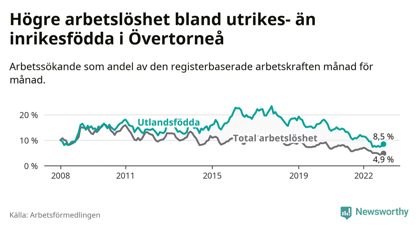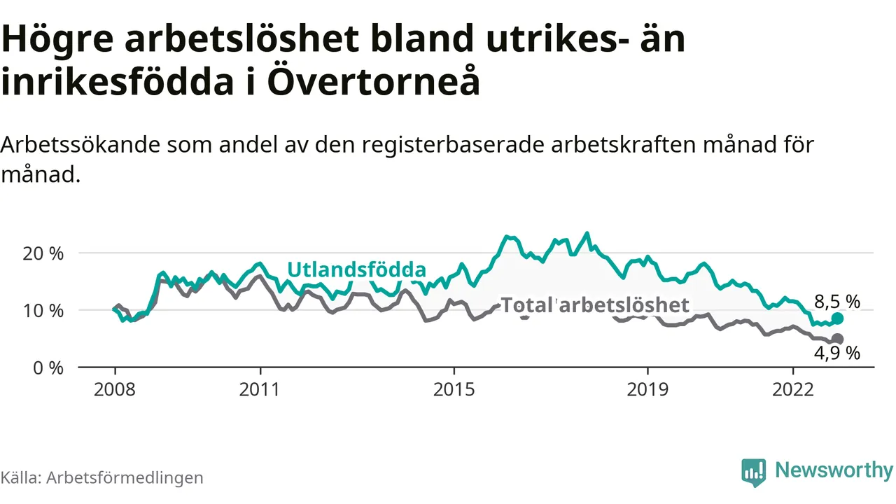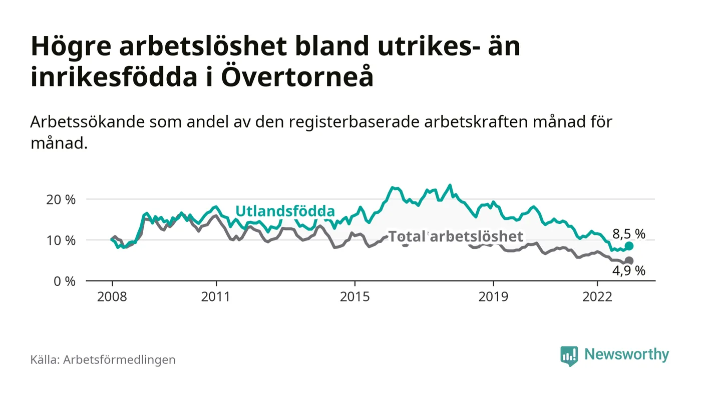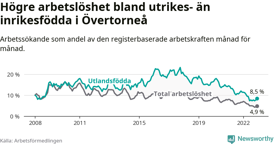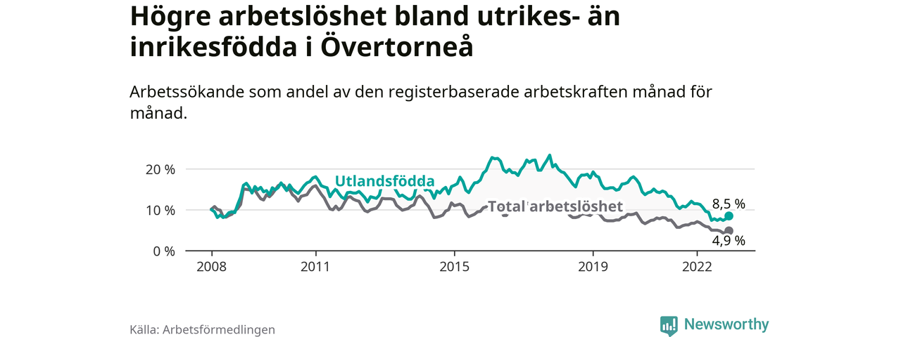 Arbetslösheten bland utlandsfödda var 8,5 procent i Övertorneå under december månad, motsvarande 35 av 412 personer. Det är 3,0 procentenheter färre än vid samma tidpunkt i fjol (−15 om man räknar personer). Därmed har de utlandsföddas arbetslöshet varit lägre än vid samma tidpunkt i fjol i över två år i sträck. Sedan oktober 2020 har arbetslösheten bland utlandsfödda minskat från 15,1 till 8,5 procent.