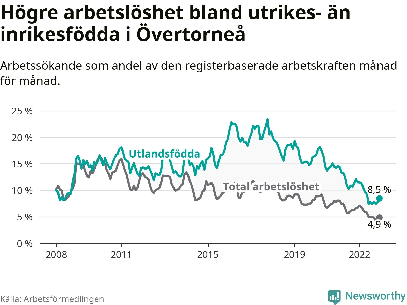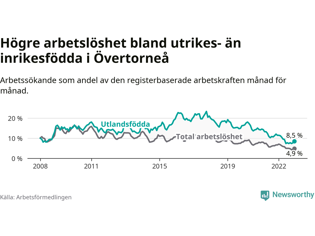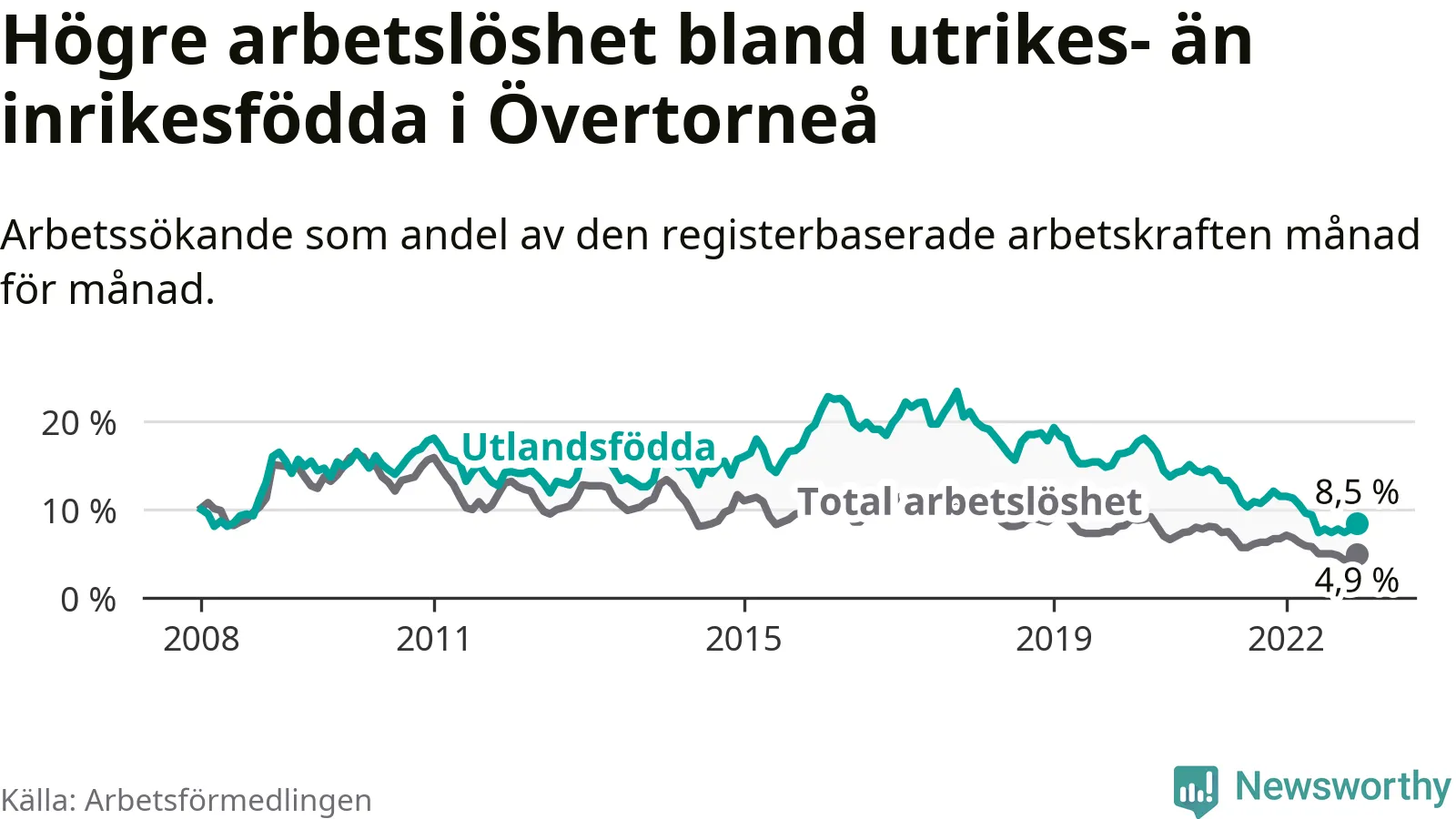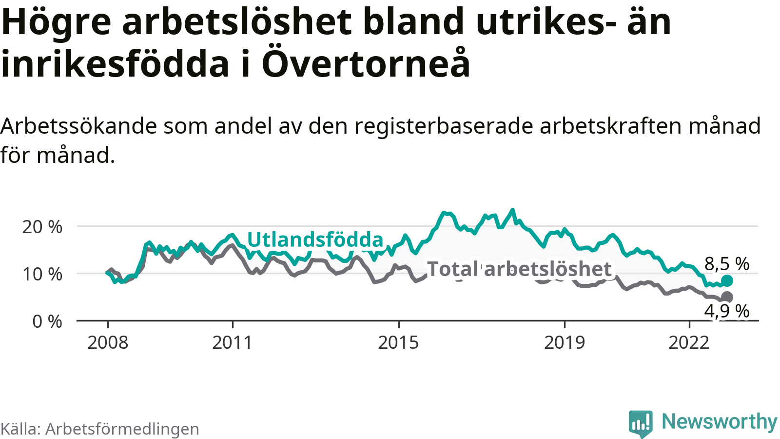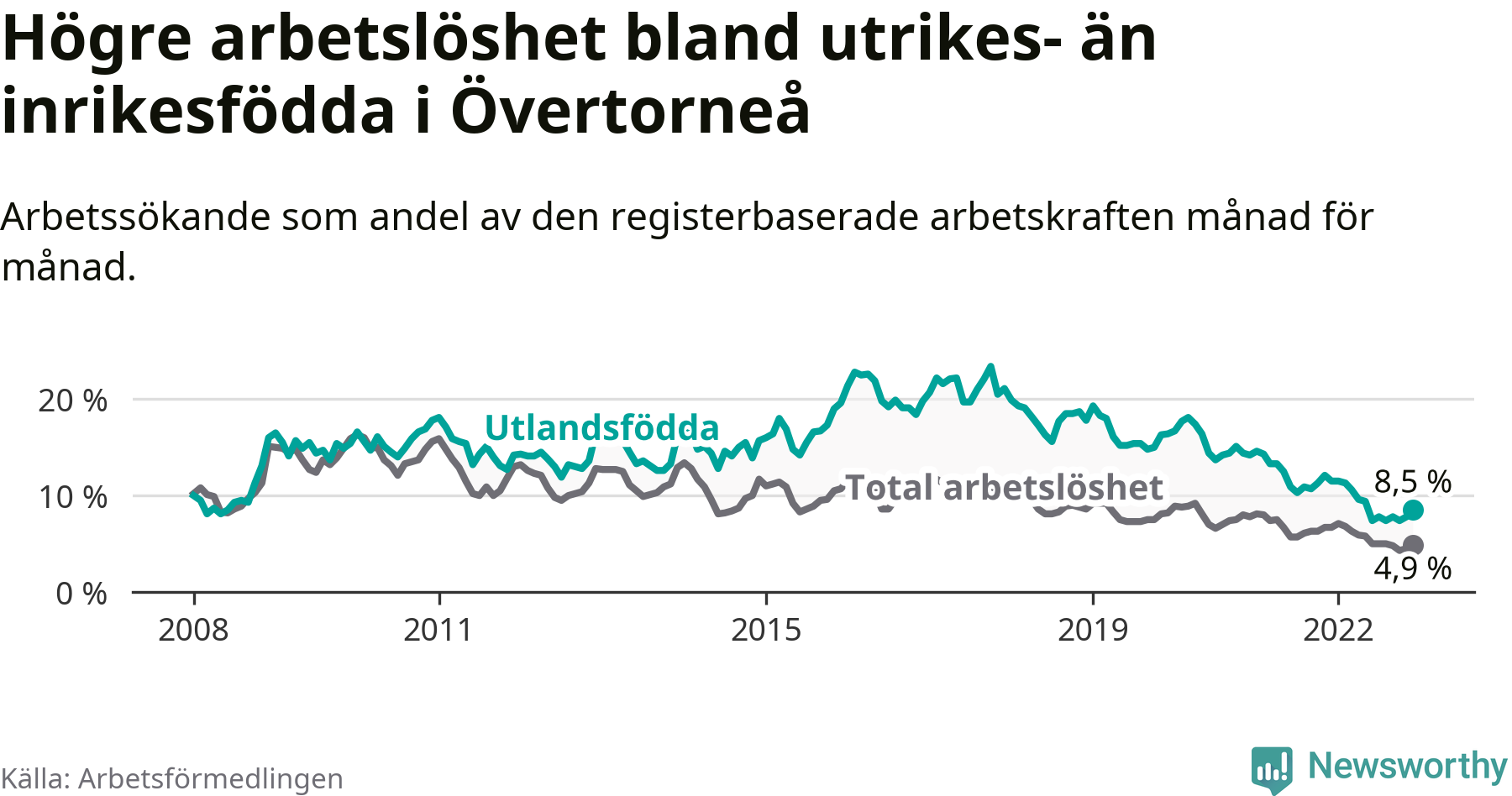 Arbetslösheten bland utlandsfödda var 8,5 procent i Övertorneå under december månad, motsvarande 35 av 412 personer. Det är 3,0 procentenheter färre än vid samma tidpunkt i fjol (−15 om man räknar personer). Därmed har de utlandsföddas arbetslöshet varit lägre än vid samma tidpunkt i fjol i över två år i sträck. Sedan oktober 2020 har arbetslösheten bland utlandsfödda minskat från 15,1 till 8,5 procent.