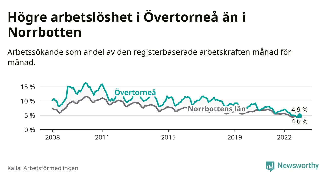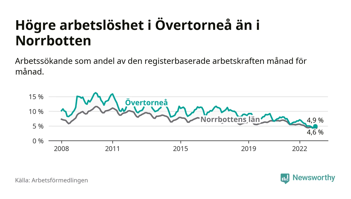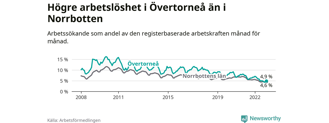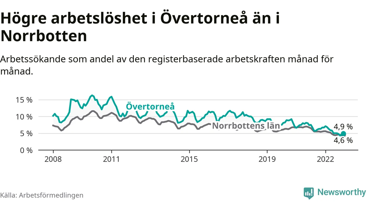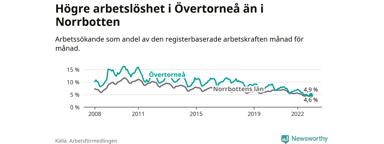 Det är 26:e månaden i följd som arbetslösheten i Övertorneå är lägre än den var under samma tidpunkt året innan. Sedan oktober 2020 har arbetslösheten gått ner från 7,5 till 4,9 procent.