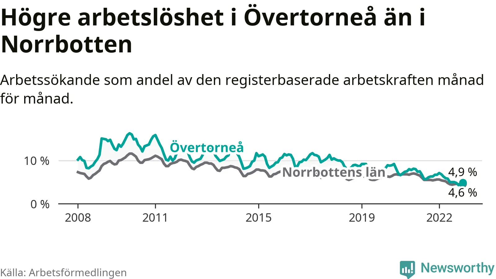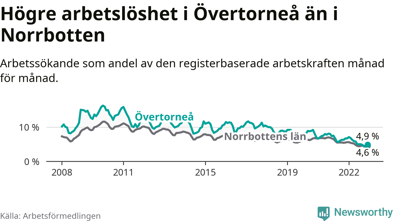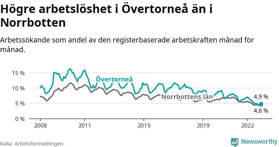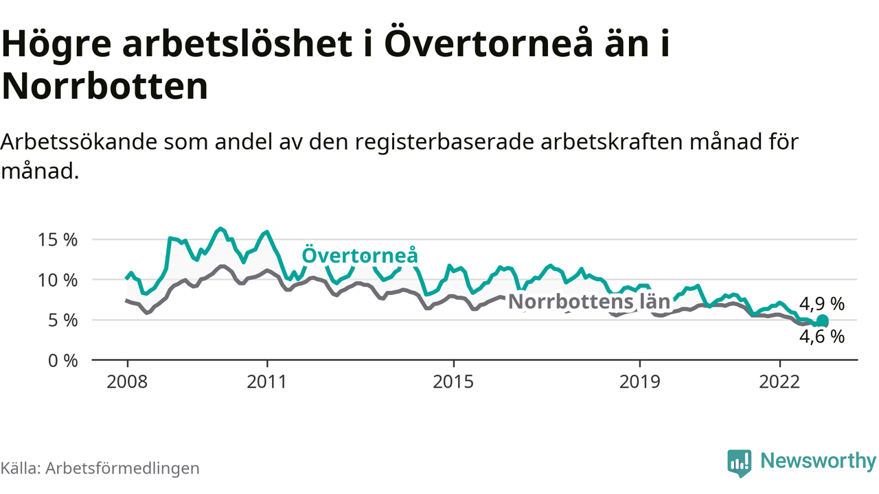Det är 26:e månaden i följd som arbetslösheten i Övertorneå är lägre än den var under samma tidpunkt året innan. Sedan oktober 2020 har arbetslösheten gått ner från 7,5 till 4,9 procent.