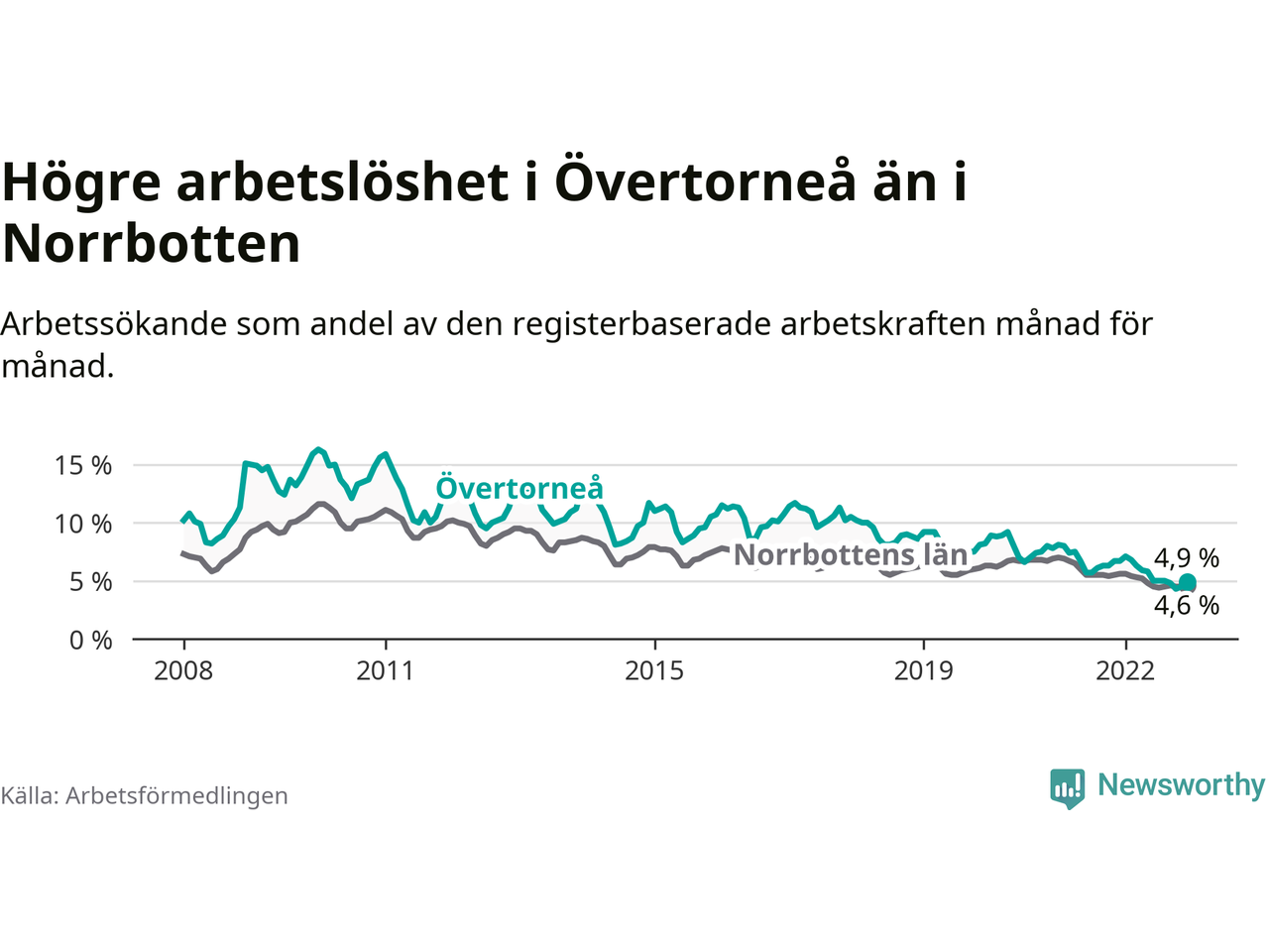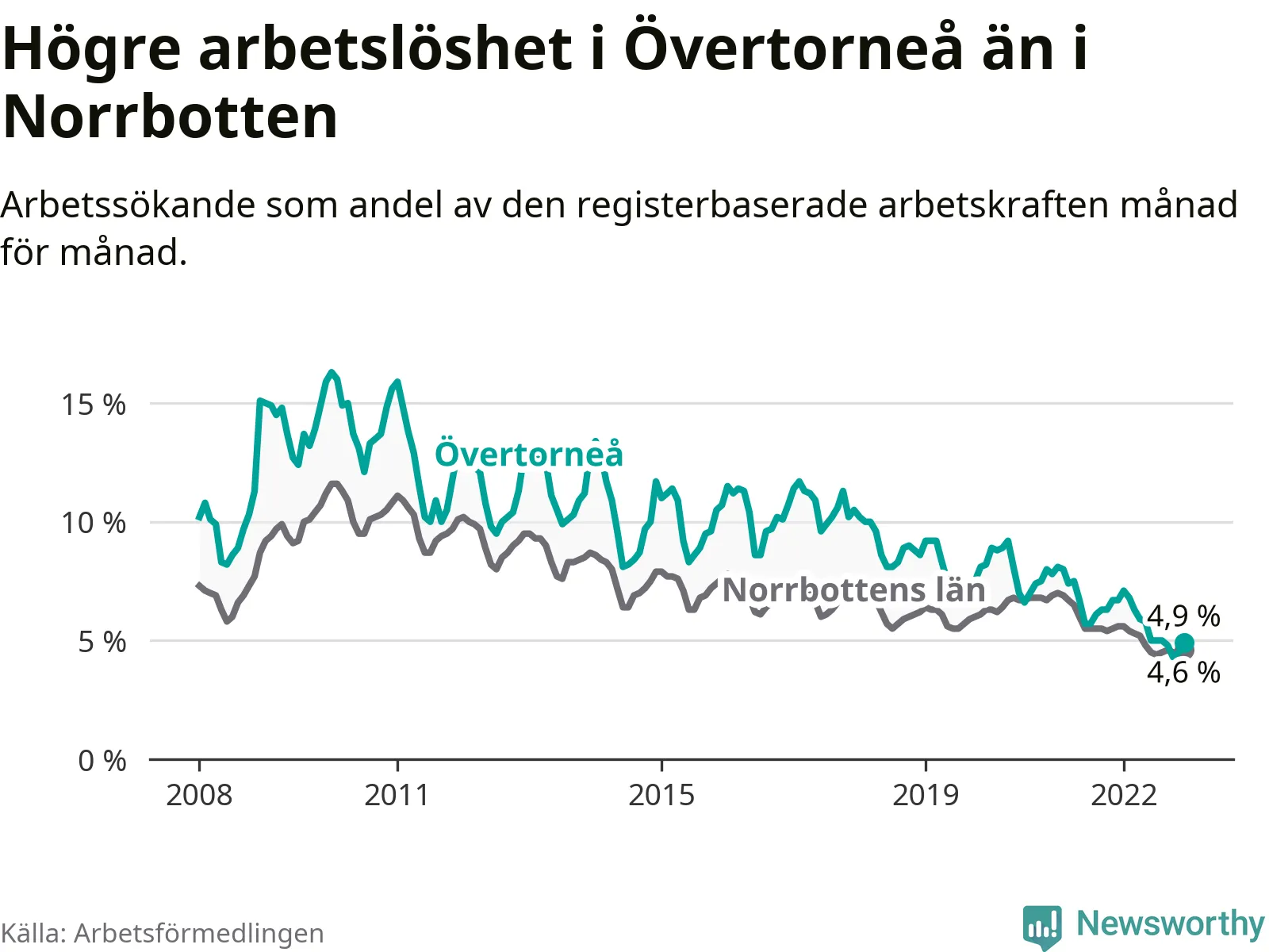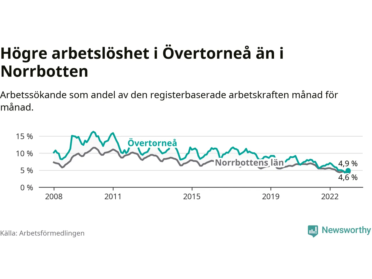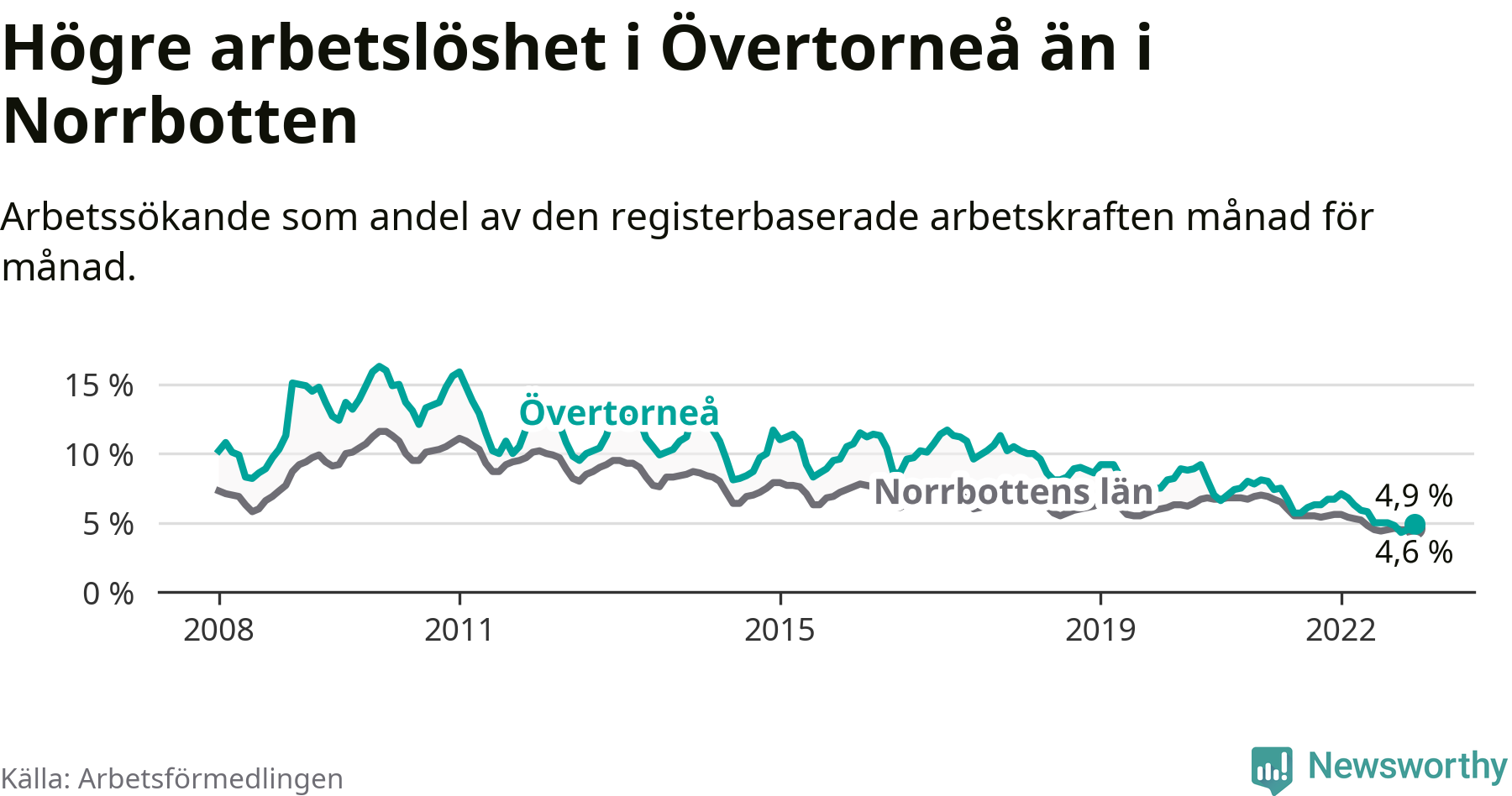 Det är 26:e månaden i följd som arbetslösheten i Övertorneå är lägre än den var under samma tidpunkt året innan. Sedan oktober 2020 har arbetslösheten gått ner från 7,5 till 4,9 procent.