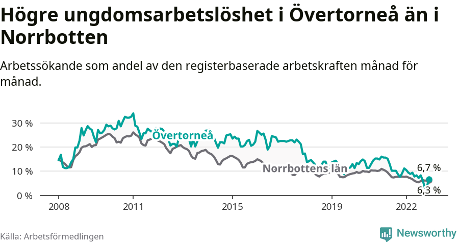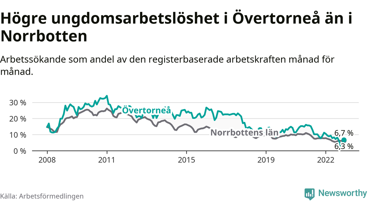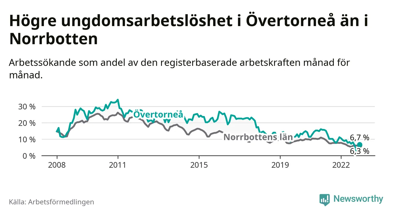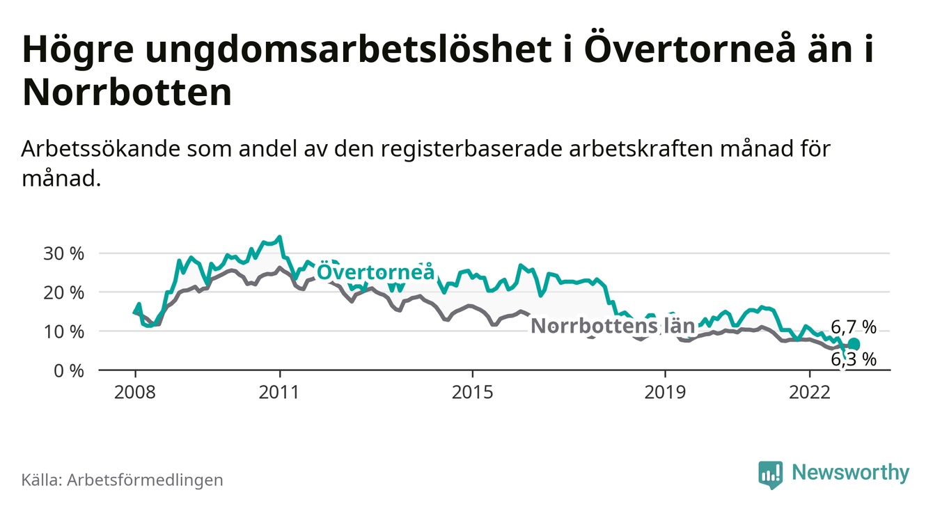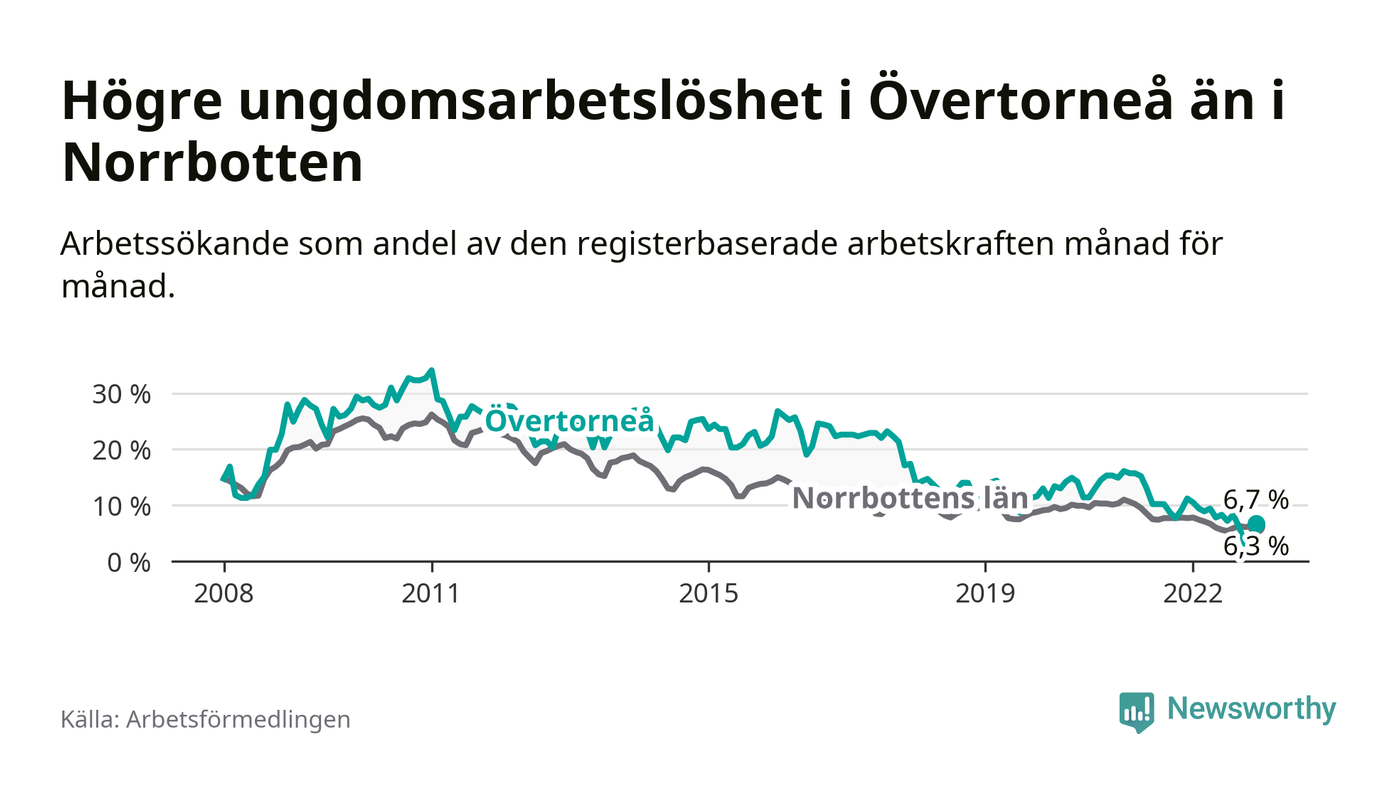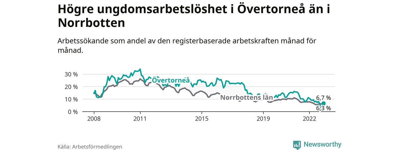 Precis som den totala arbetslösheten ligger ungdomsarbetslösheten i Övertorneå högre än i Norrbotten som helhet. Skillnaden mellan kommunen och länet är 0,4 procentenheter.