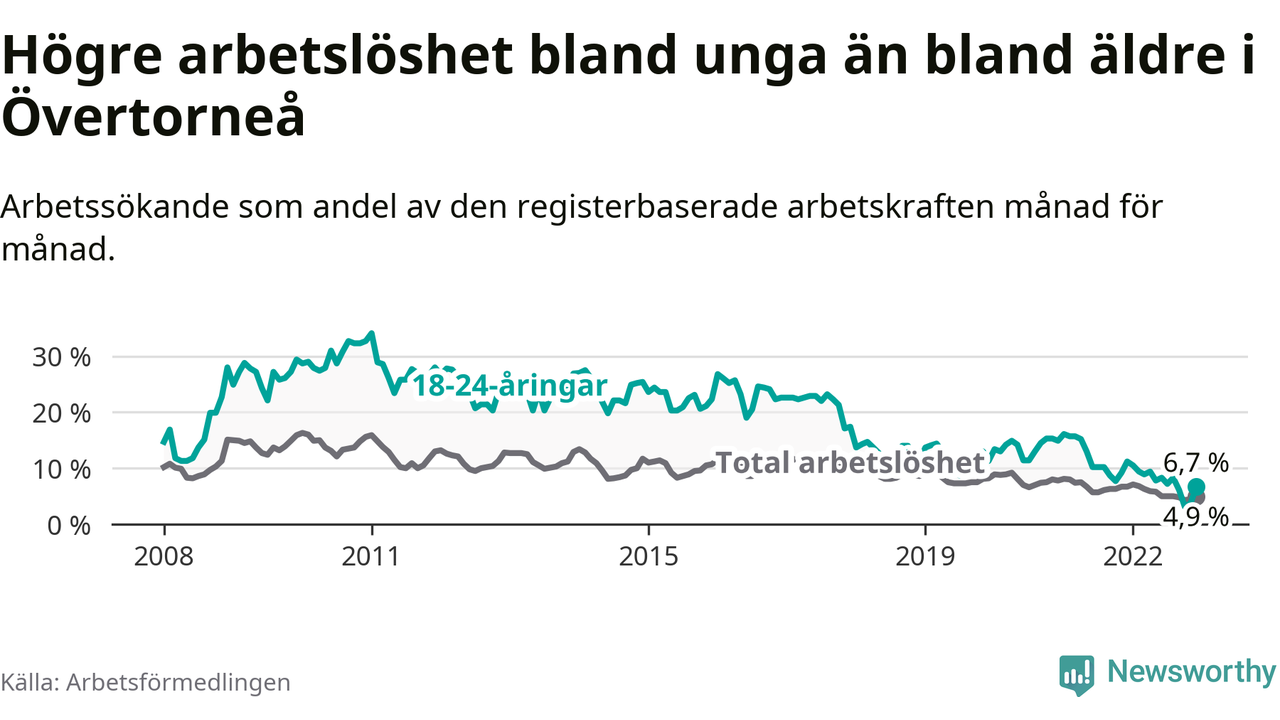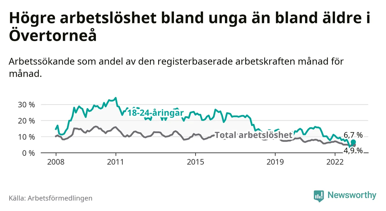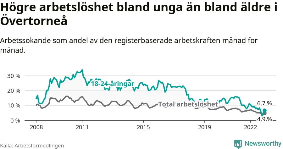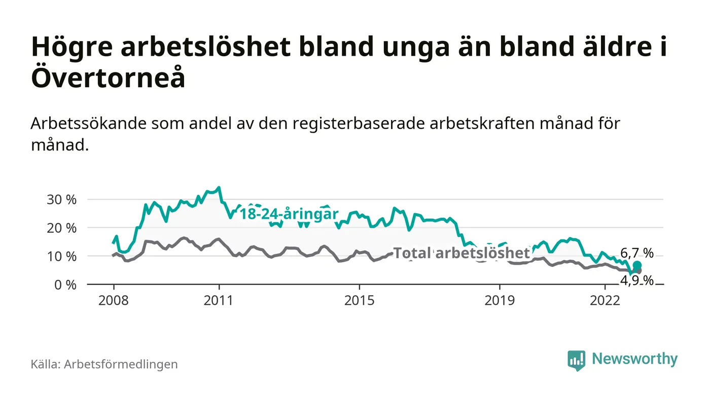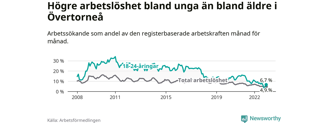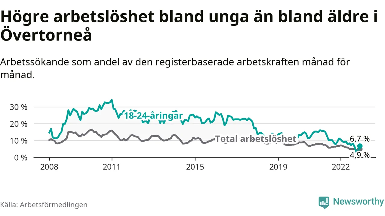 Precis som den totala arbetslösheten ligger ungdomsarbetslösheten i Övertorneå högre än i Norrbotten som helhet. Skillnaden mellan kommunen och länet är 0,4 procentenheter.