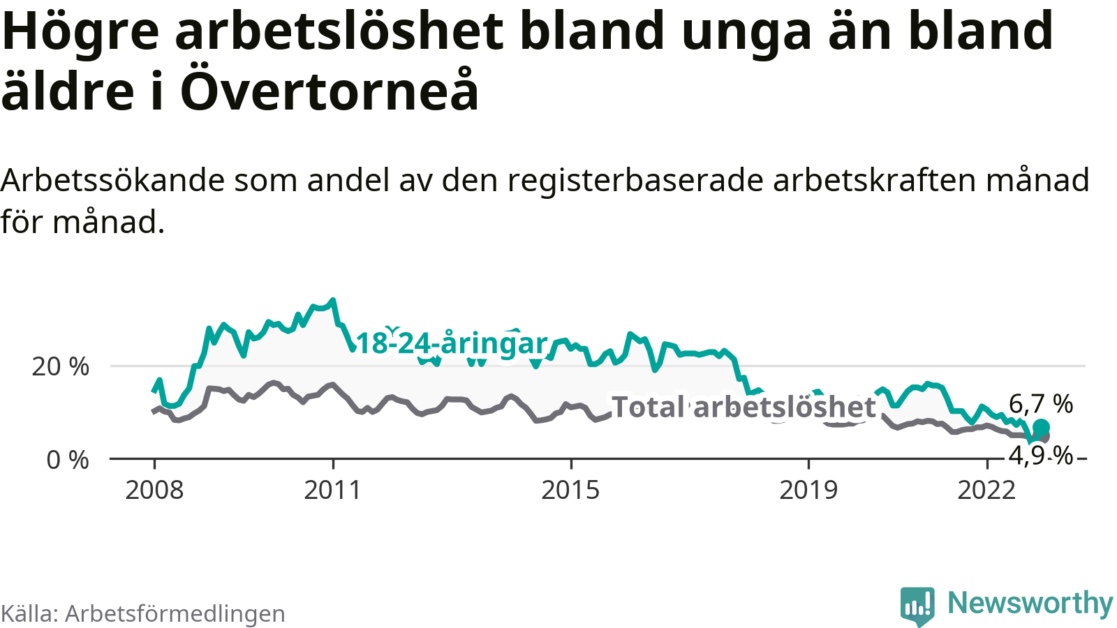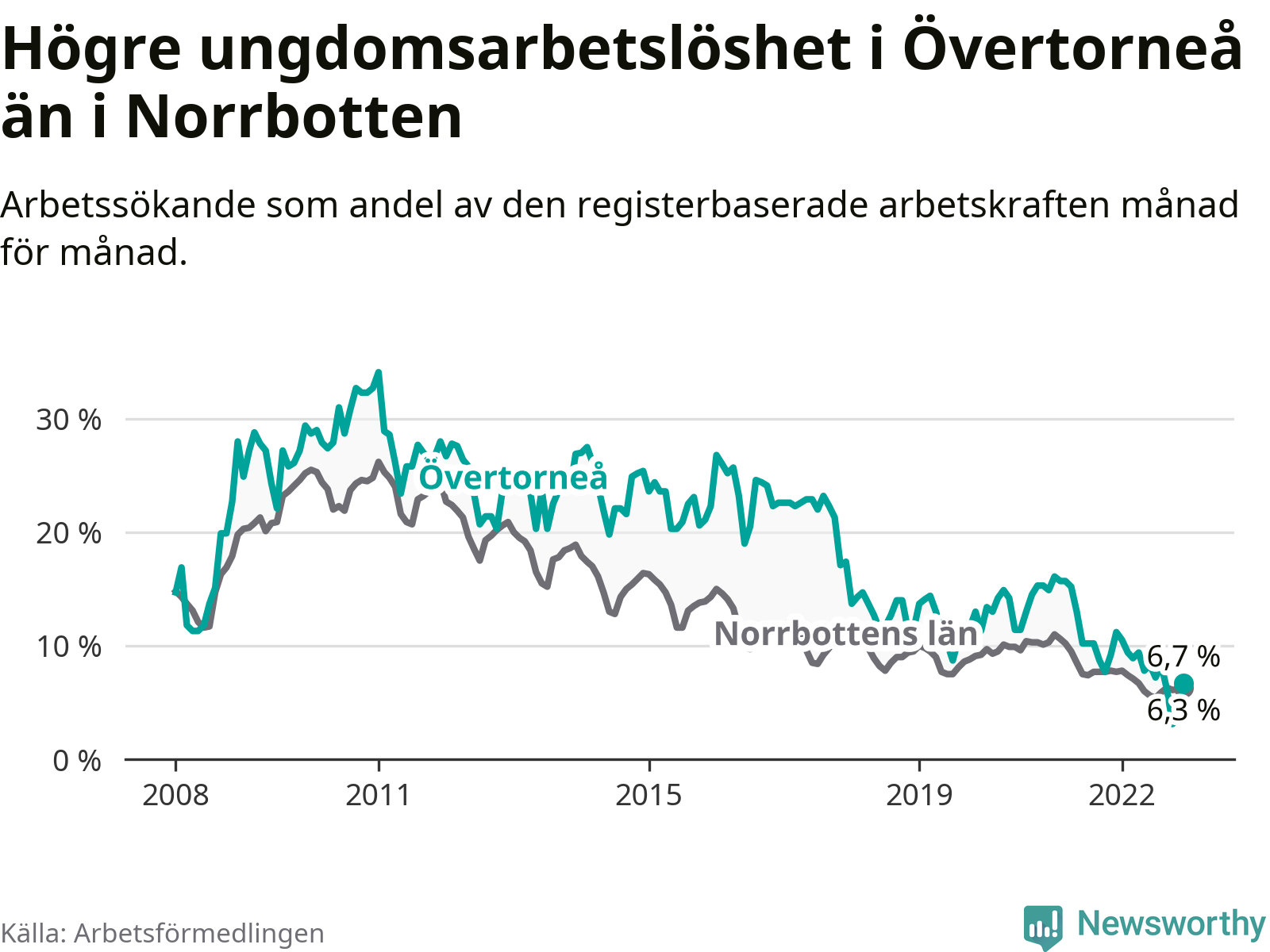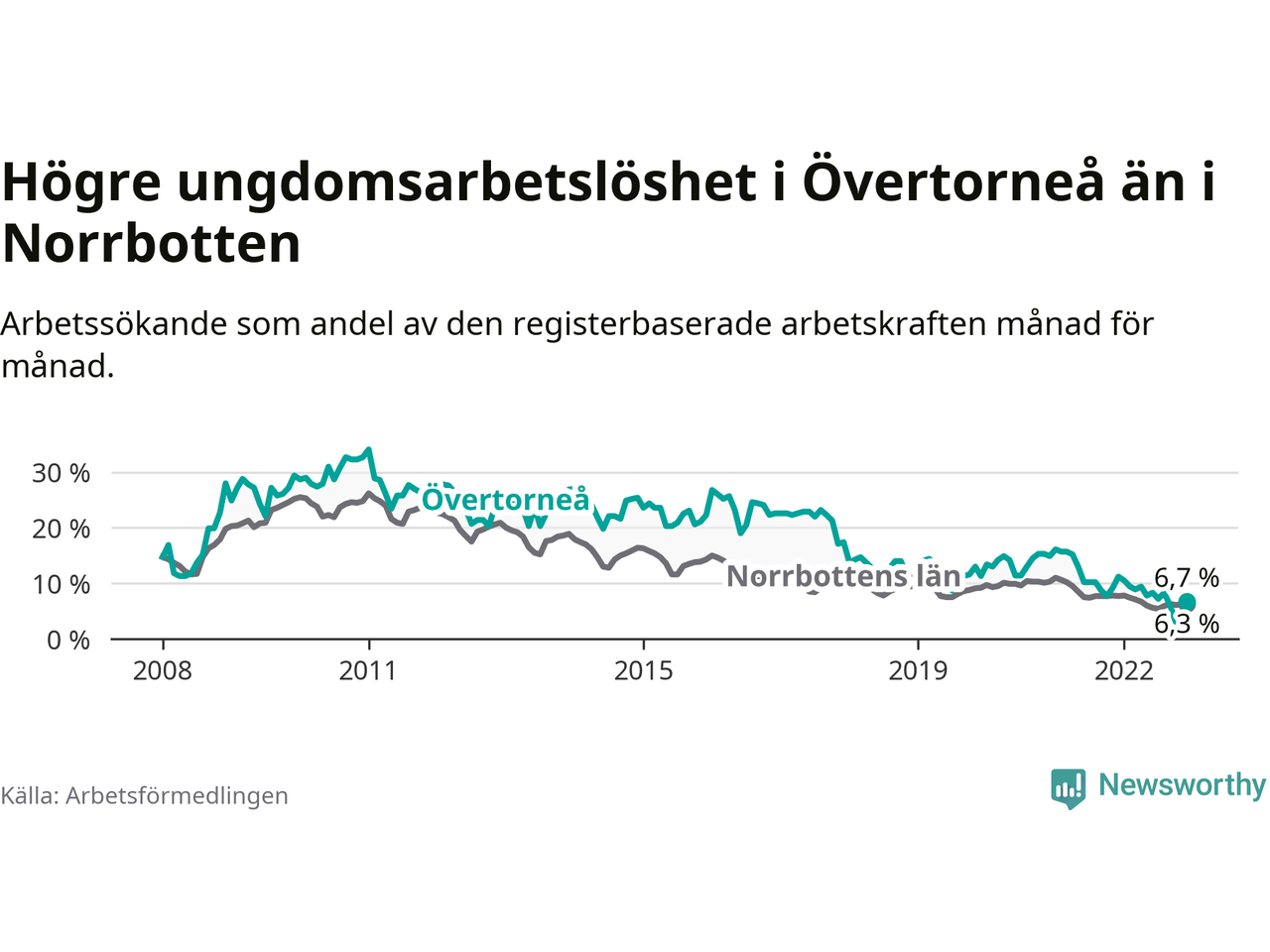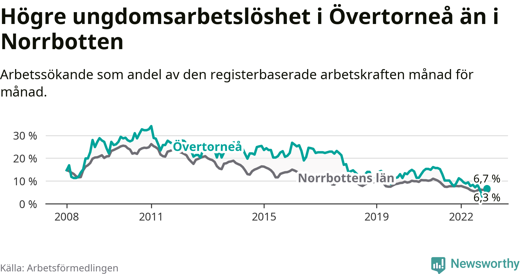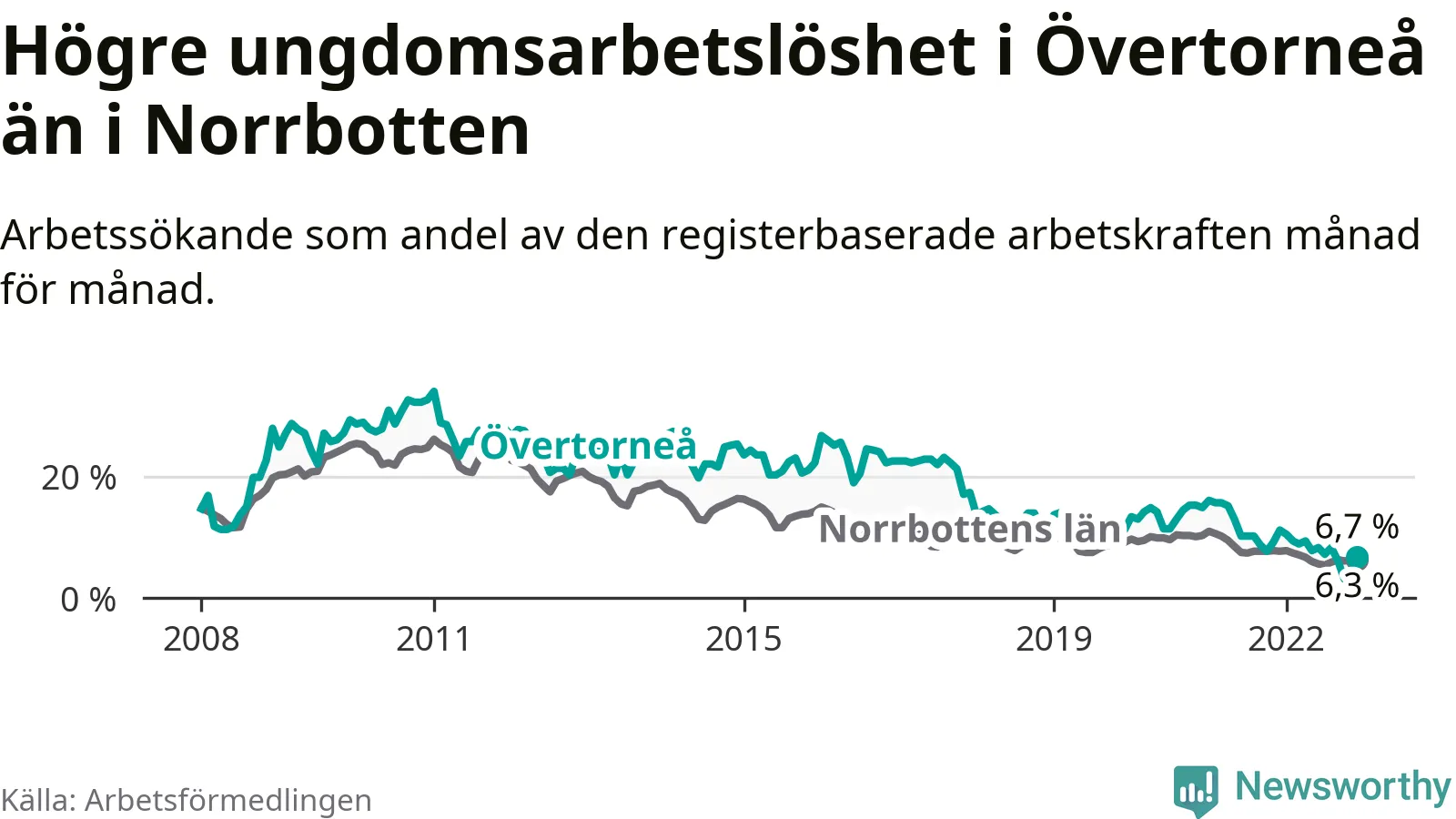 Precis som den totala arbetslösheten ligger ungdomsarbetslösheten i Övertorneå högre än i Norrbotten som helhet. Skillnaden mellan kommunen och länet är 0,4 procentenheter.