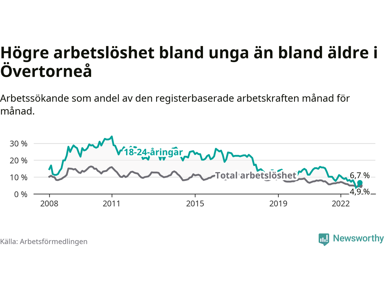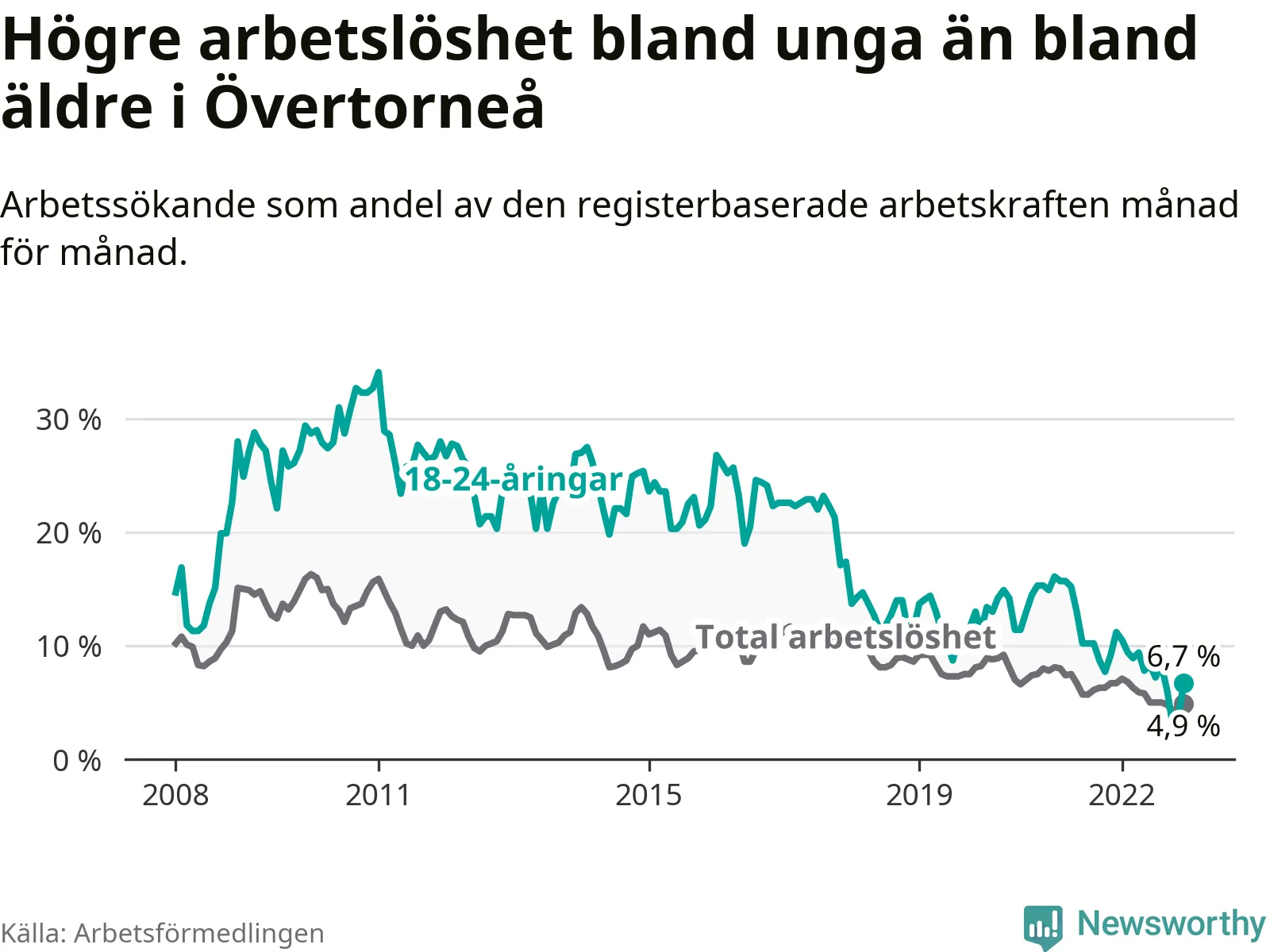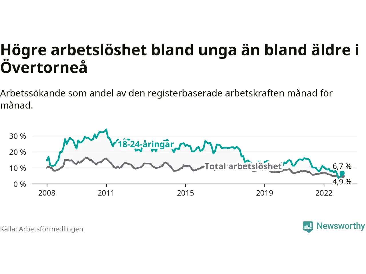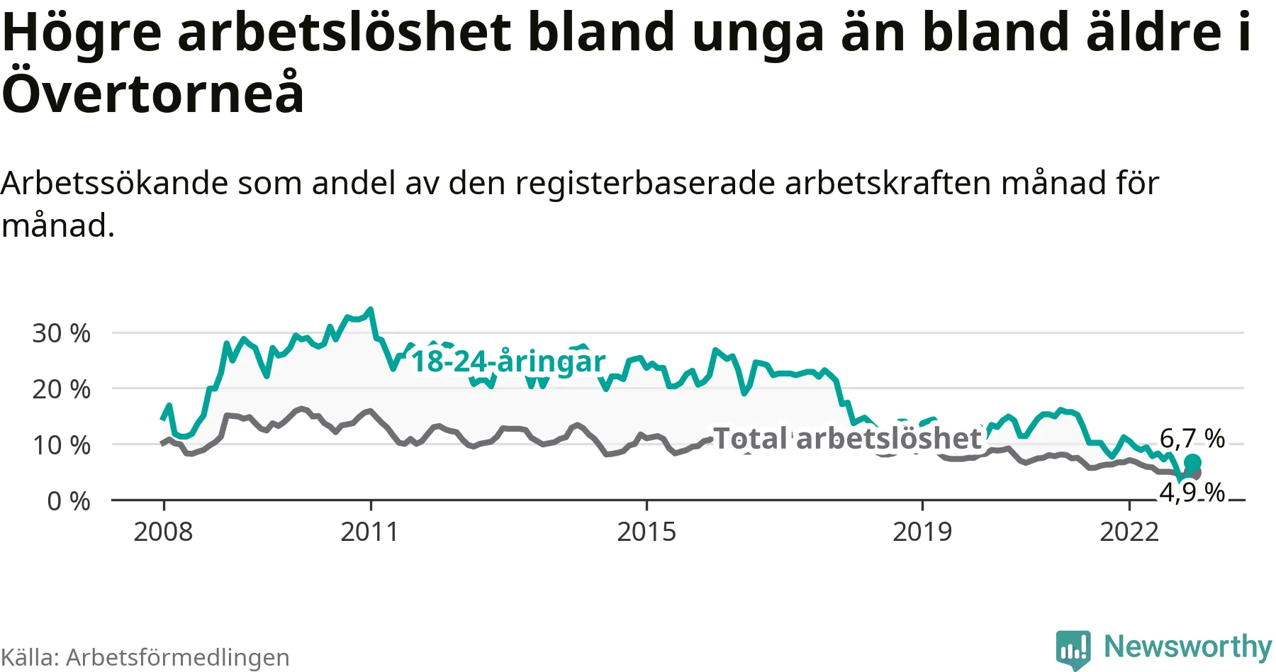 Precis som den totala arbetslösheten ligger ungdomsarbetslösheten i Övertorneå högre än i Norrbotten som helhet. Skillnaden mellan kommunen och länet är 0,4 procentenheter.