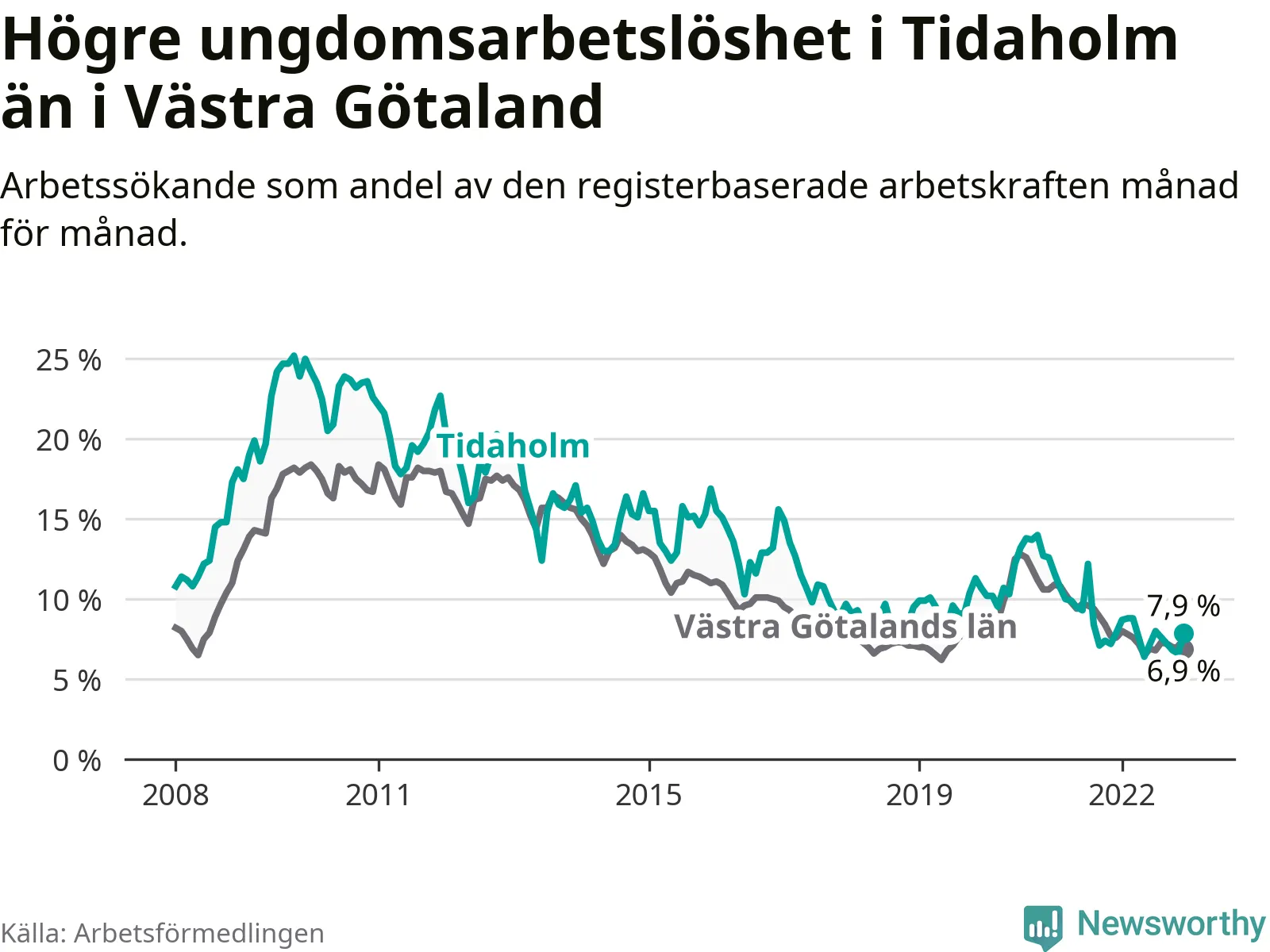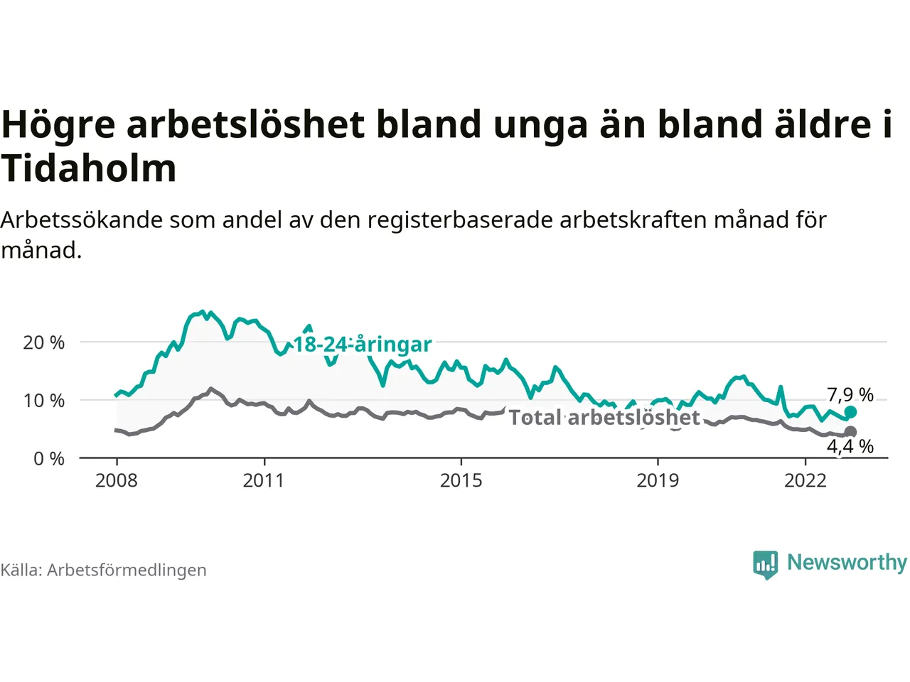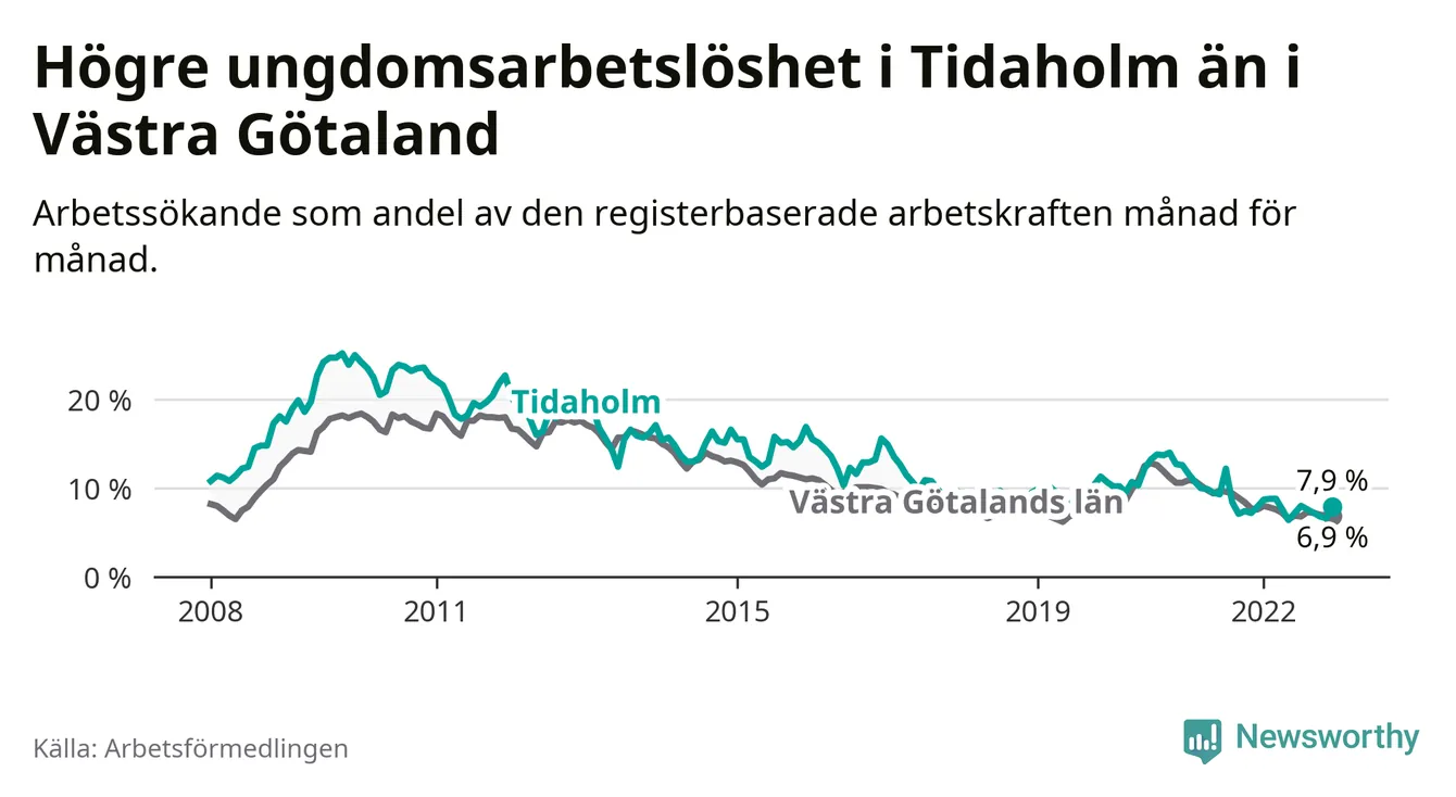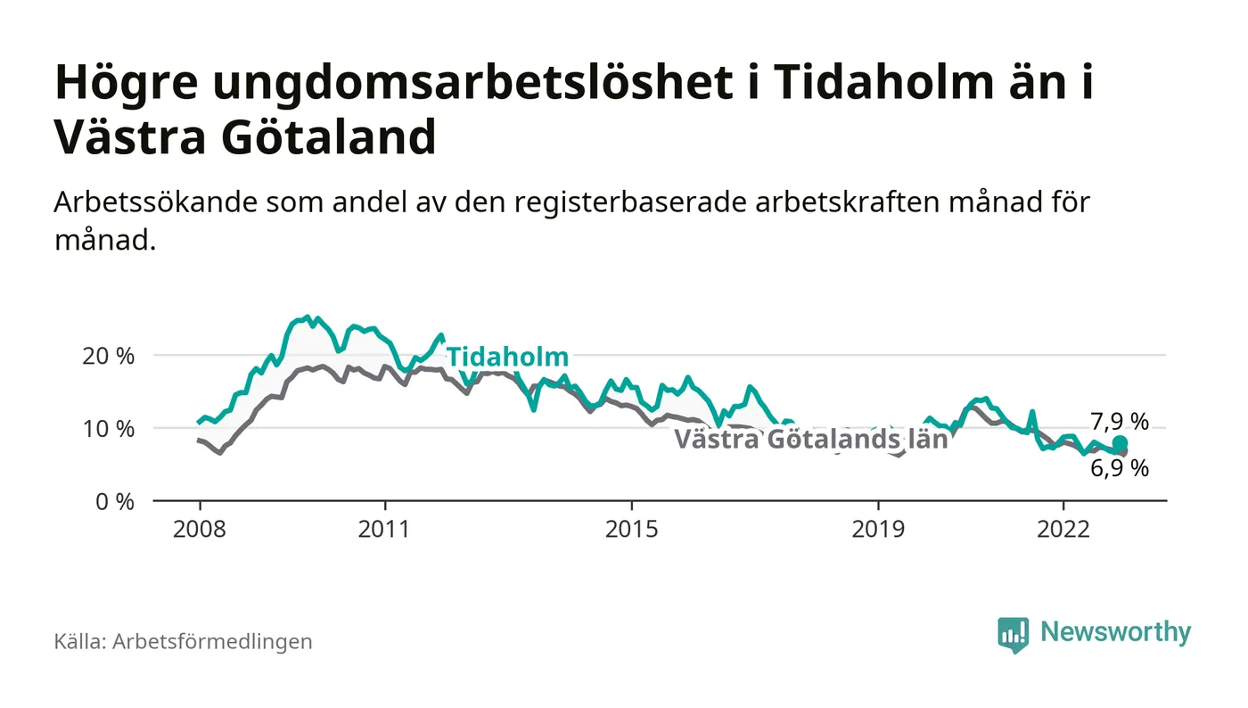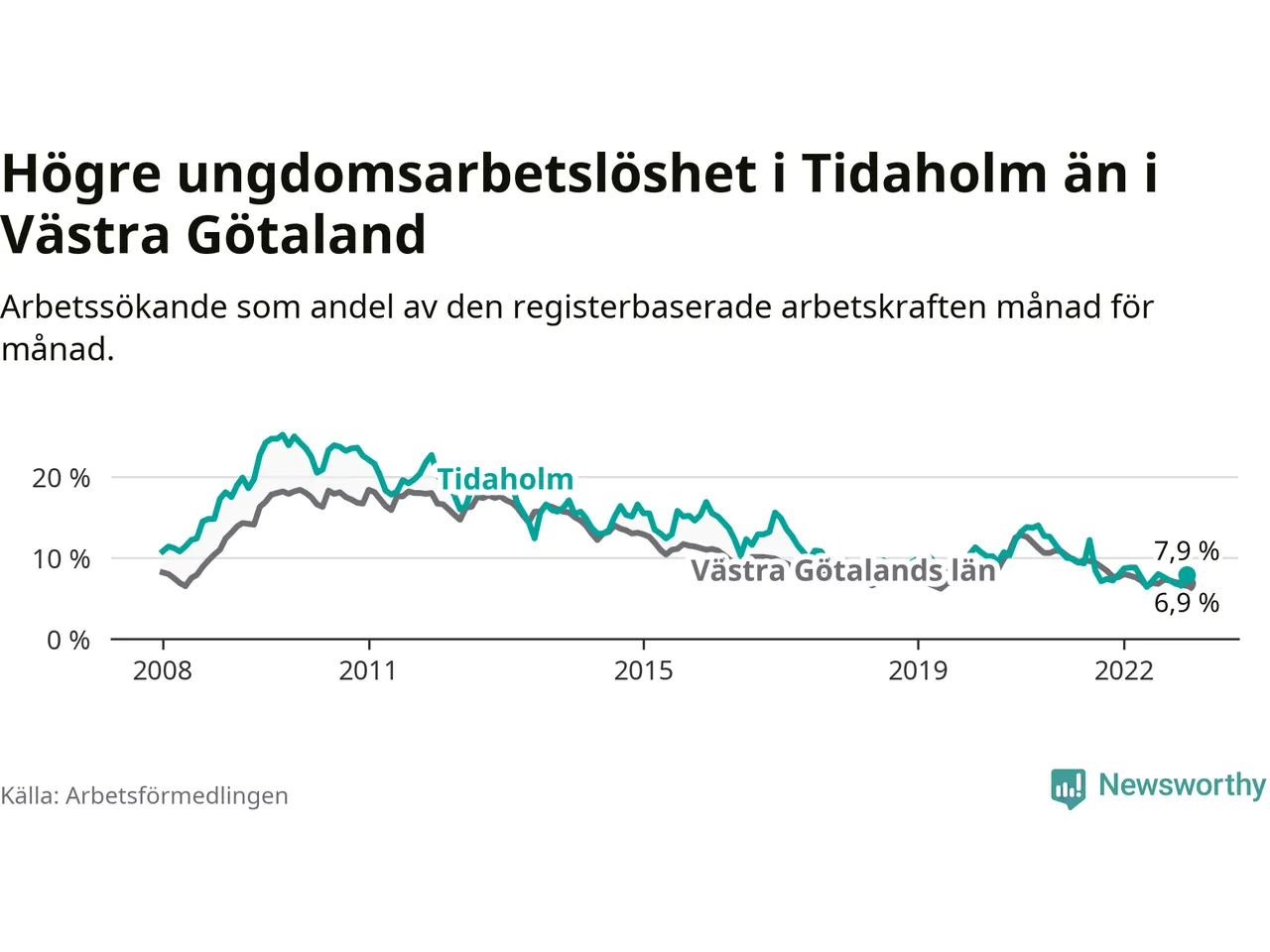 Medan Tidaholm har lägre total arbetslöshet än Västra Götaland, ligger ungdomsarbetslösheten 1,0 procentenheter högre i Tidaholm.