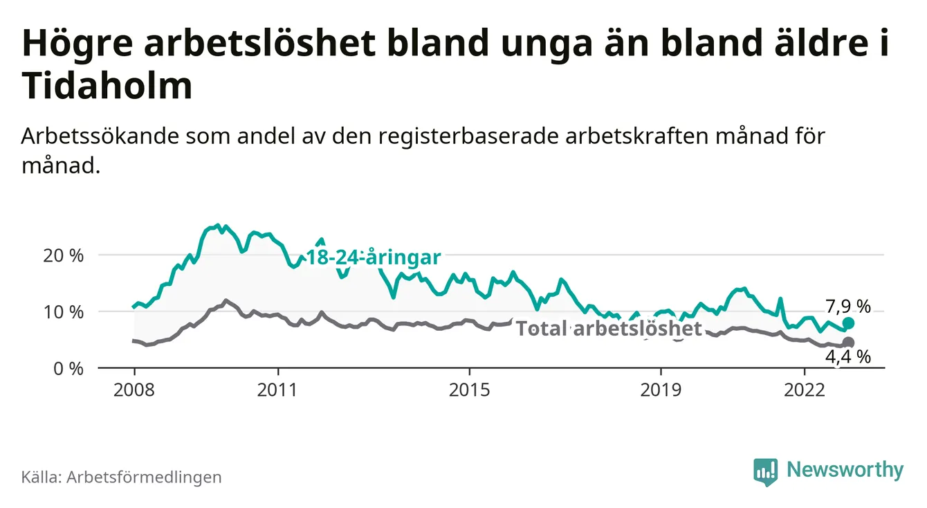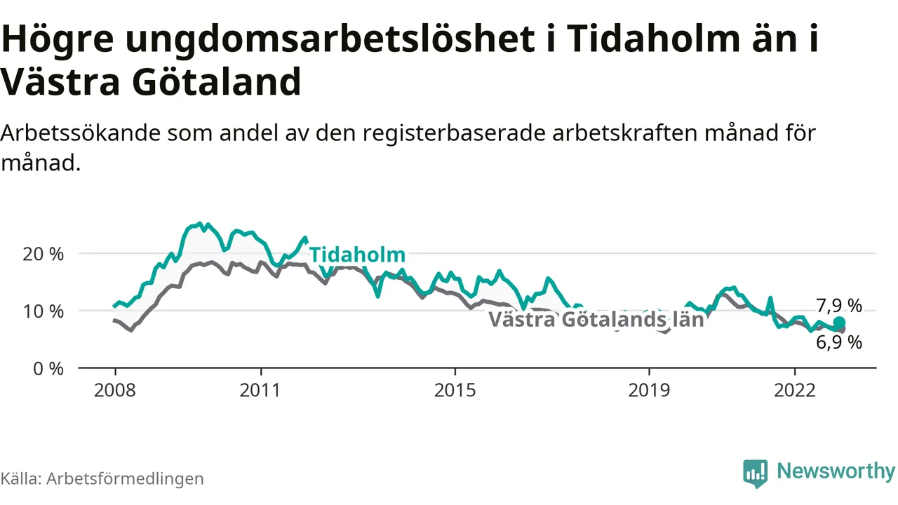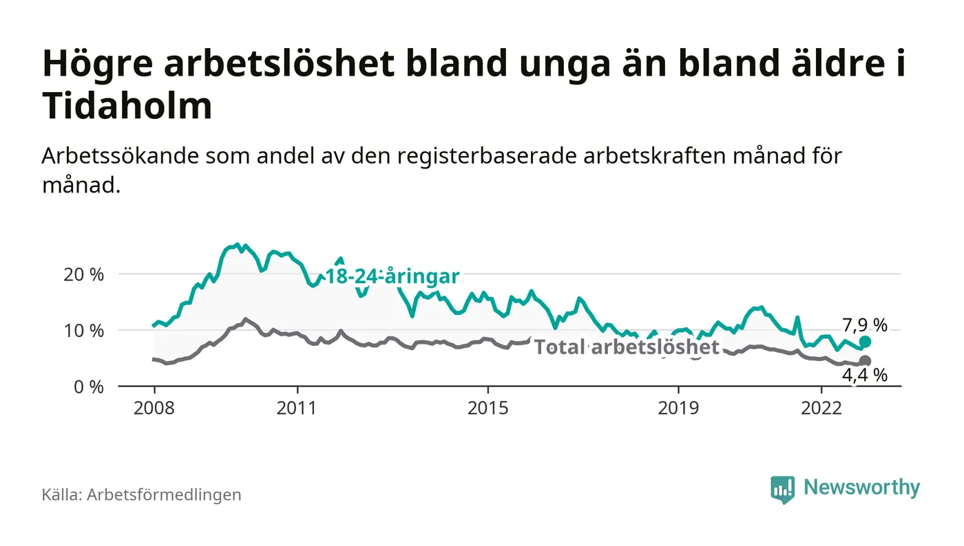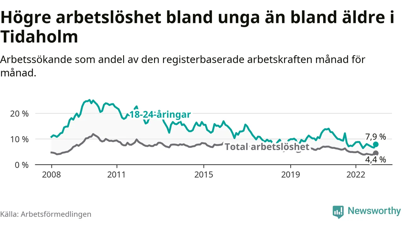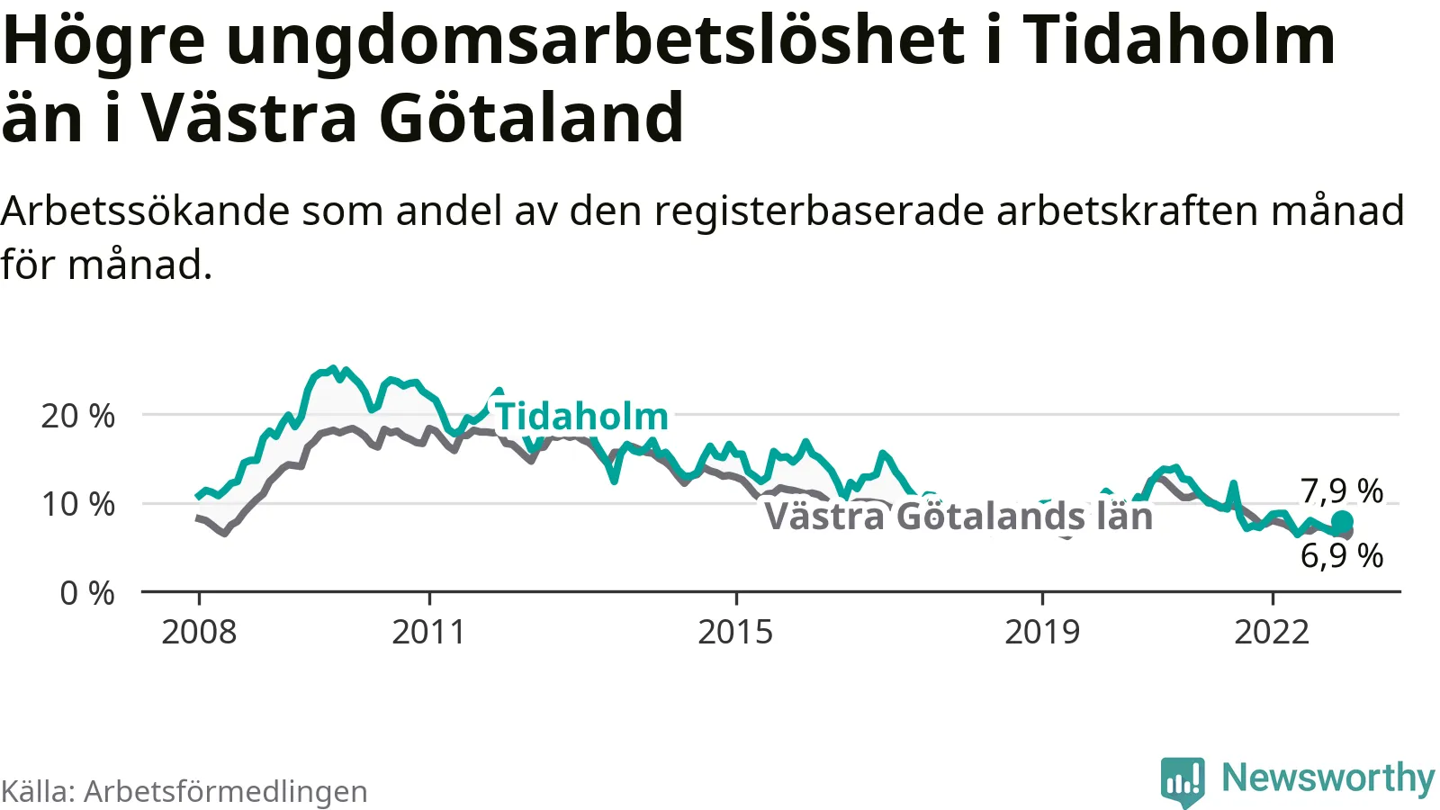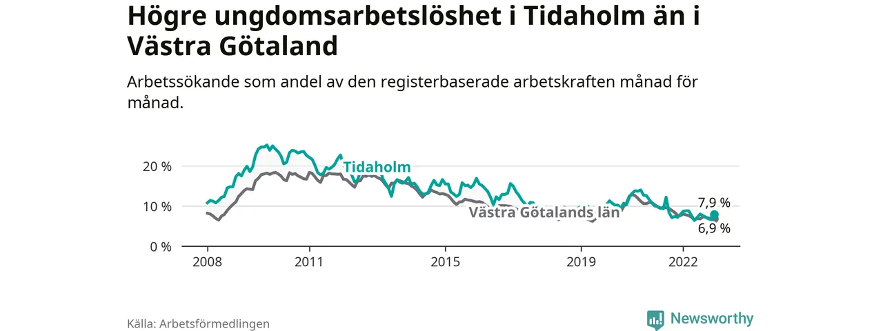 Medan Tidaholm har lägre total arbetslöshet än Västra Götaland, ligger ungdomsarbetslösheten 1,0 procentenheter högre i Tidaholm.