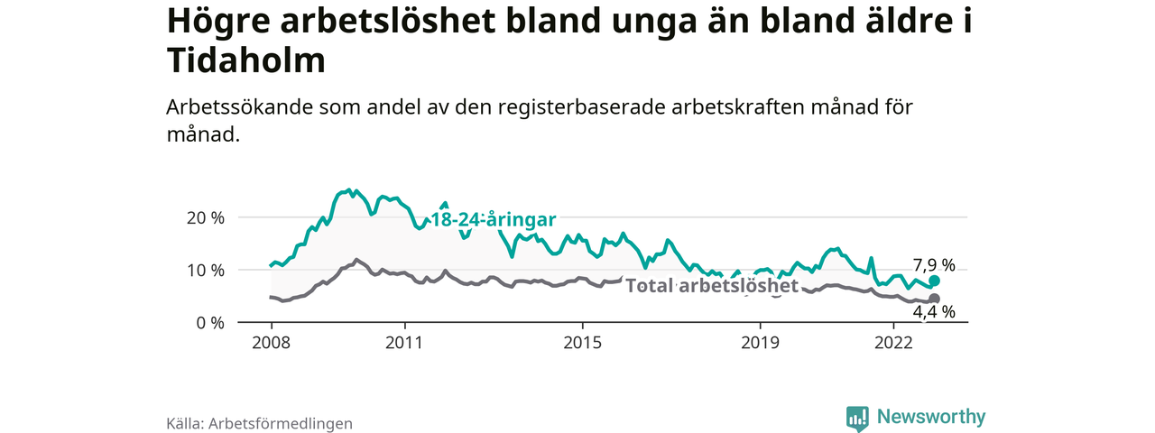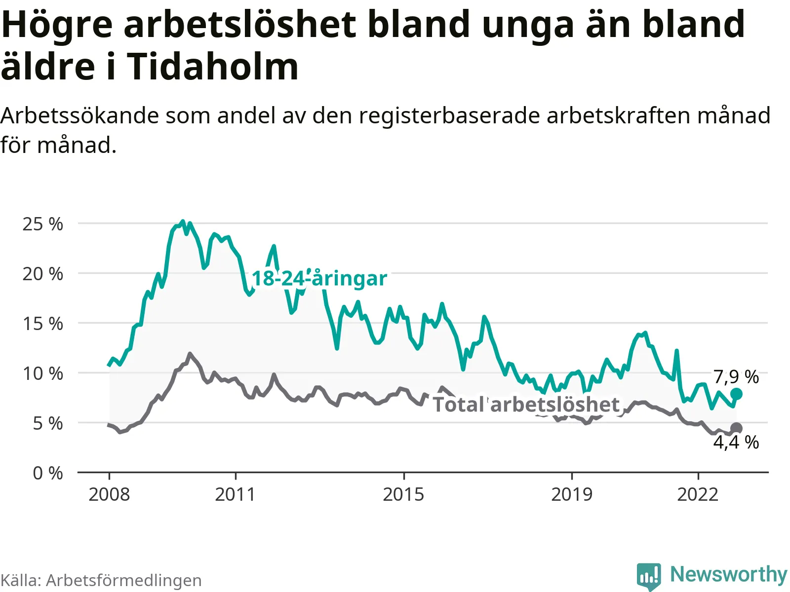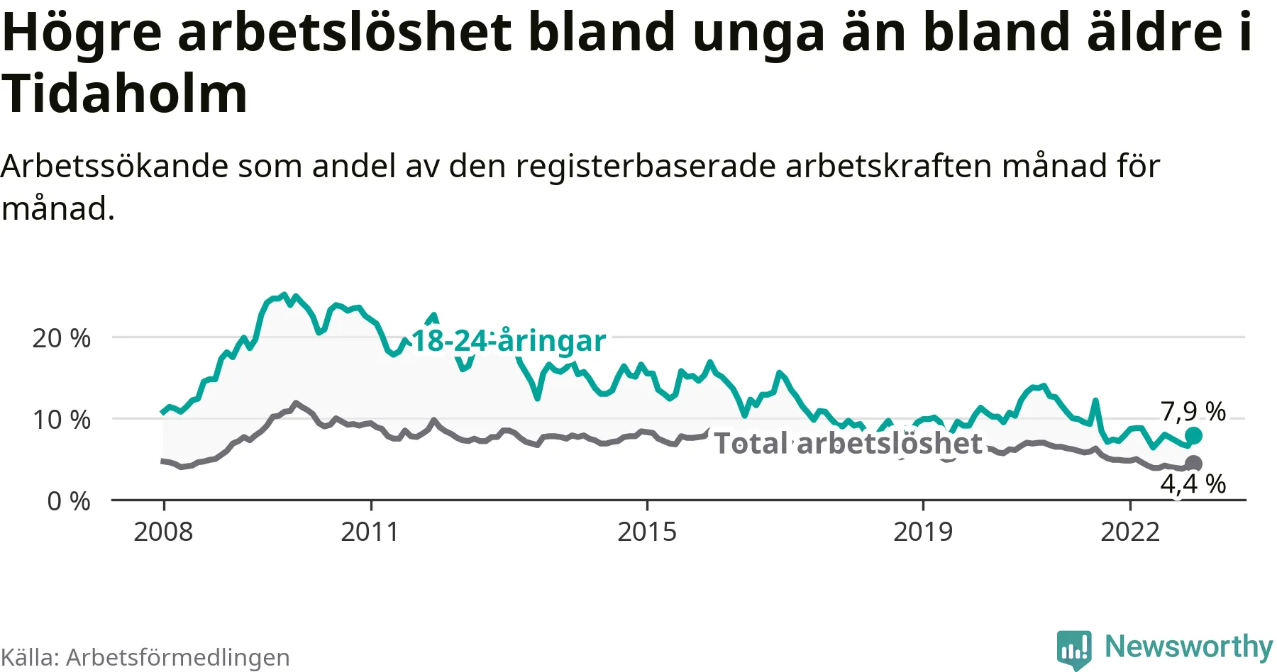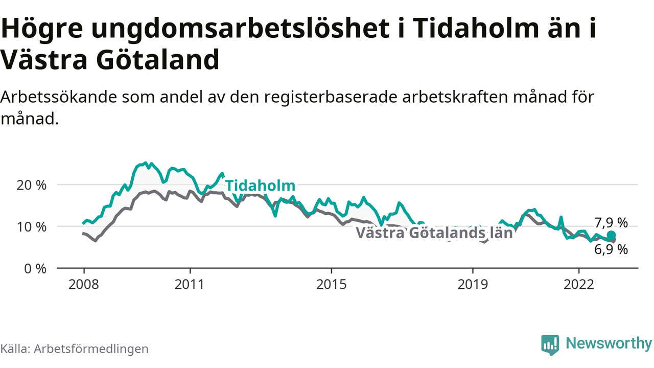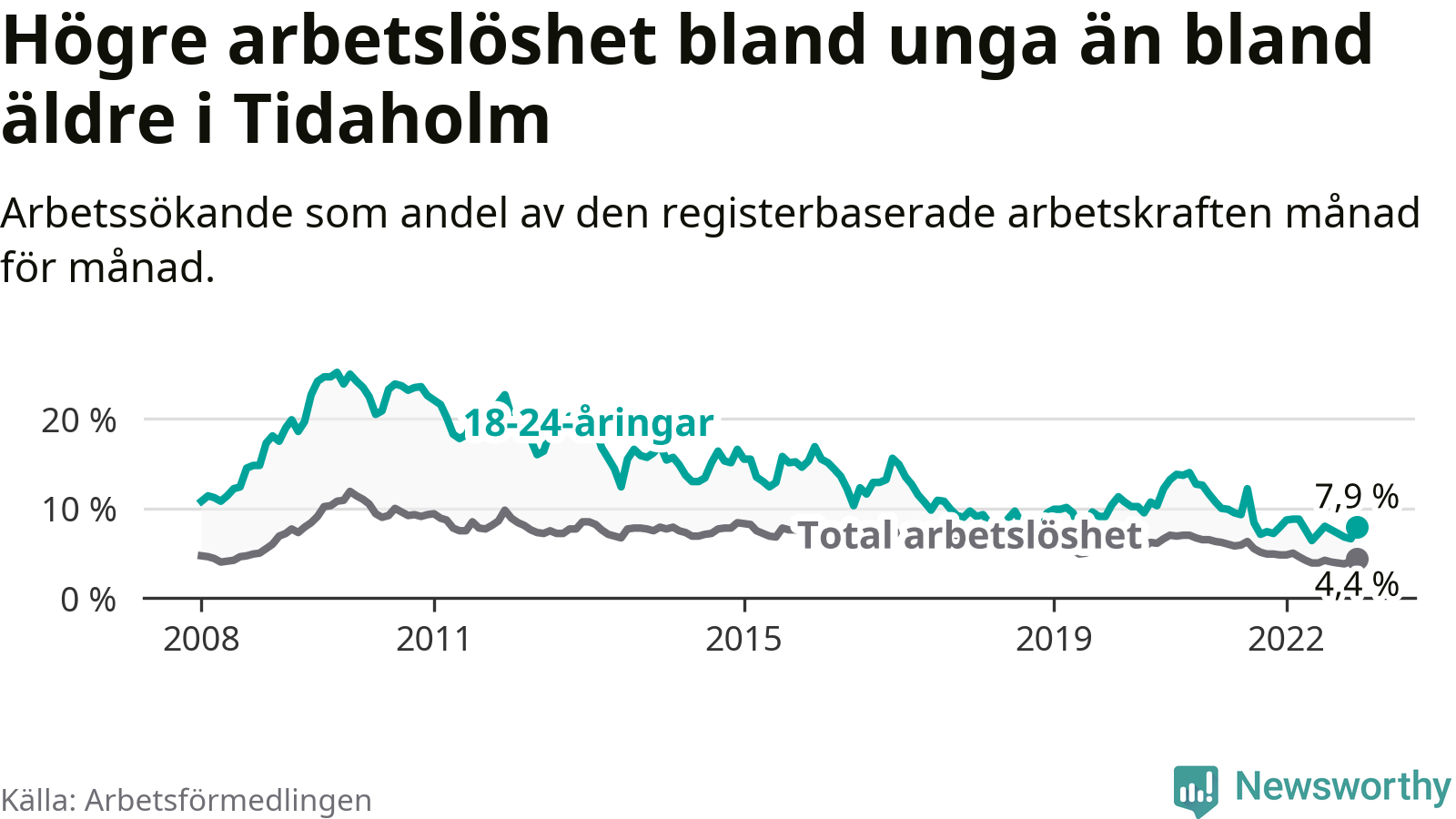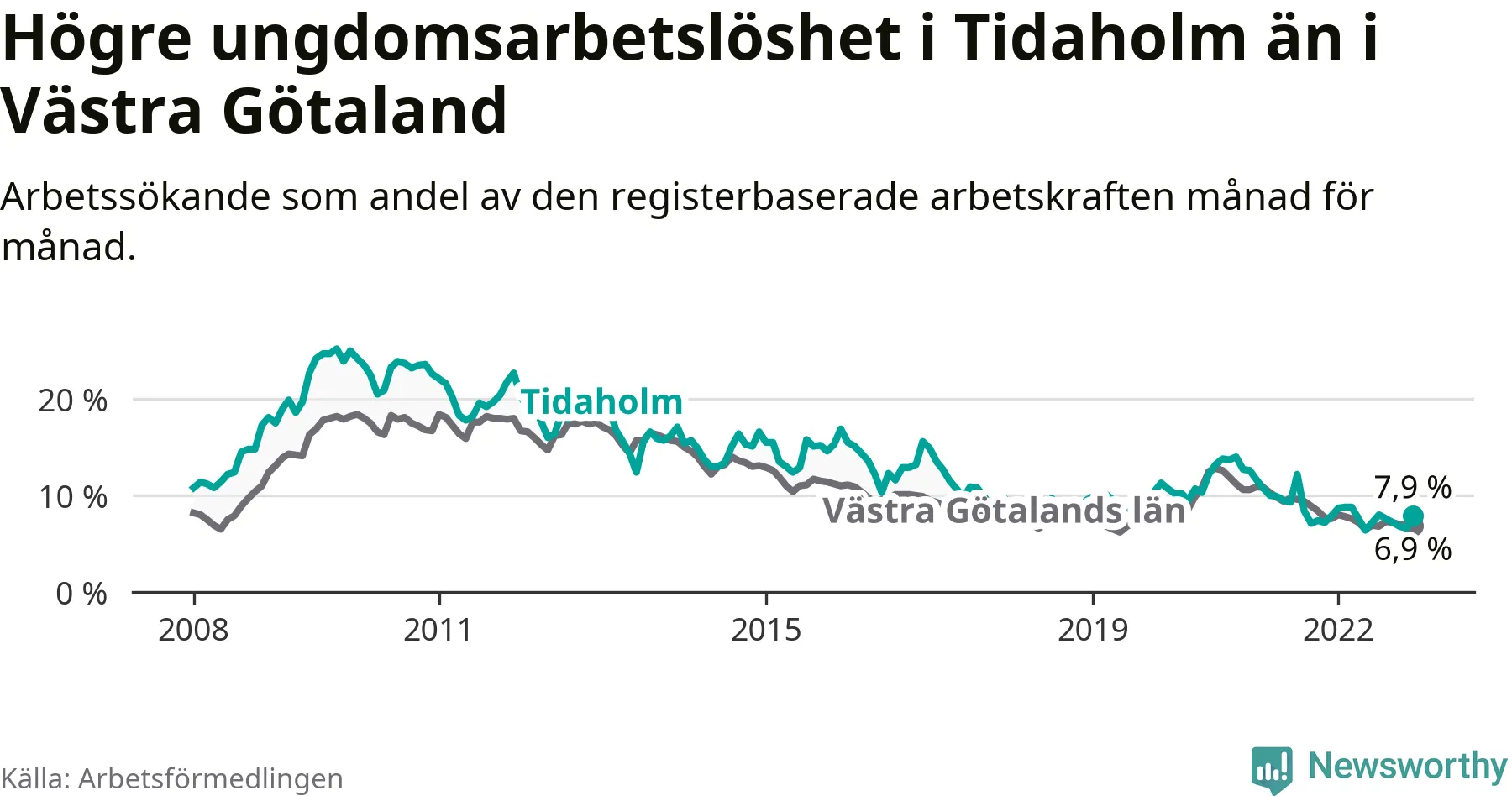 Medan Tidaholm har lägre total arbetslöshet än Västra Götaland, ligger ungdomsarbetslösheten 1,0 procentenheter högre i Tidaholm.