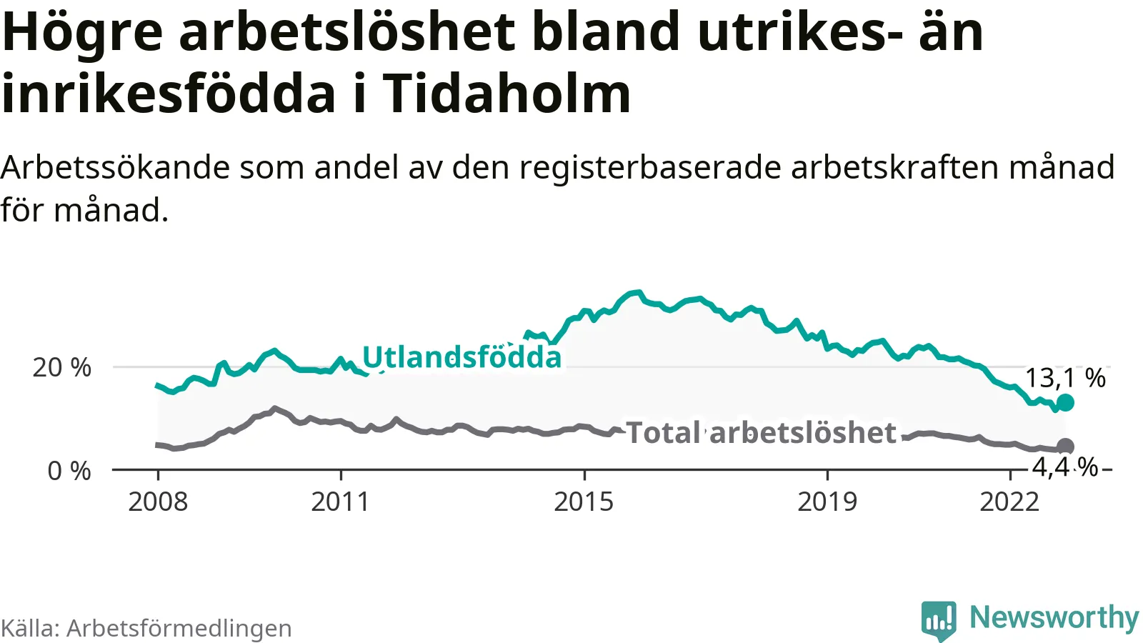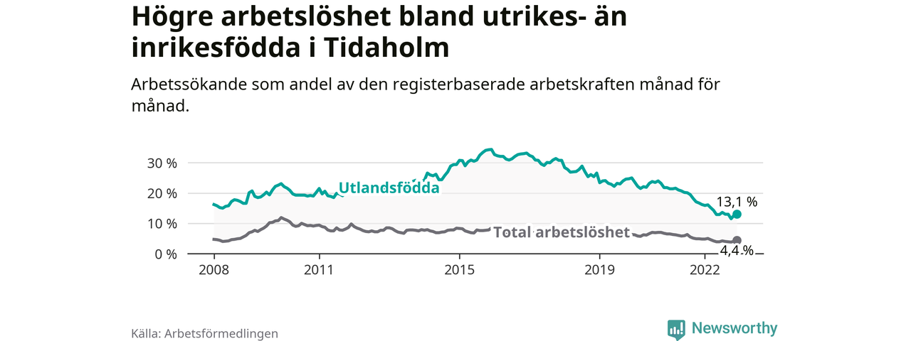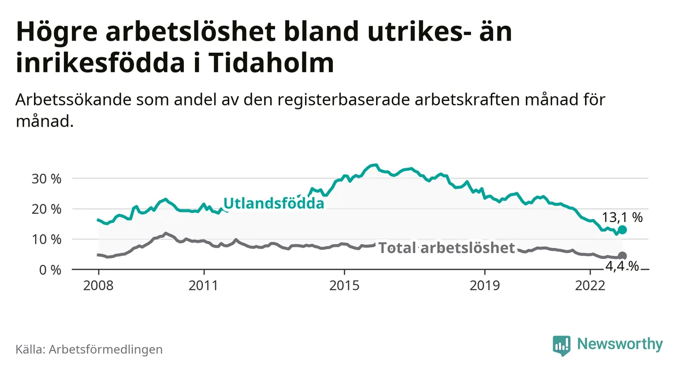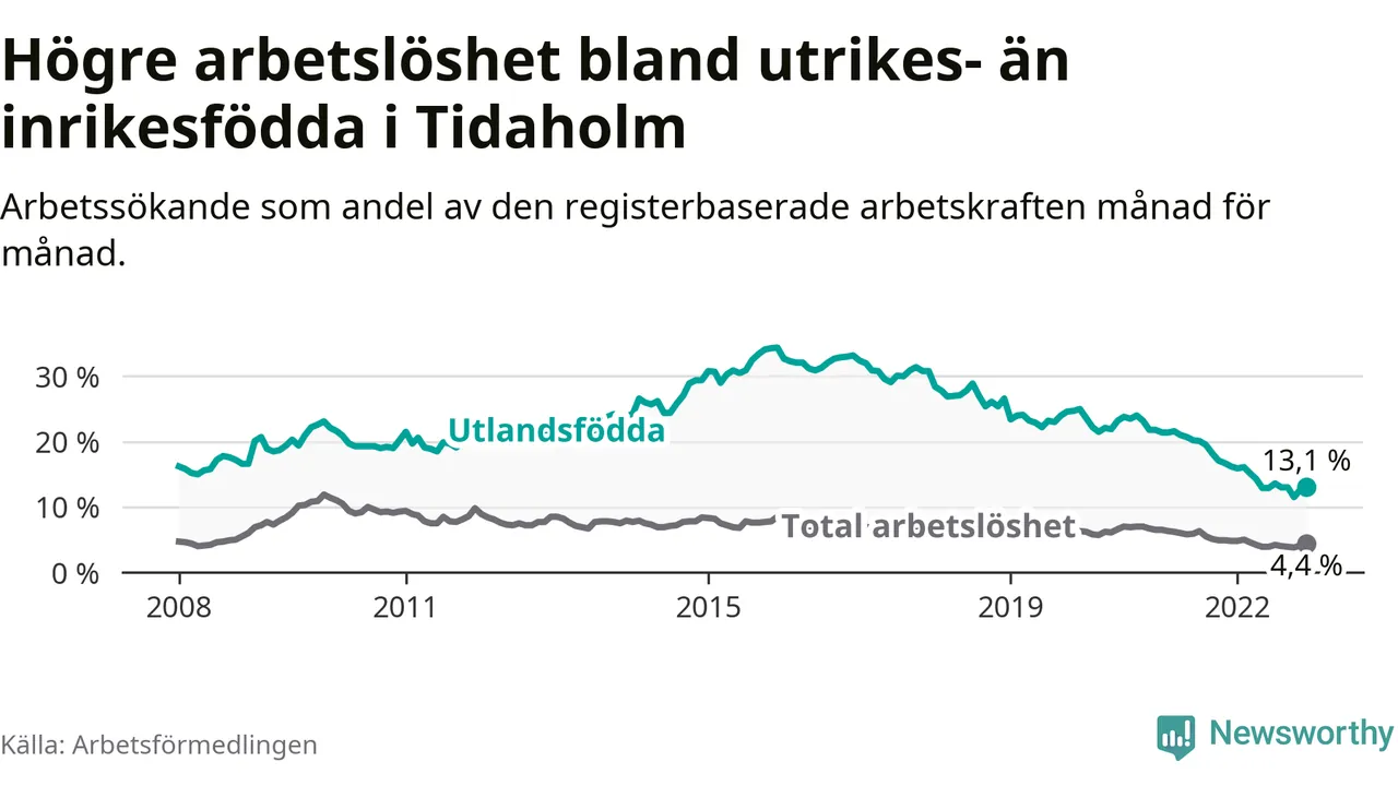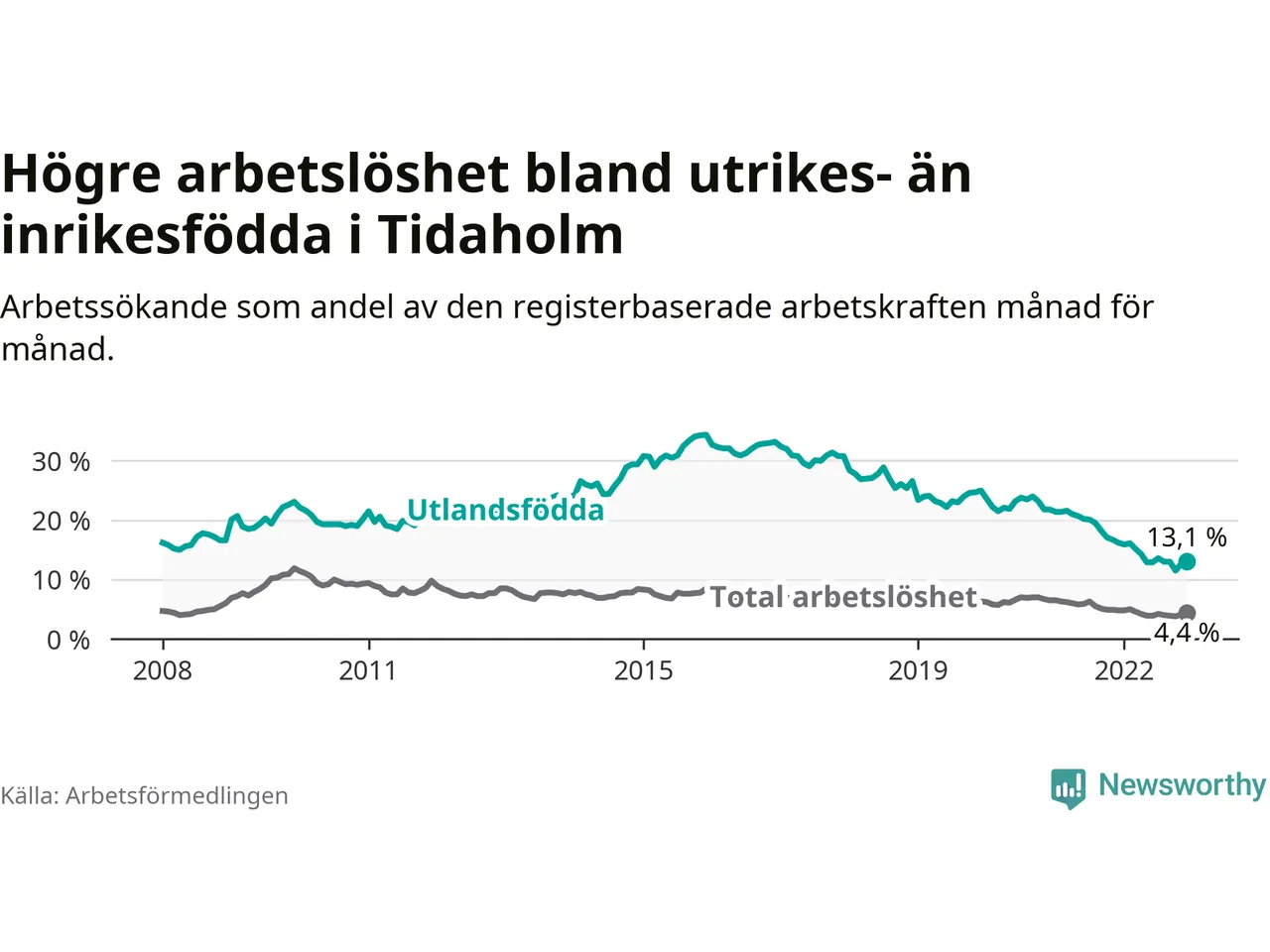 Skillnaden i arbetslöshet mellan utrikesfödda och hela befolkningen är 8,7 procentenheter i Tidaholm. Det är en betydligt mindre skillnad än för ett år sedan (−2,7 procentenheter).