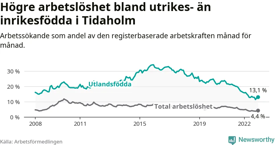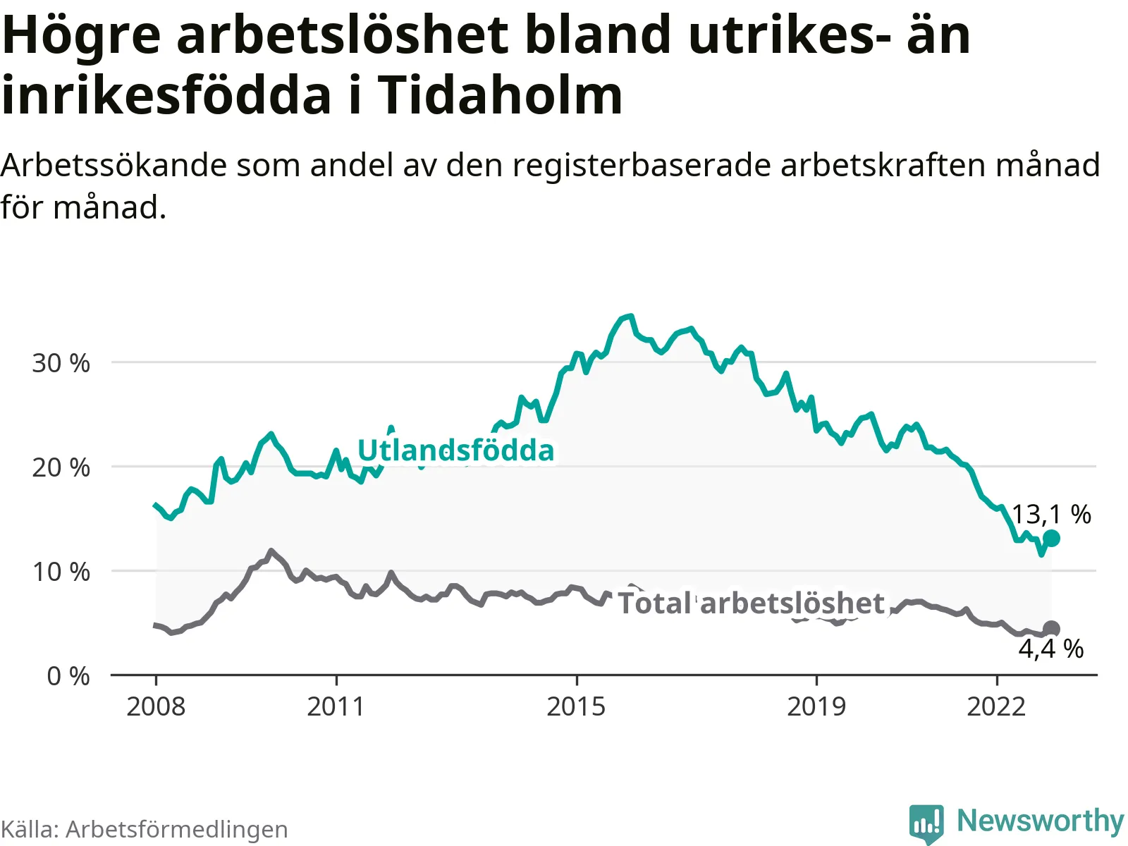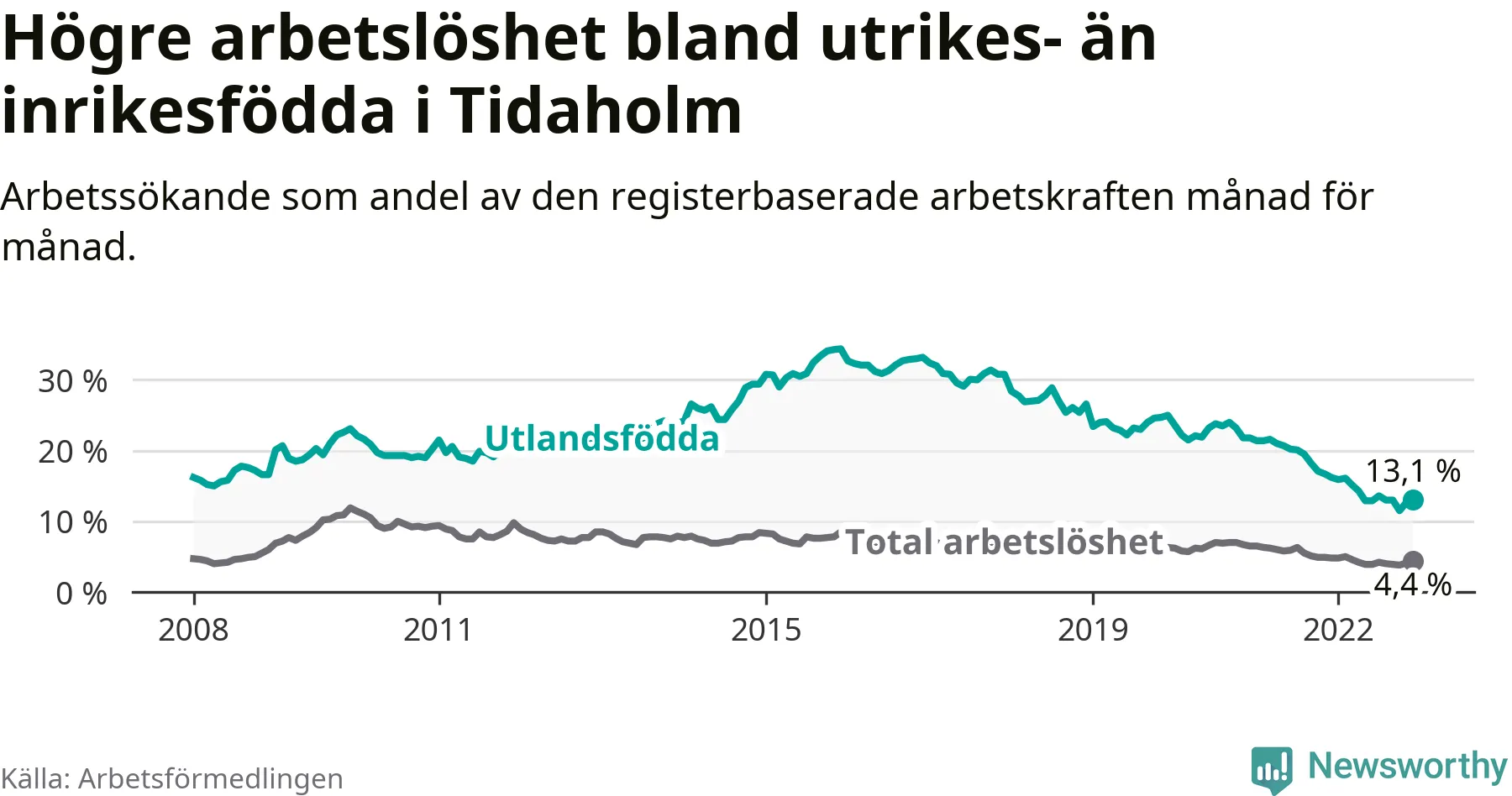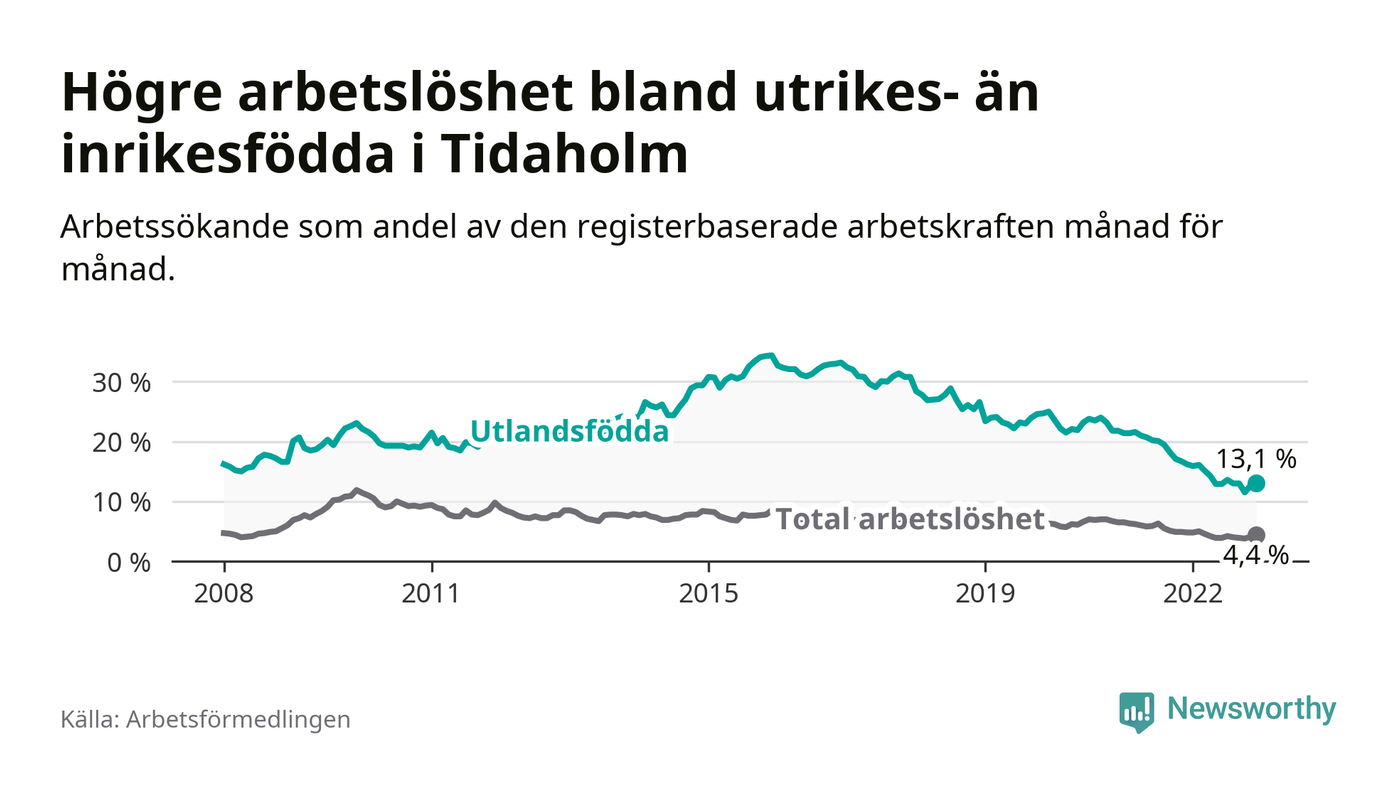 Skillnaden i arbetslöshet mellan utrikesfödda och hela befolkningen är 8,7 procentenheter i Tidaholm. Det är en betydligt mindre skillnad än för ett år sedan (−2,7 procentenheter).