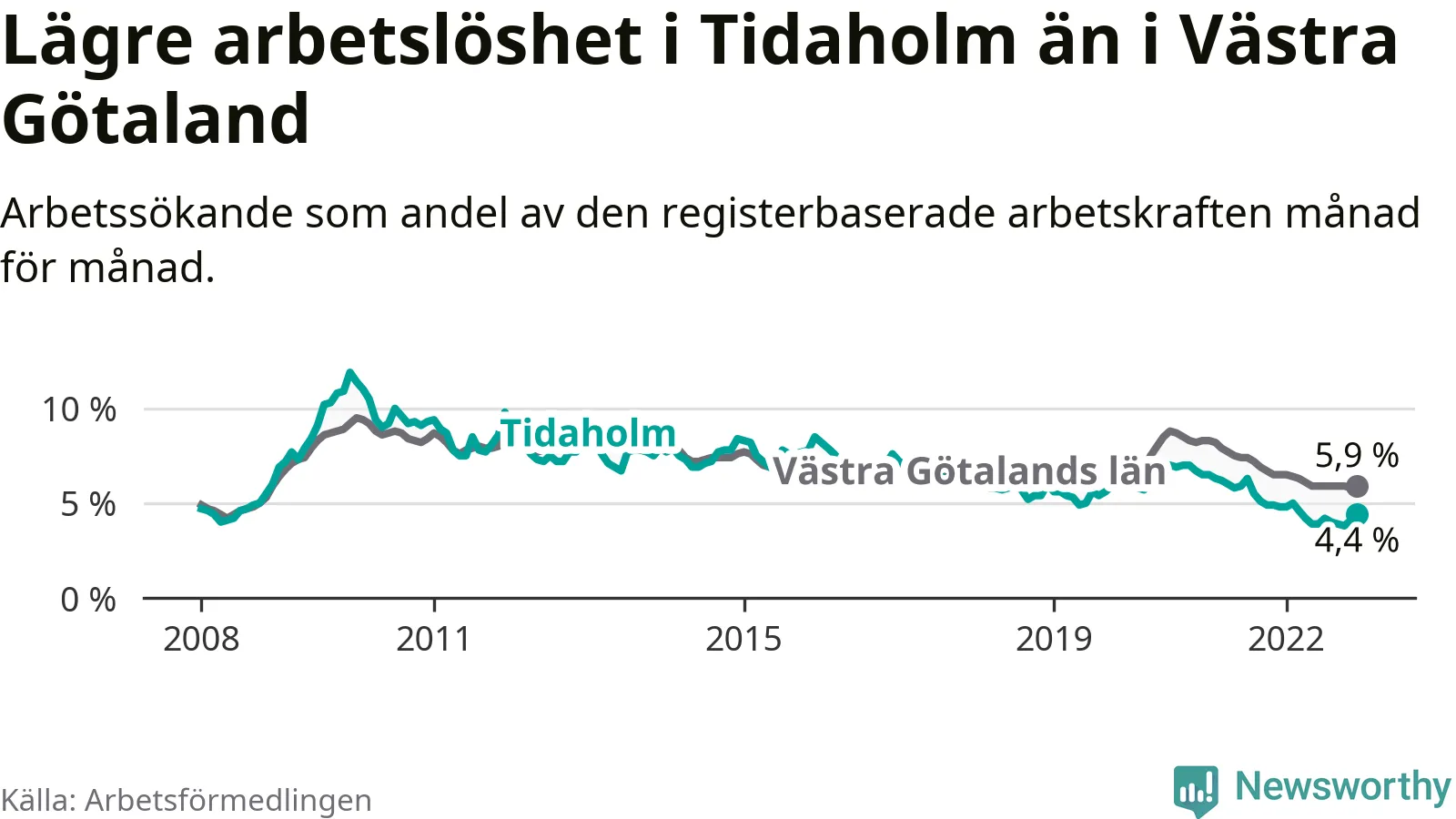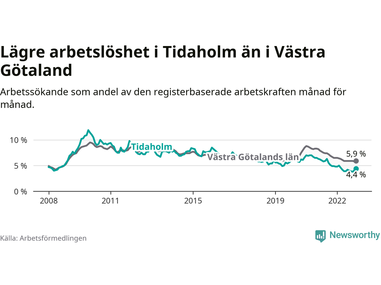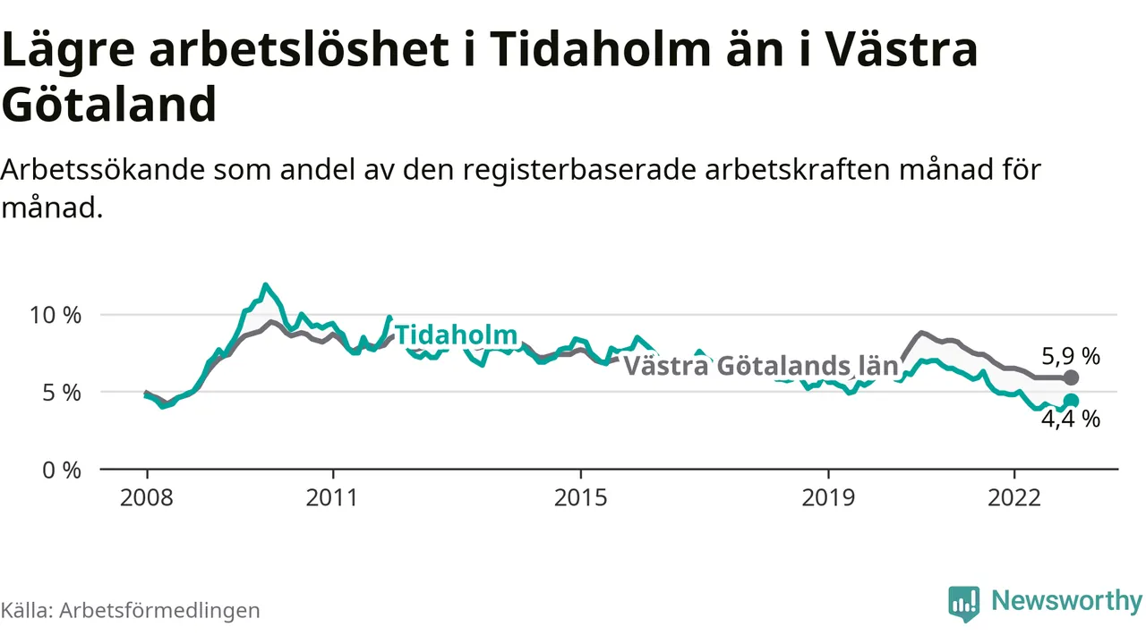 Tidaholm hade redan tidigare lägre arbetslöshet än snittet i hela Västra Götalands län och nu växer klyftan (4,4 procent i kommunen, jämfört med 5,9 procent i hela länet). Tjörn och Öckerö har den lägsta arbetslösheten i länet (2,6 procent), medan Trollhättan har den högsta (9,1 procent). För att Tidaholm skulle komma ner i samma arbetslöshetsnivå som Tjörn och Öckerö skulle 108 personer behöva sysselsättas.