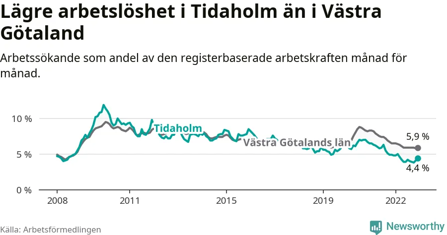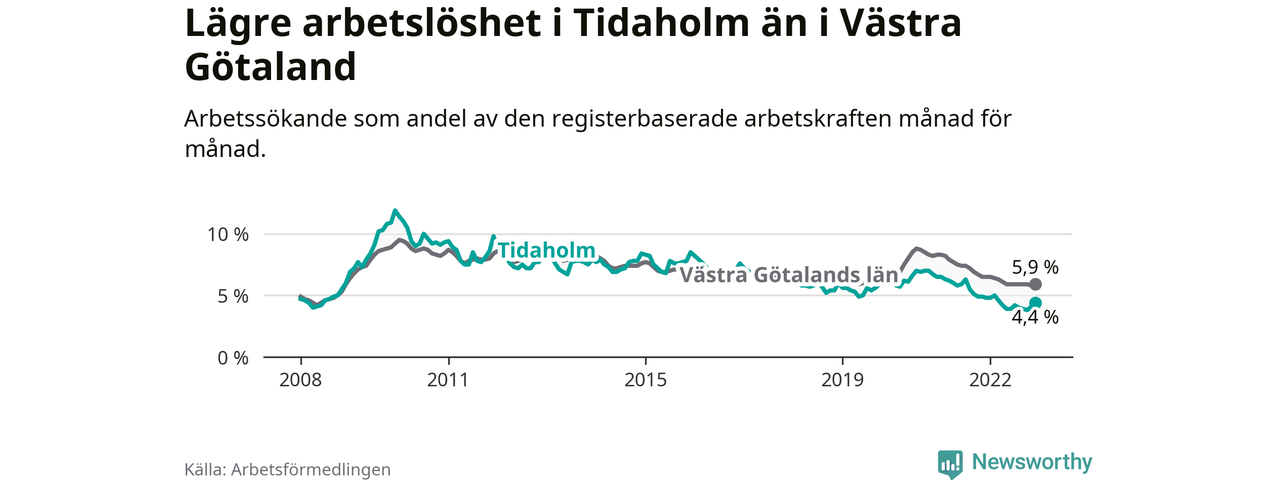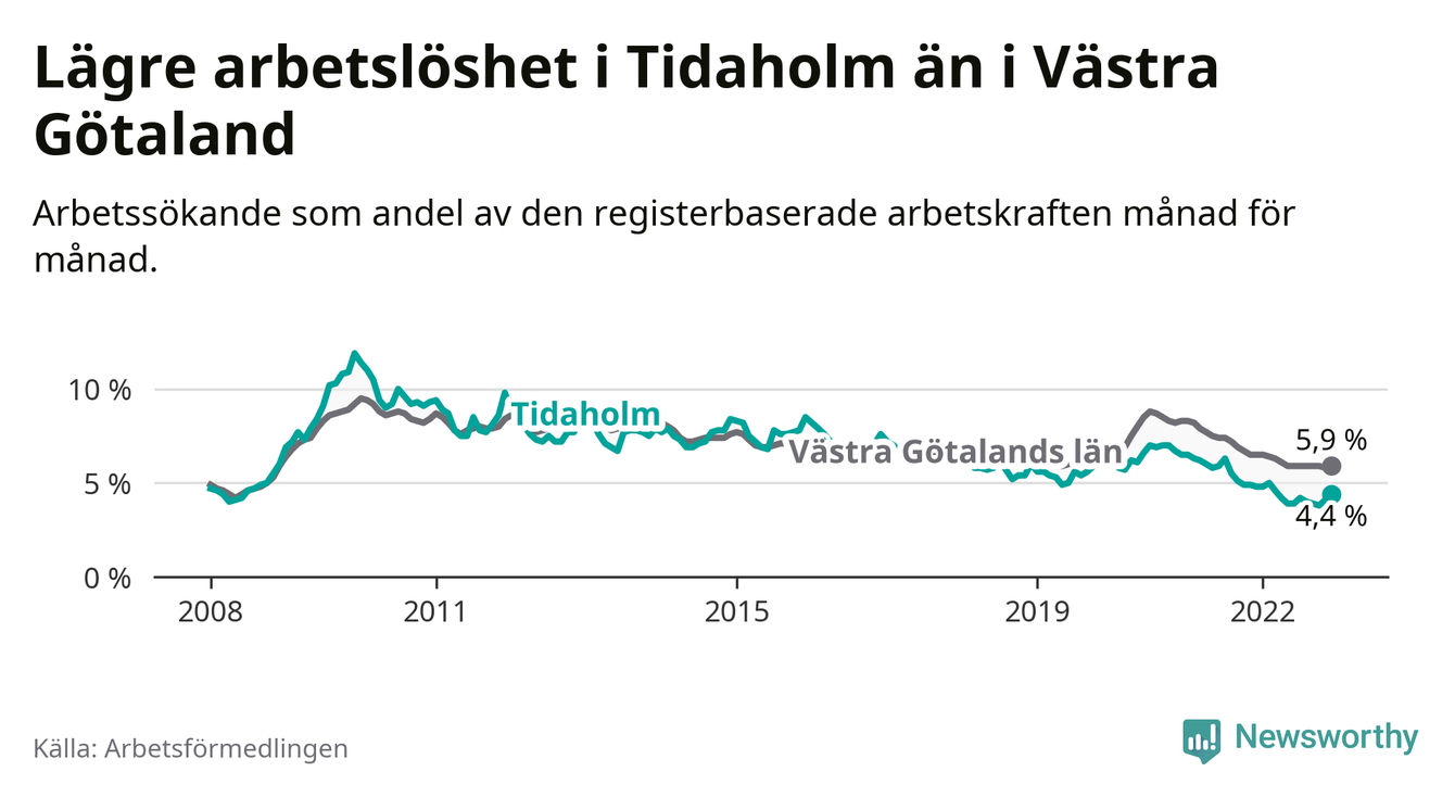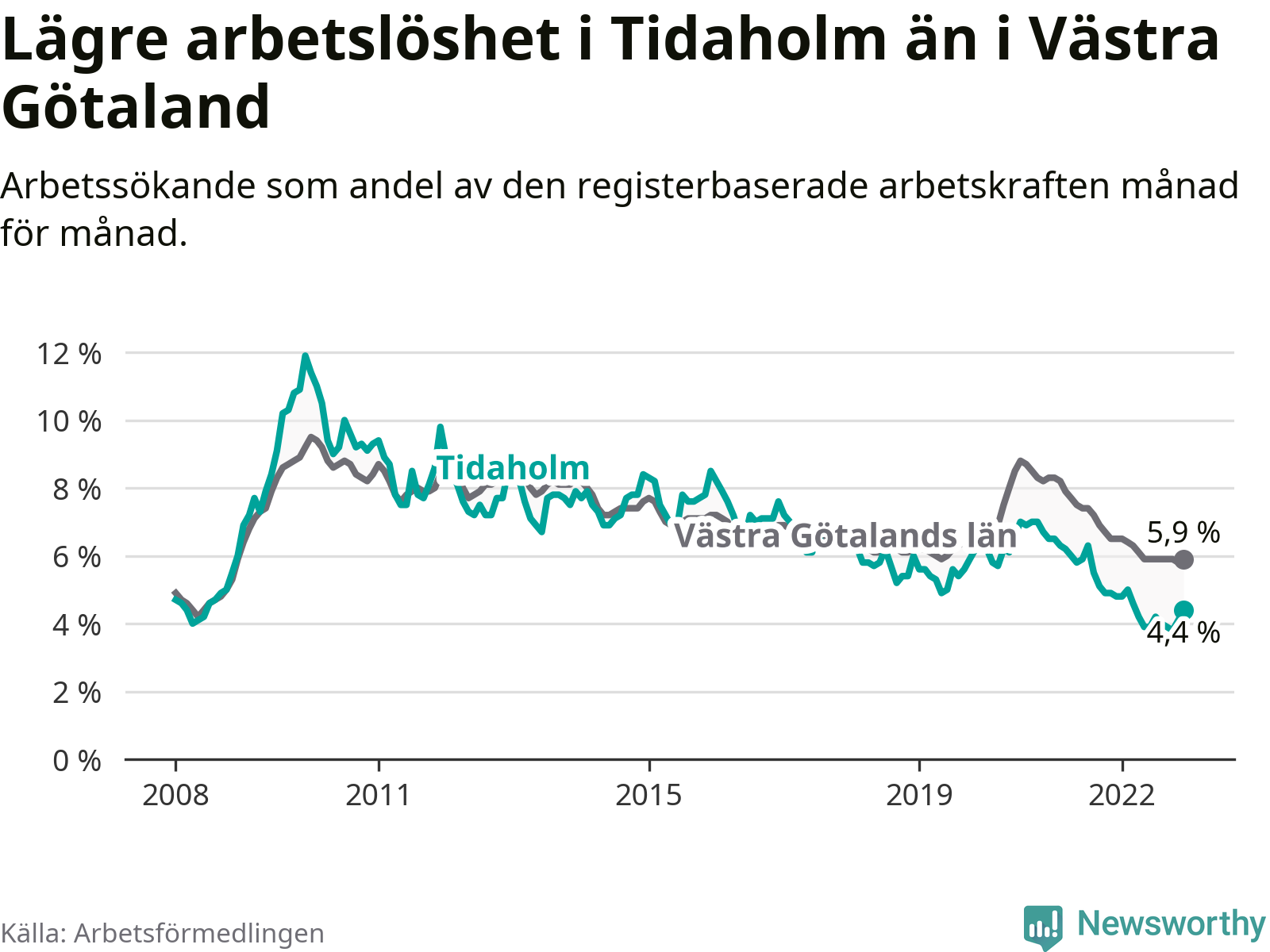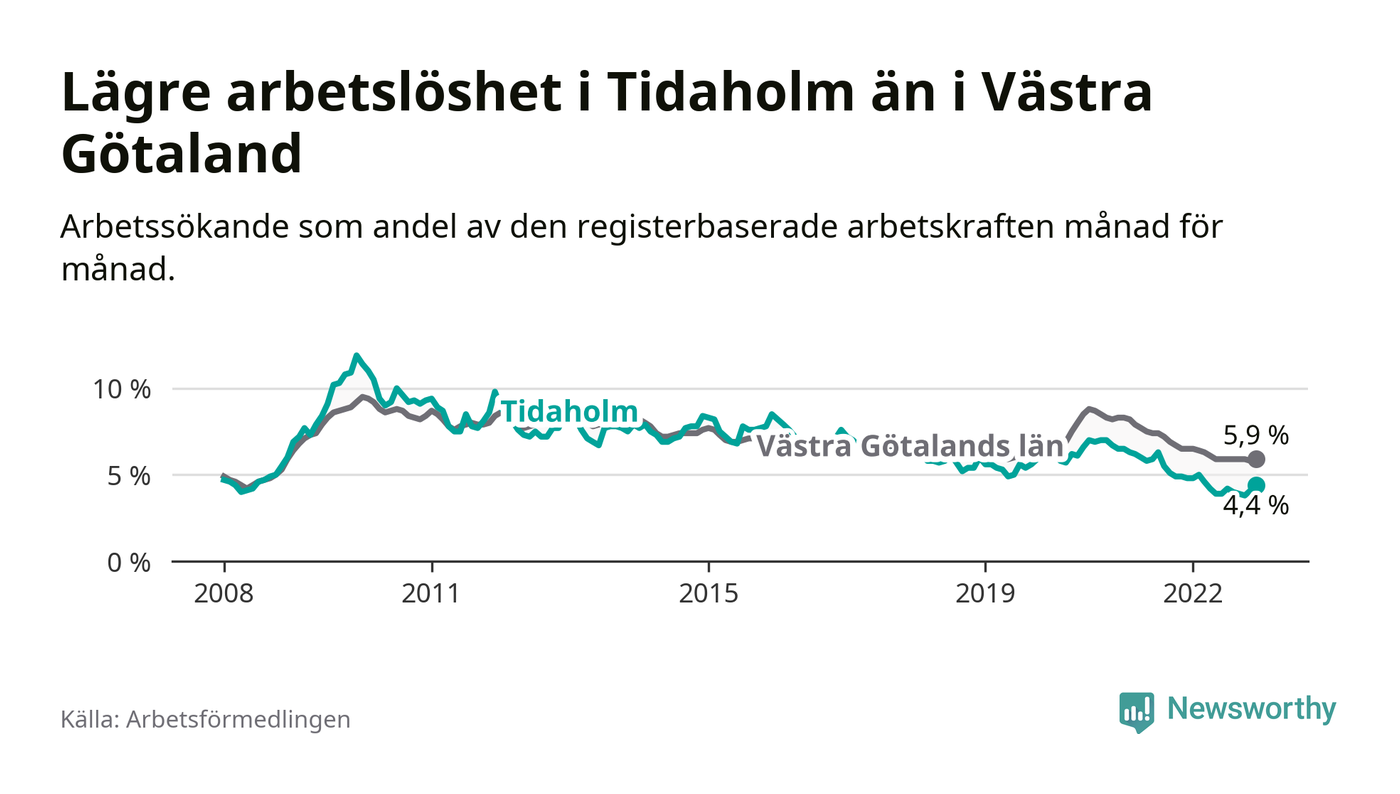Tidaholm hade redan tidigare lägre arbetslöshet än snittet i hela Västra Götalands län och nu växer klyftan (4,4 procent i kommunen, jämfört med 5,9 procent i hela länet). Tjörn och Öckerö har den lägsta arbetslösheten i länet (2,6 procent), medan Trollhättan har den högsta (9,1 procent). För att Tidaholm skulle komma ner i samma arbetslöshetsnivå som Tjörn och Öckerö skulle 108 personer behöva sysselsättas.
