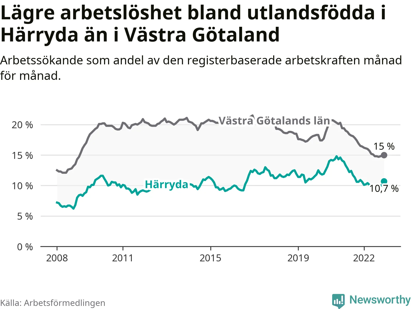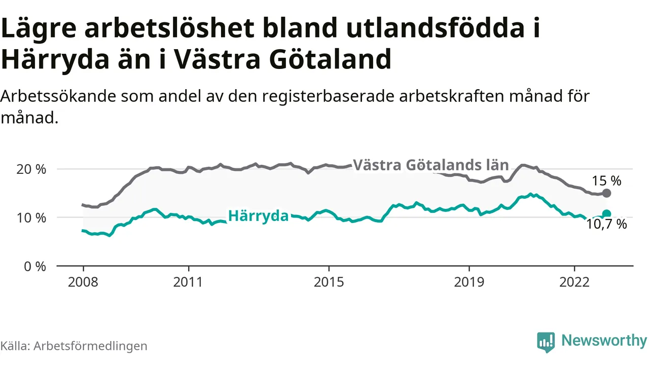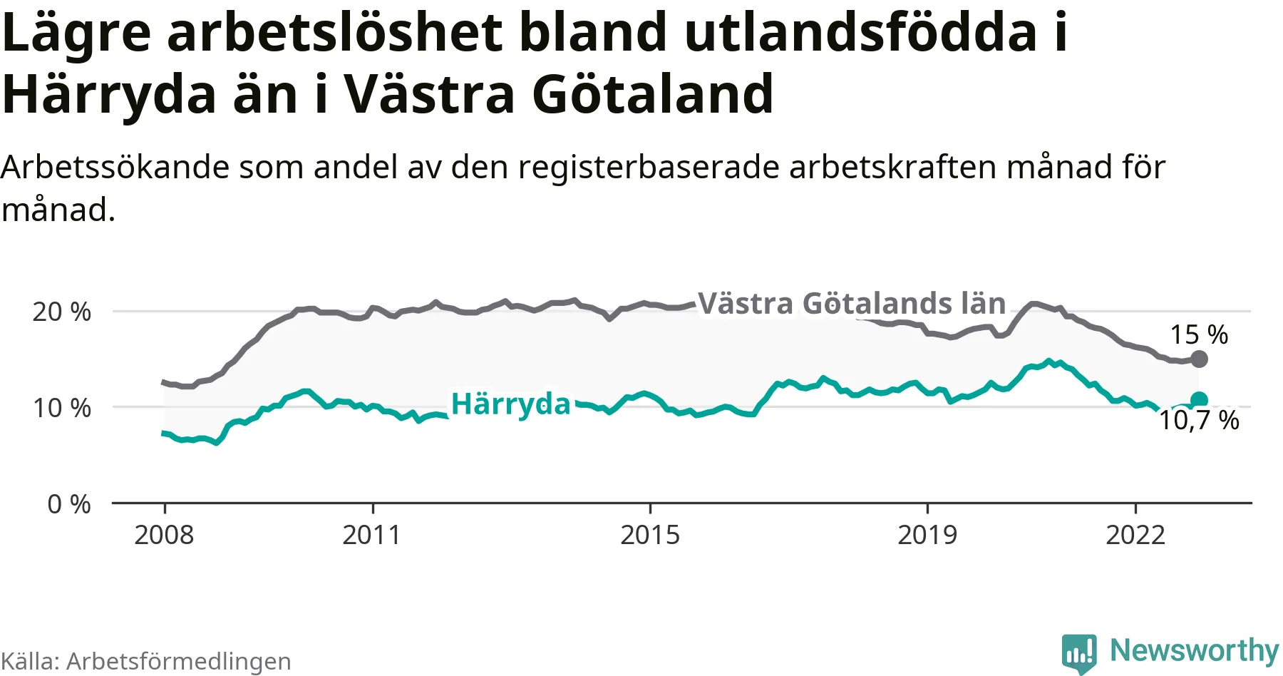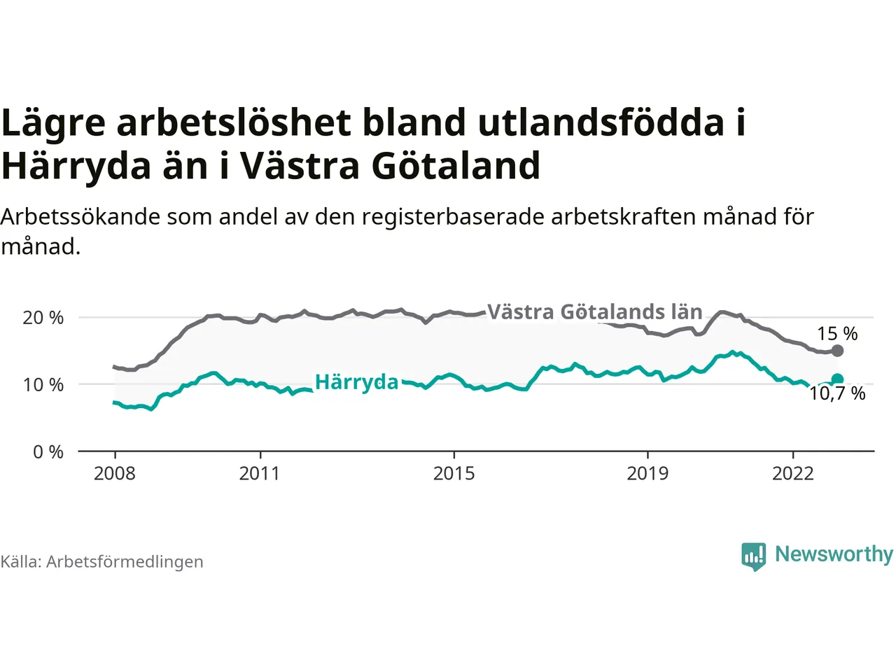 Medan arbetslösheten bland utlandsfödda alltså ökar i Härryda så minskar den i Västra Götaland. Jämfört med december förra året har andelen arbetslösa utlandsfödda i länet minskat med 1,4 procentenheter (till 15,0 procent). Trots den senaste uppgången har Härryda med andra ord fortfarande lägre arbetslöshet bland utlandsfödda än Västra Götaland.